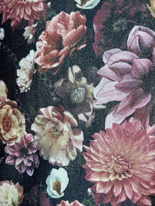 Romantic floral design print on metallic poly spandex 2-way stretch 58/60” Sold by the YD. Ships worldwide from Los Angeles California USA