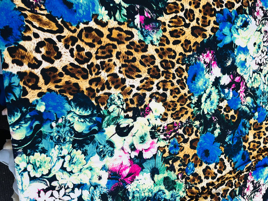 New Leopard design with flowers multicolor print on great quality of poly spandex 2-way stretch 58/60” Sold by the YD.