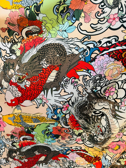 New Japanese Tattoo design print on poly Spandex light weight 2-way stretch 58/60”
