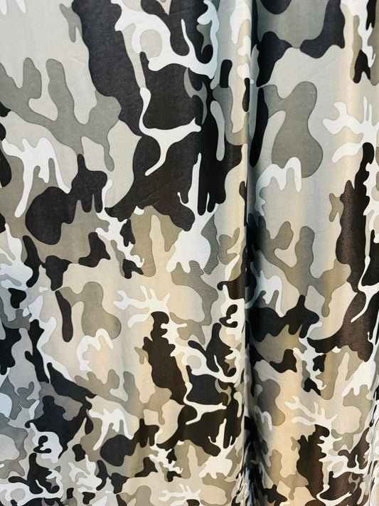 Camouflage design Gray/silver/black print on poly spandex 2-way stretch 58/60”