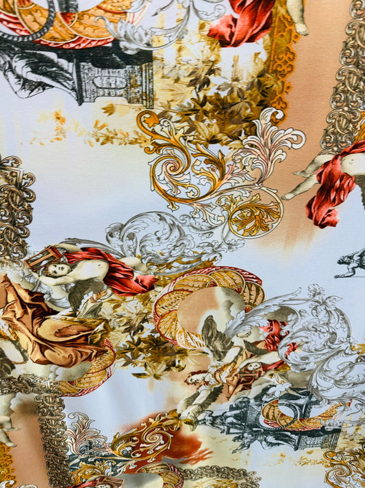 New celestial angels design print on poly spandex medium weight 2-way stretch 58/60”