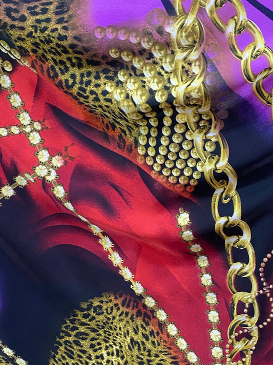New stretch satin Luxury gold chain design 2-way stretch 58/60” Sold by the YD. Ships worldwide from Los Angeles California USA.