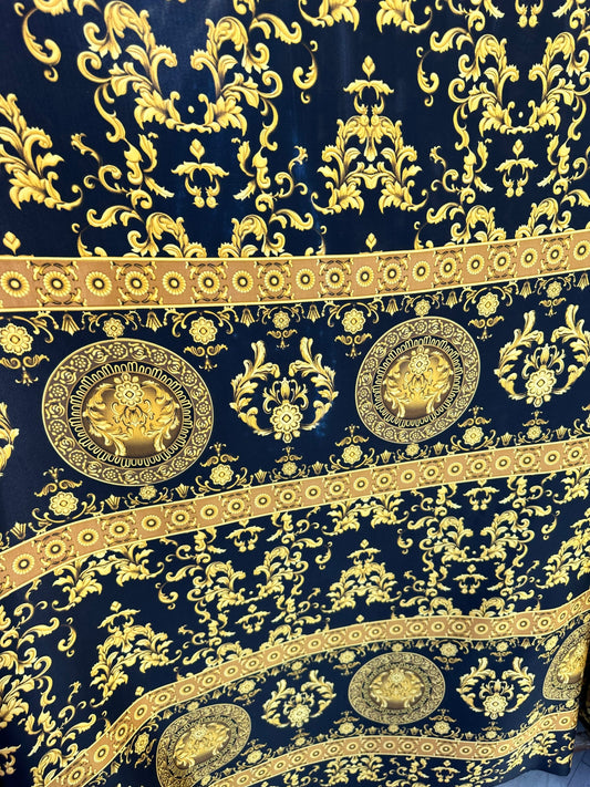 Luxury Fashion Brand design Black/Gold print on high quality of silky charmeuse satin 2-way stretch 58/60” Sold by the YD.