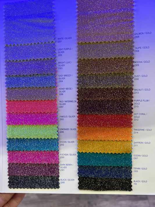 Selena design Deluxe metallic spandex fabric 4-way stretch 58/60” Sold by the YD. Ships worldwide from Los Angeles California USA.