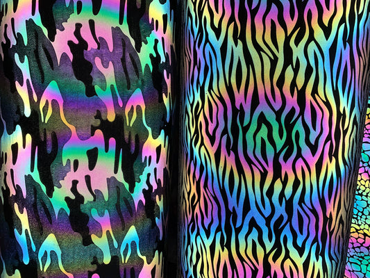 New reflective rainbow zebra and camouflage design on super techno heavy fabric 2-way Stretch 58/60” Sold by the YD. Ships worldwide.