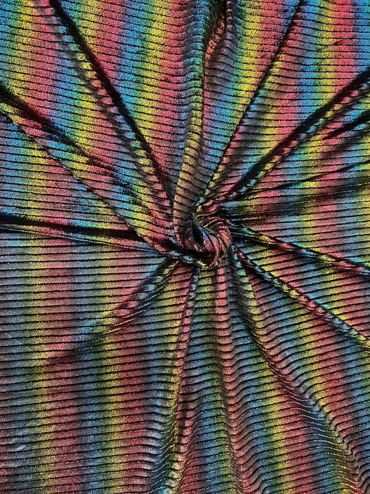 Luxury Pleated stretch velvet with foil Black/Rainbow 2-way stretch 58/60”
