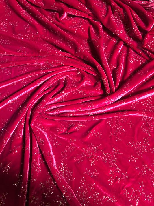New Stretch velvet with gold glitter print 420 gsm 4way Stretch 58/60" Sold by the YD. Ships worldwide from Los Angeles California USA.