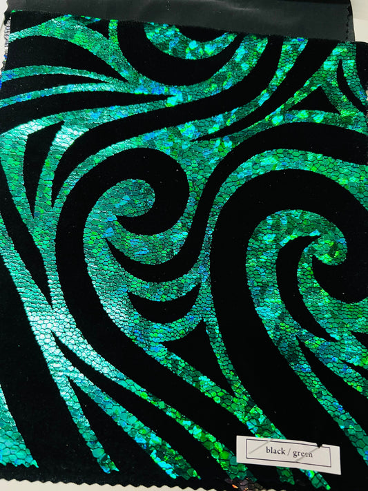New Rolex design swirl hologram foil on great quality of stretch velvet 4-way stretch 58/60” Sold by the YD. Ships Worldwide from L.A CA