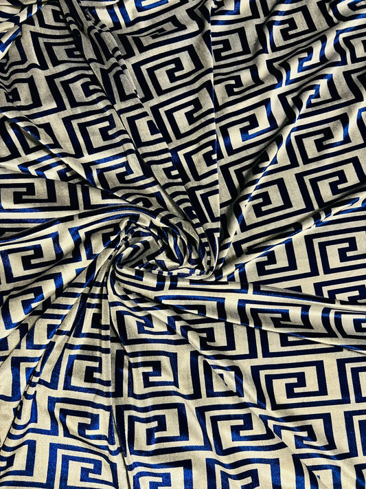 New modern Fashion brand design Silver/Sapphire print on great quality of stretch velvet 4-way stretch 58/60” Sold by the YD.