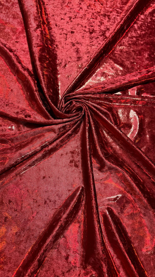 Iridescent Dark Red metallic foggy foil on stretch velvet 4-way 58/60” High quality fabrics by AlexLAFabrics