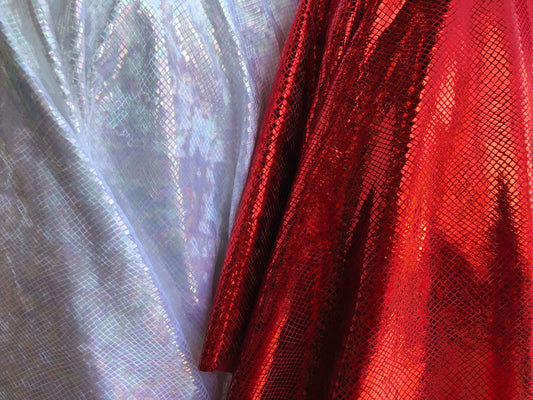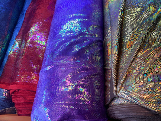 New Iridescent Alligator design hologram clear ilusión foil on heavy stretch velvet 4way stretch 58/60” Sold by the YD. Ships worldwide
