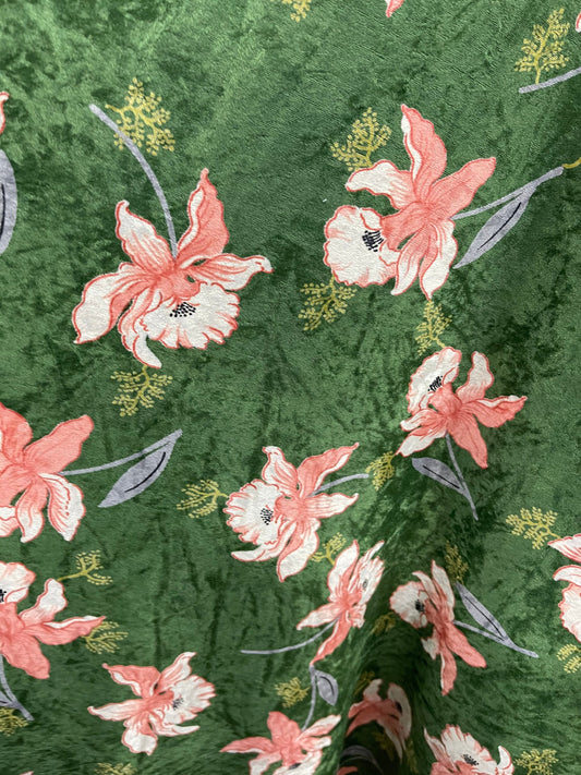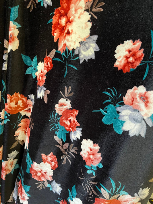 New flower design print on stretch velvet velour 4-way stretch 58/60” Sold by the YD. Ships Worldwide from Los Angeles California USA.