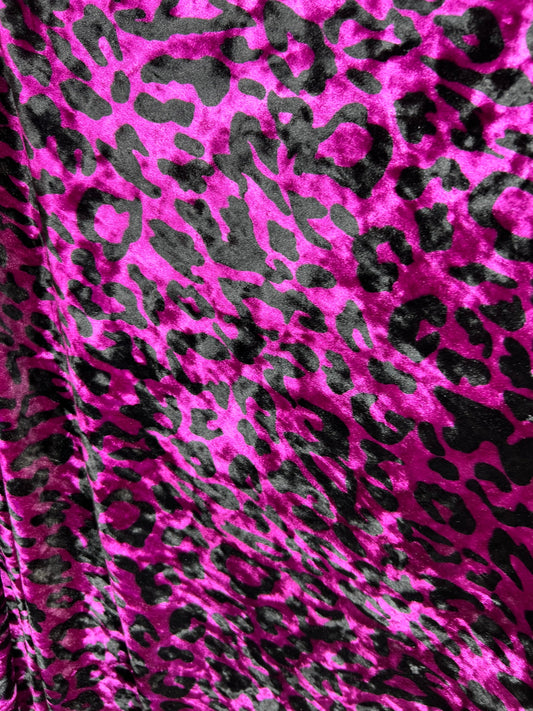 New Leopard design Magenta/Black exotic animal print on 4-way stretch velvet 58/60” Sold by the YD. Ships worldwide from Los Angeles CA