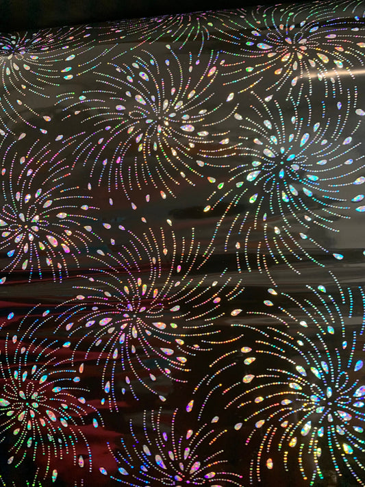 New spandex shining vinyl fireworks design 2-way Stretch 58/60” Sold by the YD. Ships worldwide from Los Angeles California USA.