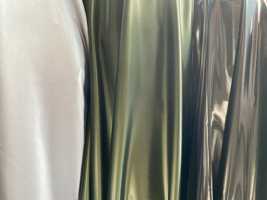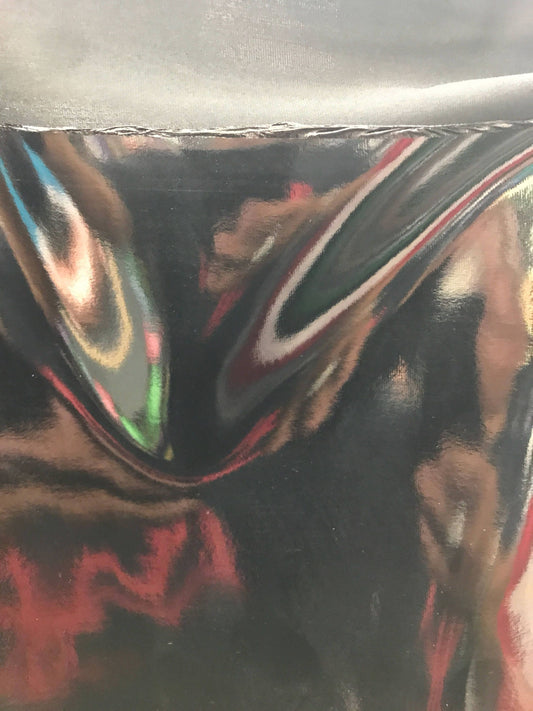 New Iridescent reflectiveTPU vinyl coated 4-way stretch poly spandex 58/60” Sold by the YD. Ships worldwide from Los Angeles California USA.