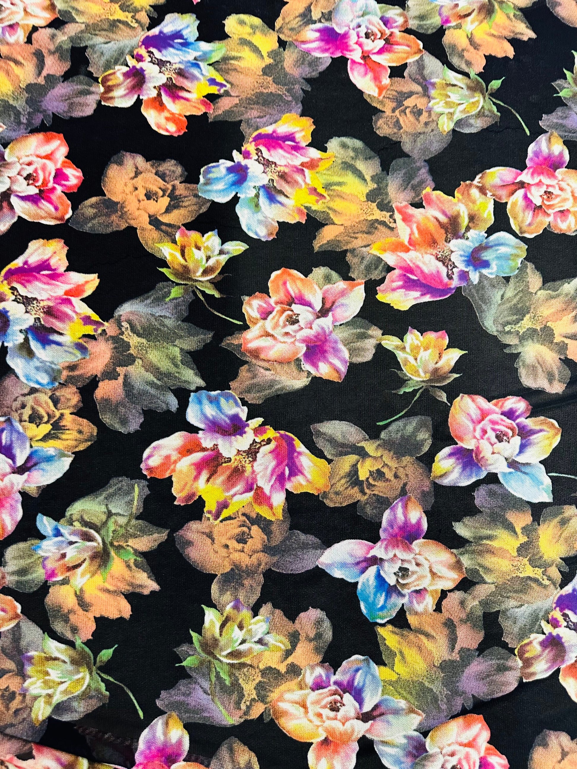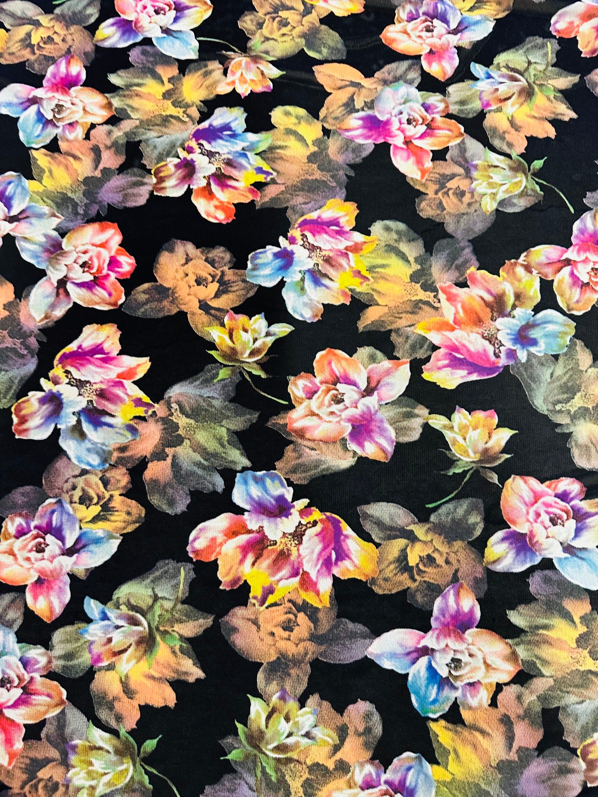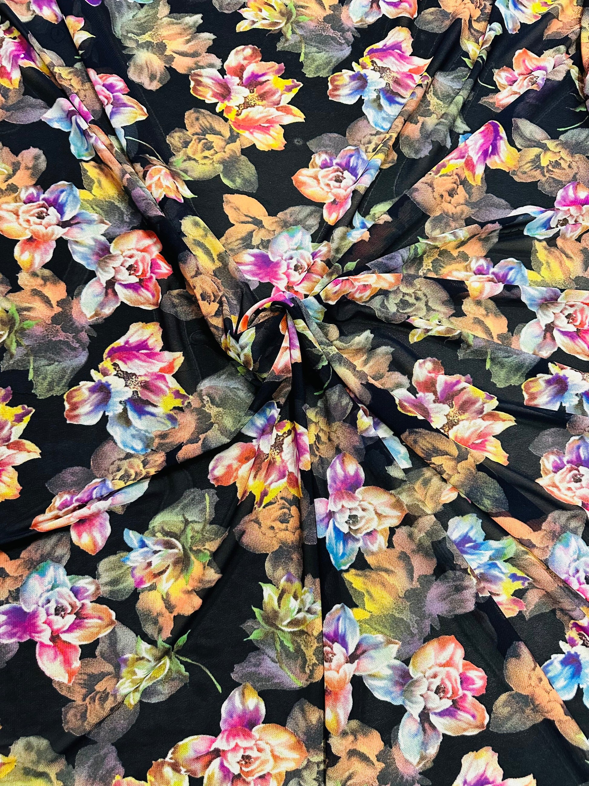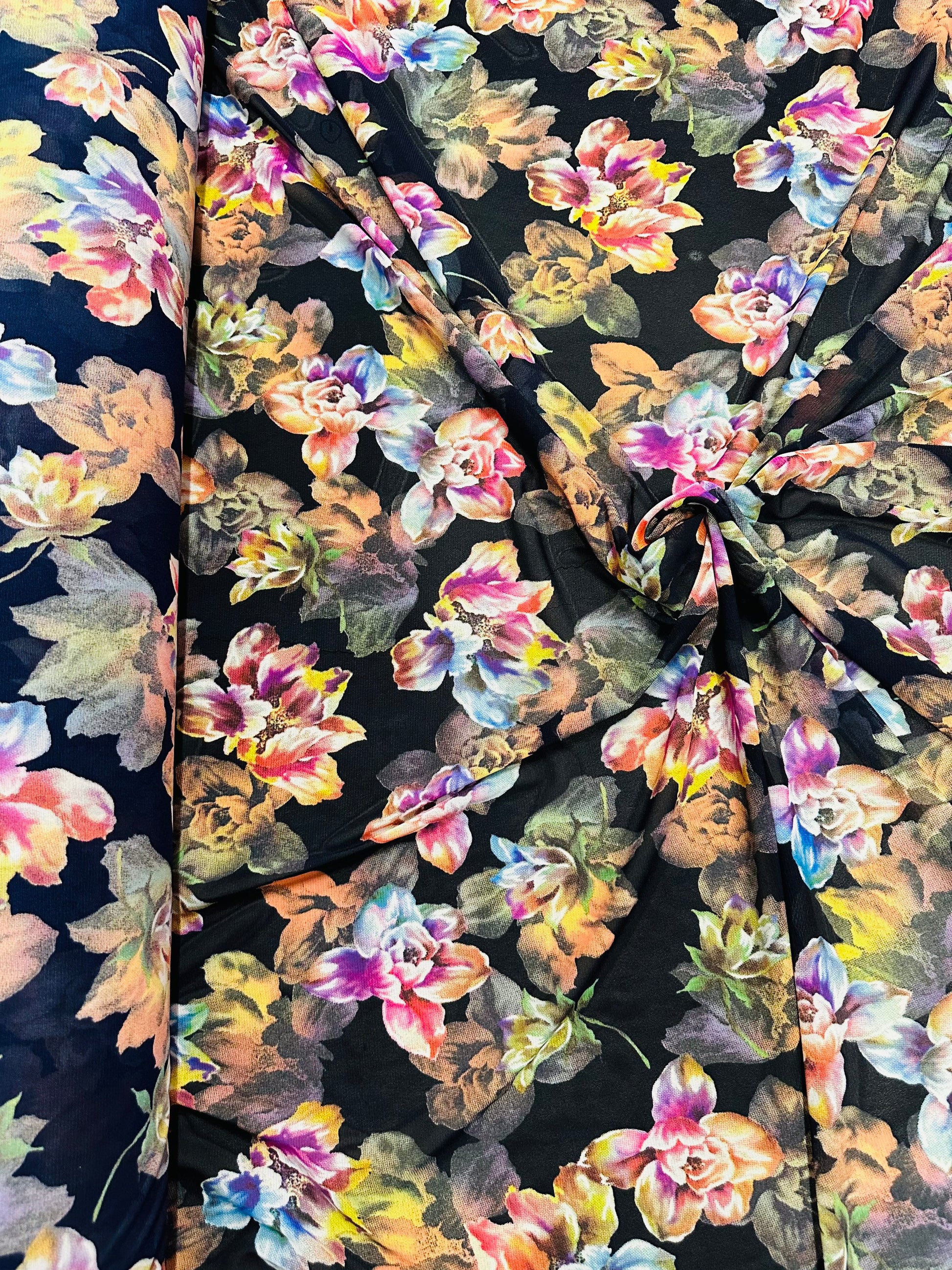 3D Romantic Flower design black multicolor print on power mesh 4-way stretch 58/60”