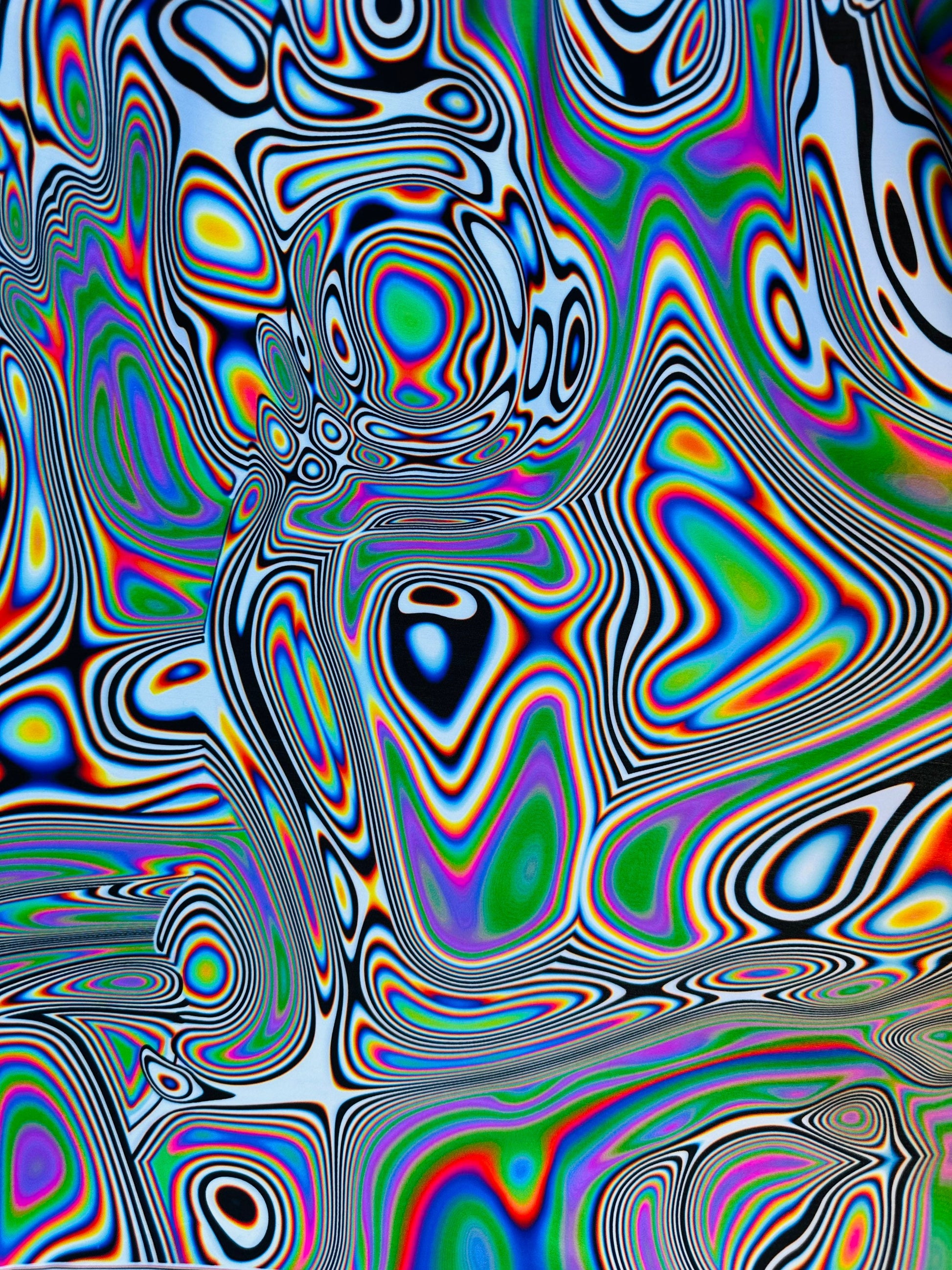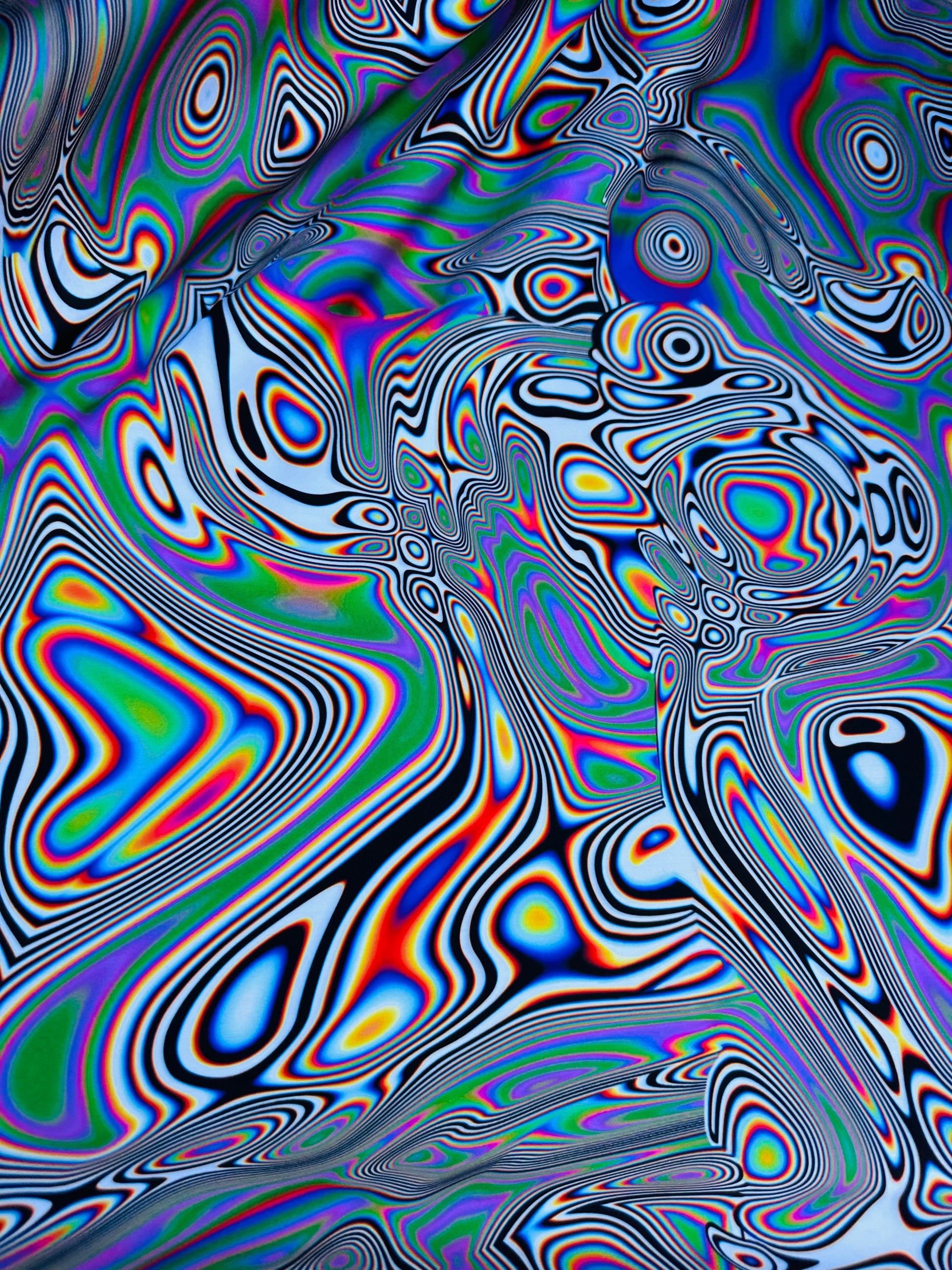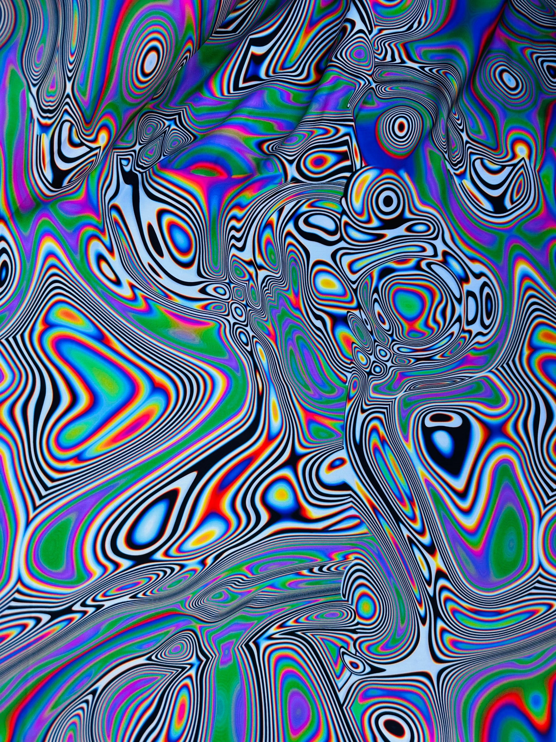 Abstract design multicolor print on great quality nylon spandex it glows under black light UV light 4-way stretch 58/60” Sold by the YD. Ships worldwide from Los Angeles California USA. High quality fabrics by AlexLAFabrics