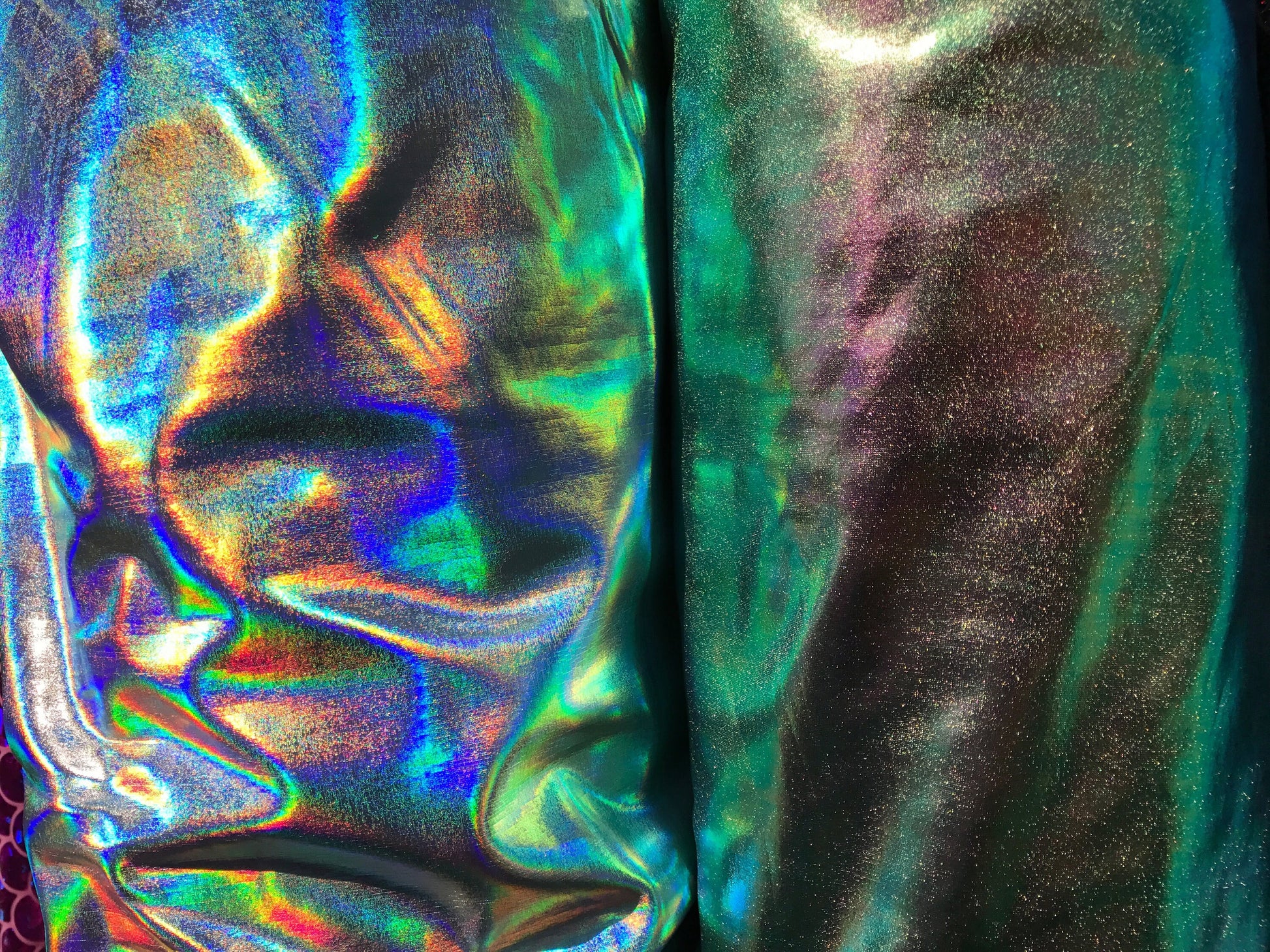 All over foil iridescent silver and Iridescent green color nylon spandex 4way stretch 58/60" Sold by the YD. Ships from Los Ángeles CA USA
