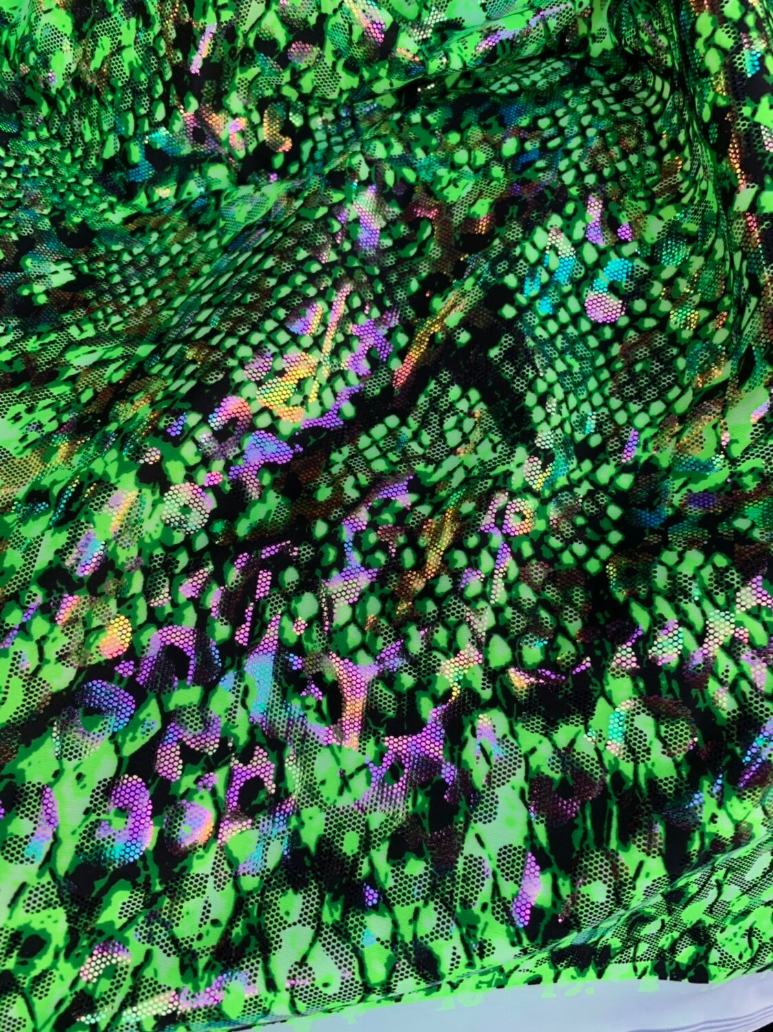 Animal print iridescent snake hologram foil metallic 4way stretch 58/60" Sold by the YD. Ships worldwide from Los Angeles California USA.