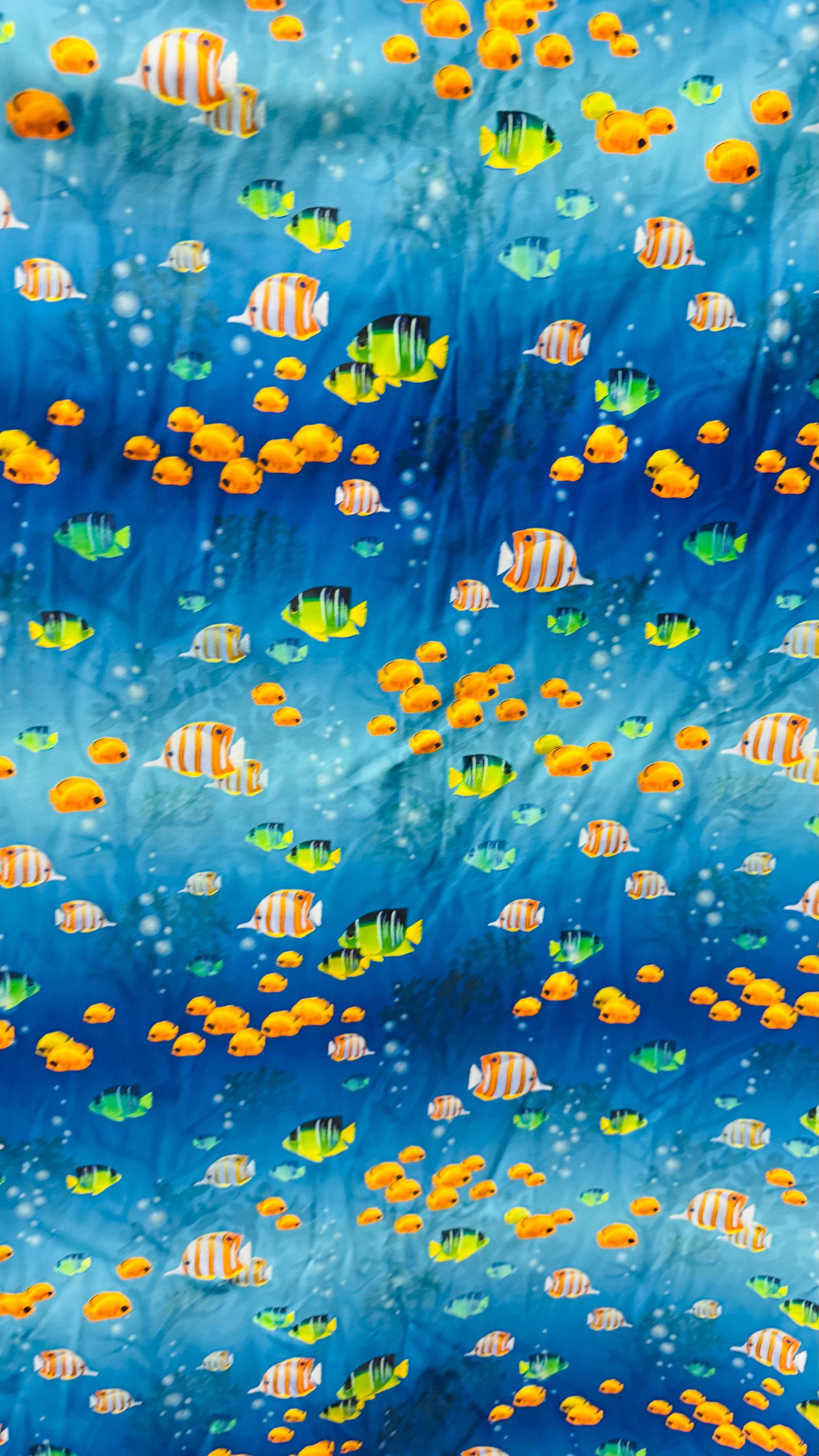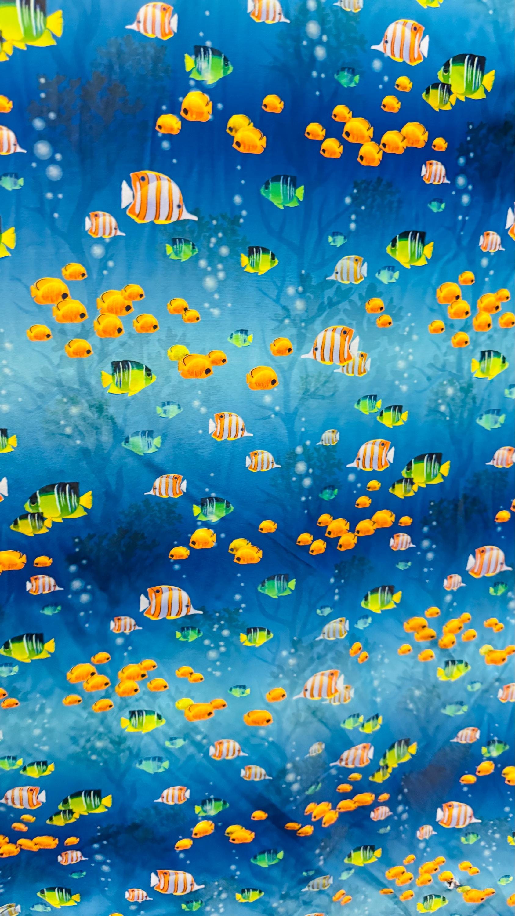 Aquarium design Blue/Multicolor Print on Nylon spandex 4way stretch 58/60" sold by the yd. Ships worldwide from Los Angeles California USA. High quality fabrics by AlexLAFabrics