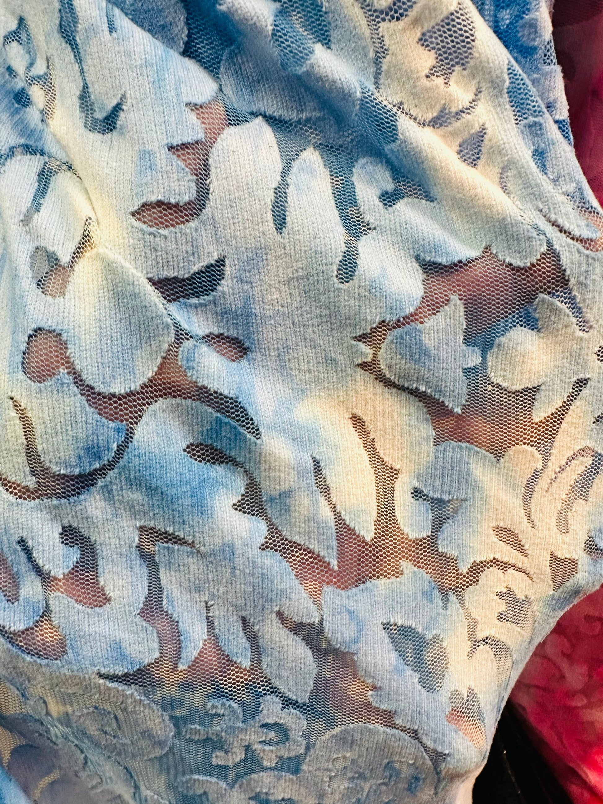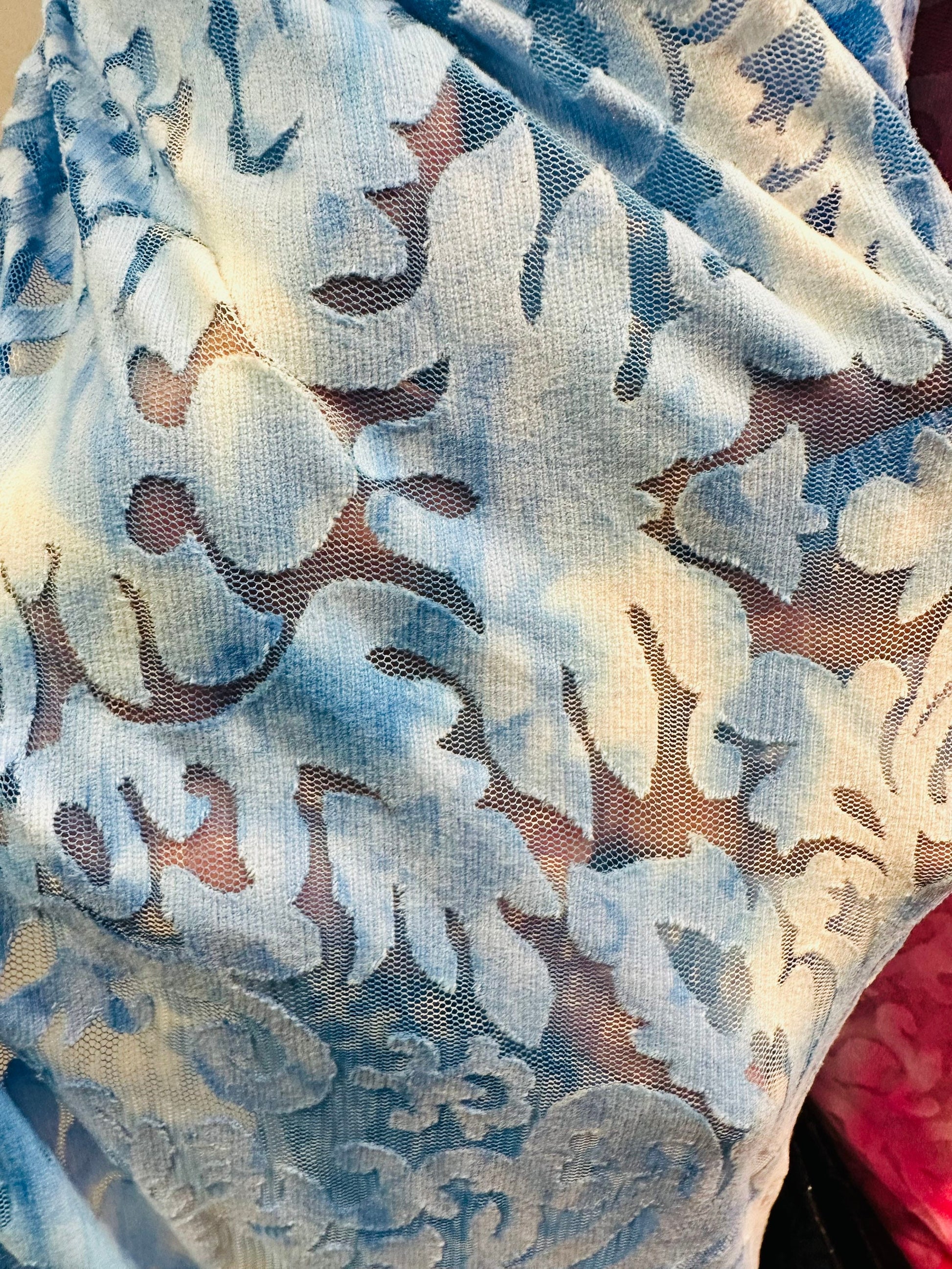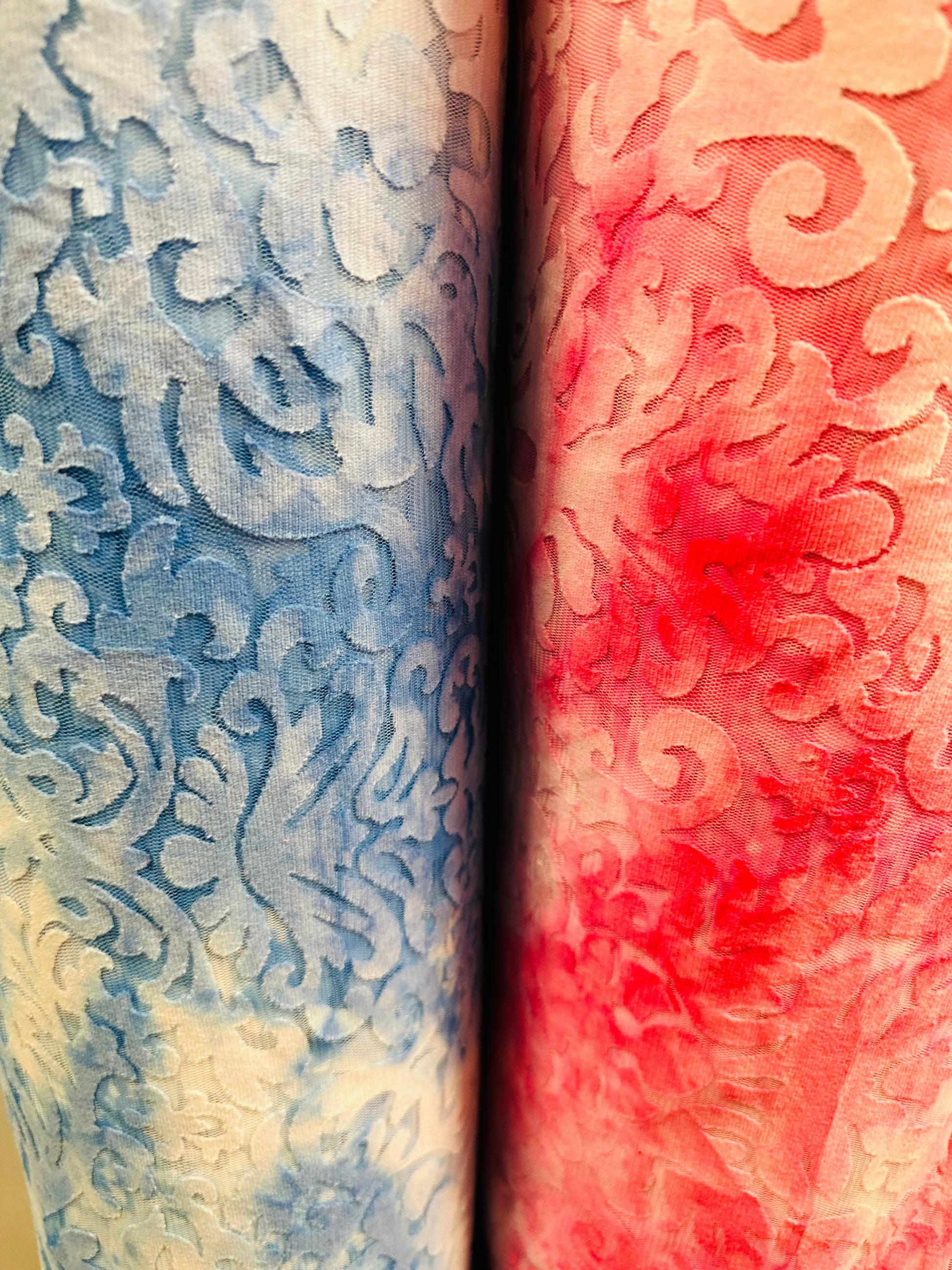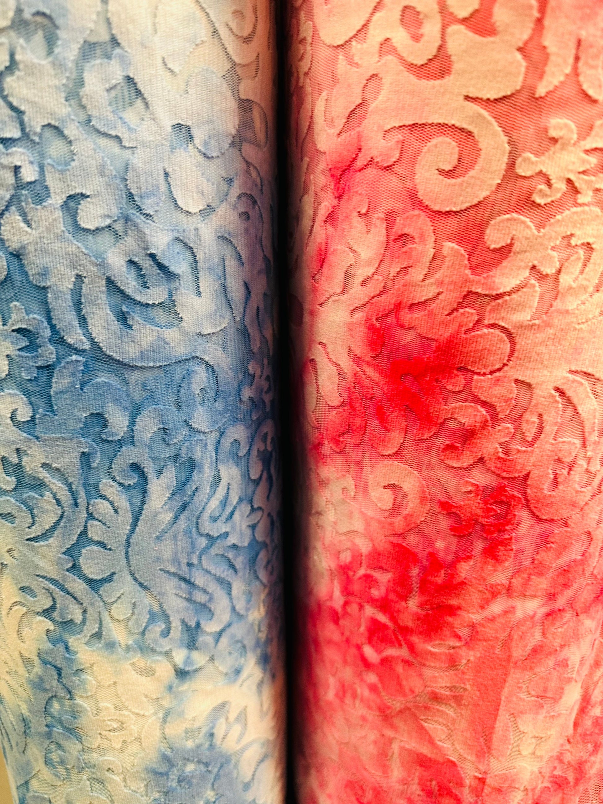 Burnout mesh damask design tie dye stretch mesh 2-way 58/60” Sold by the YD. Ships worldwide from Los Angeles California USA