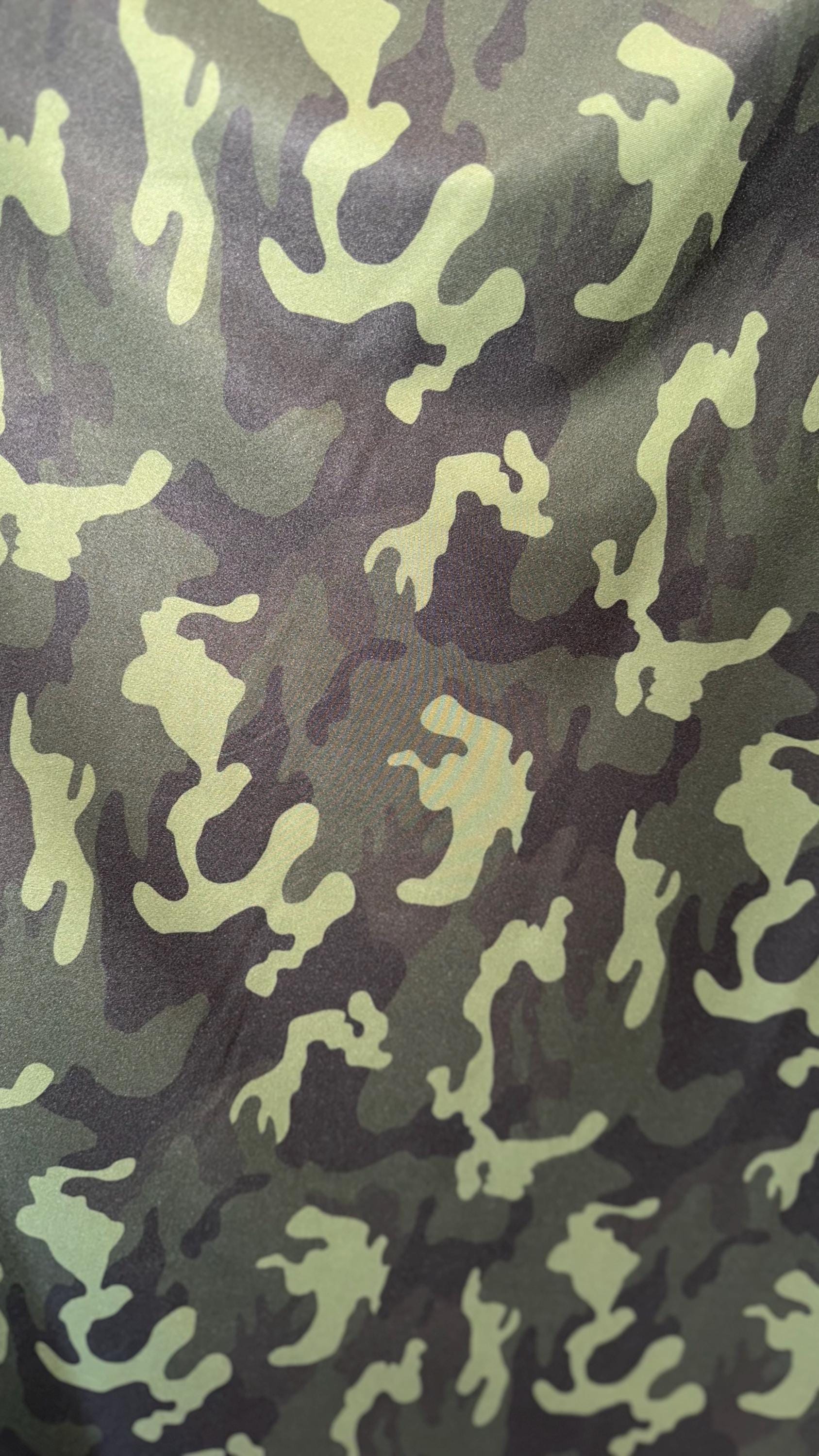 Camouflage design on great quality nylon spandex print 4way Stretch 64/65" Sold by the yd. Ships worldwide from Los Angeles California USA.