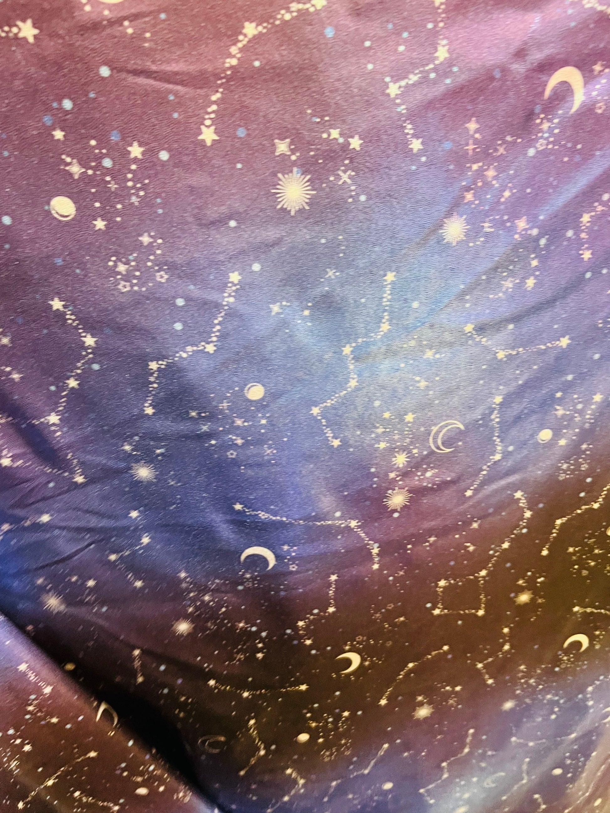 Celestial design print on ombré all over foggy foil metallic nylon spandex 4-way stretch 58/60” Sold by the YD. Ships Worldwide From Los Angeles California USA.
