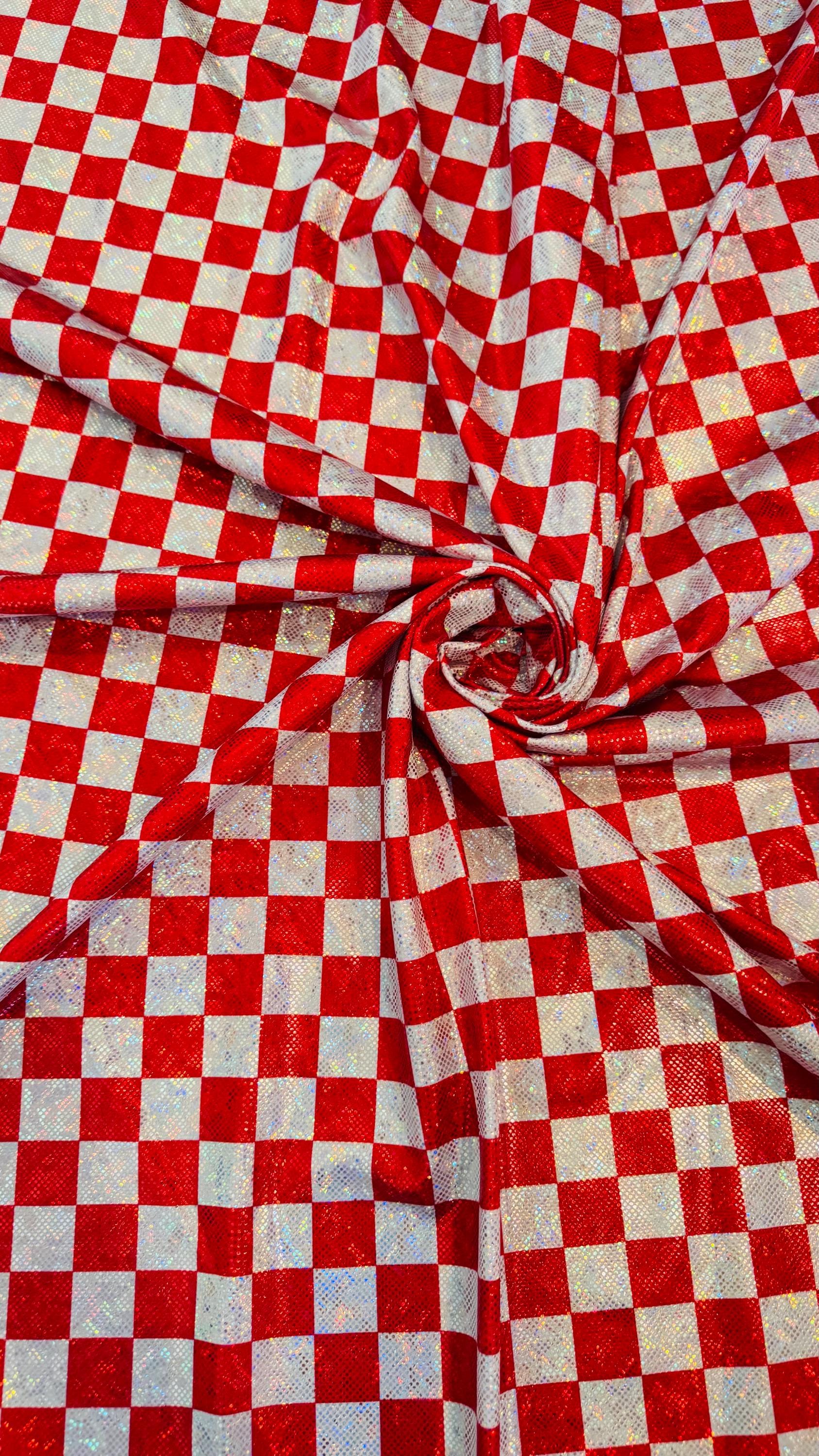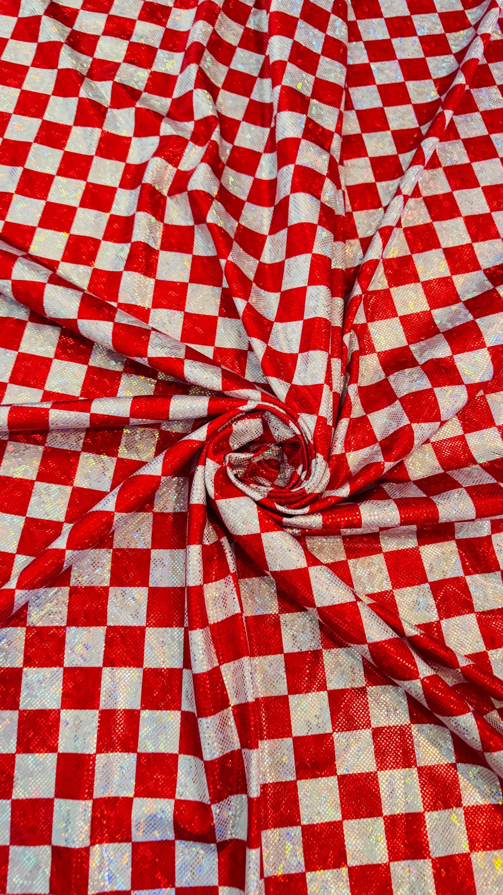 Checkers design 1” size on shattered glass New metallic hologram metallic nylon spandex 4-way stretch 58/60” Sold by the YD. Ships worldwide from Los Angeles California USA. High quality fabrics by AlexLAFabrics