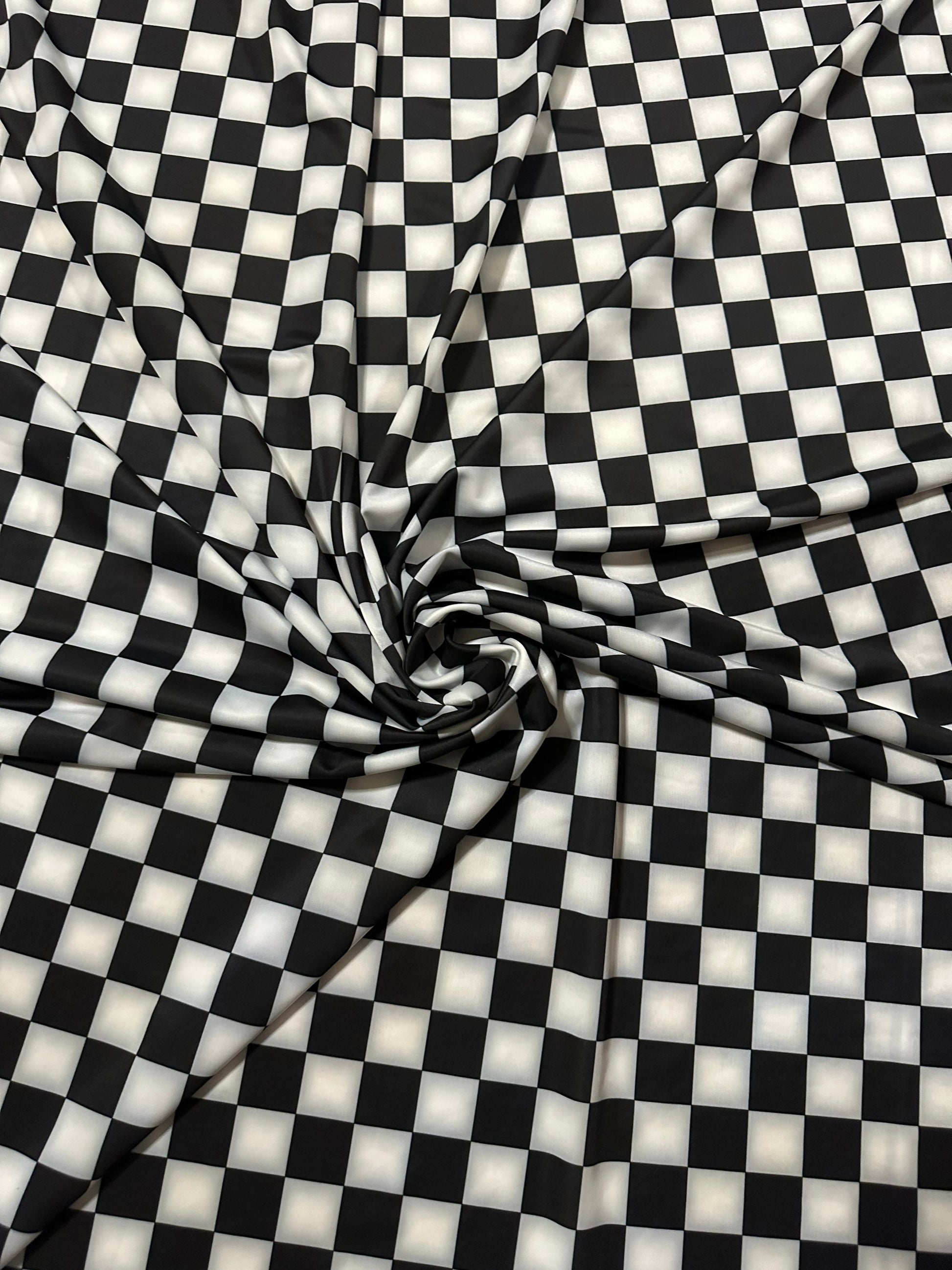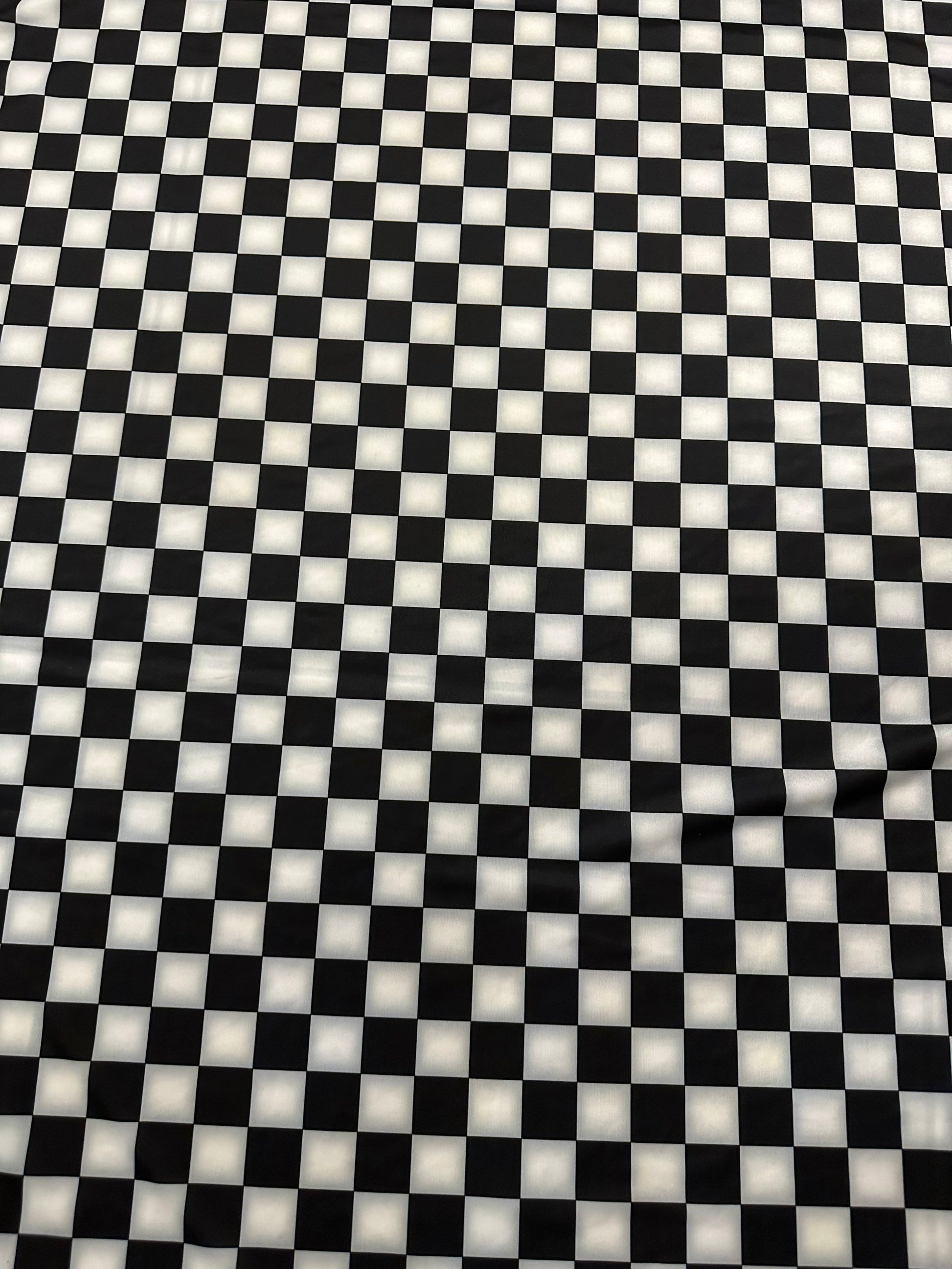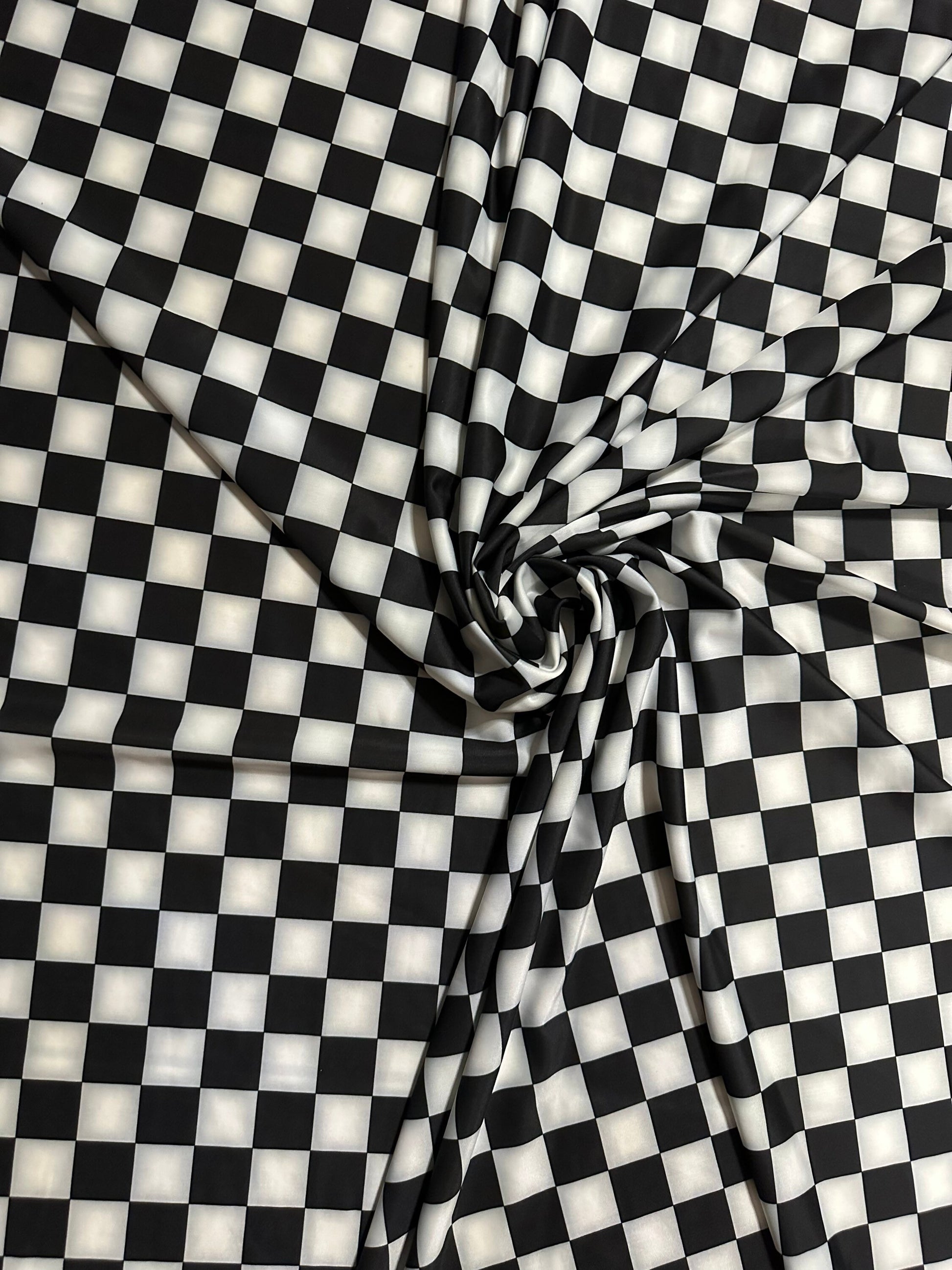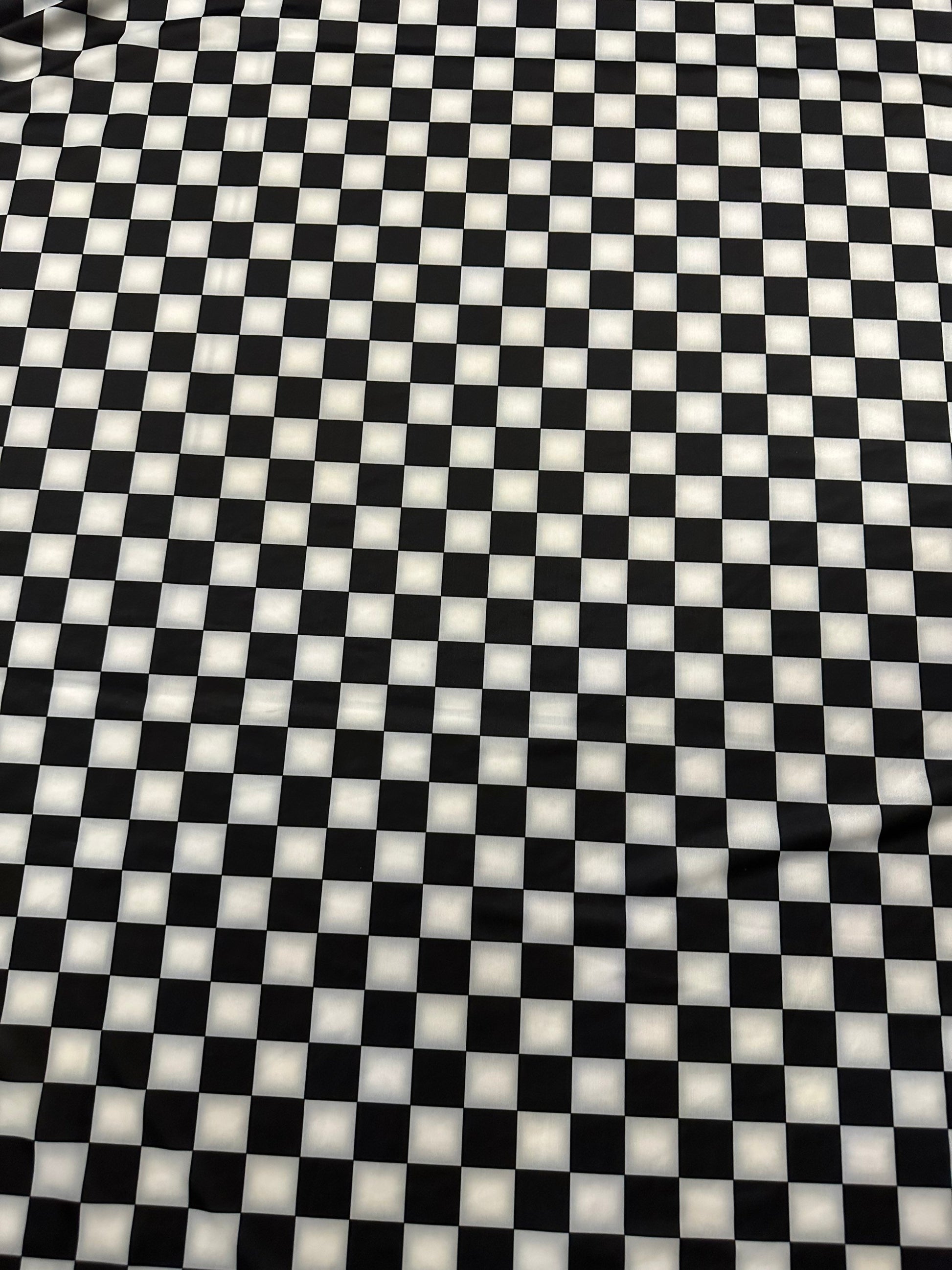 Checkers design 1” size white/black print on great quality of nylon spandex 4-way stretch 58/60” Sold by the YD.