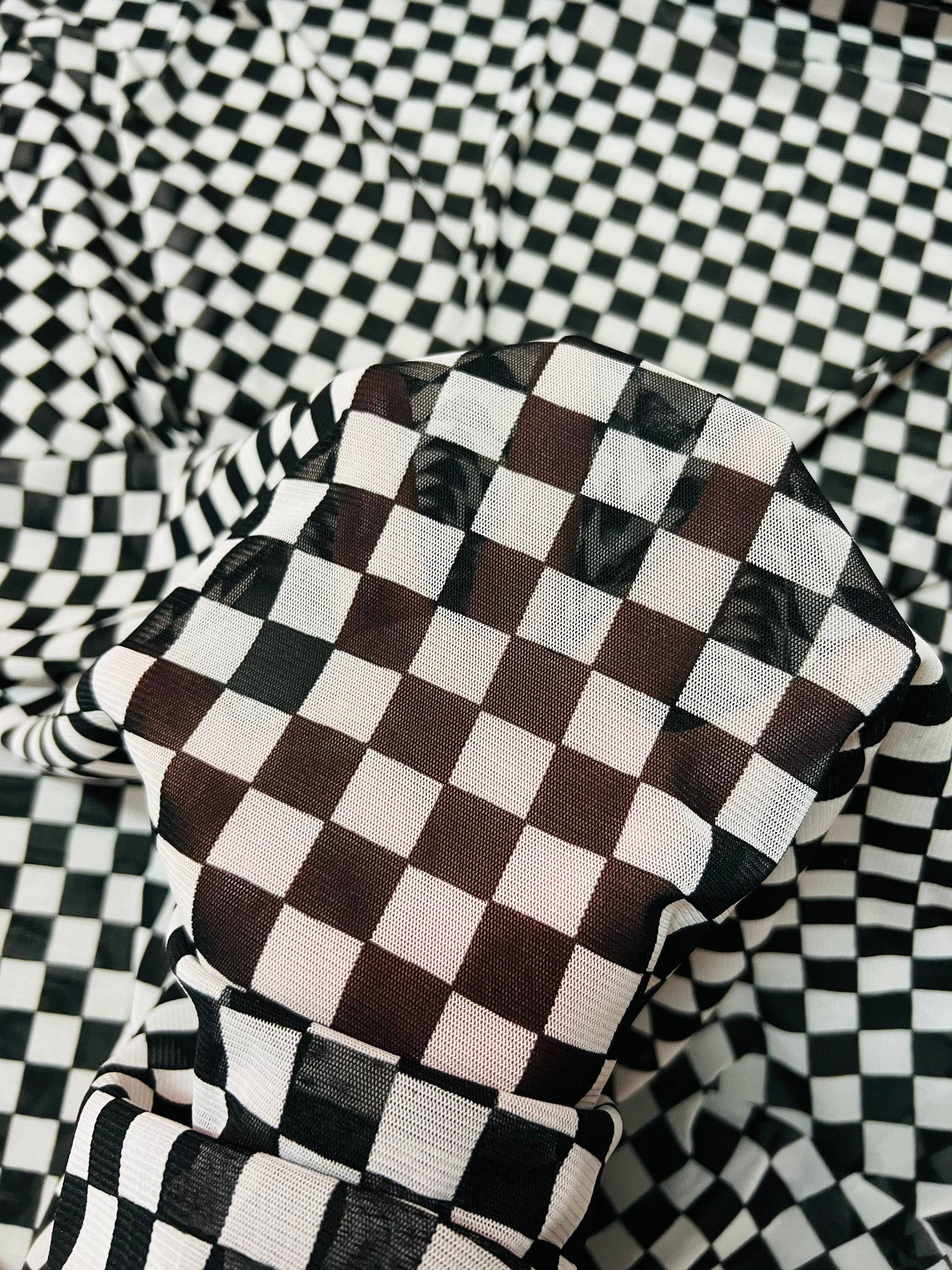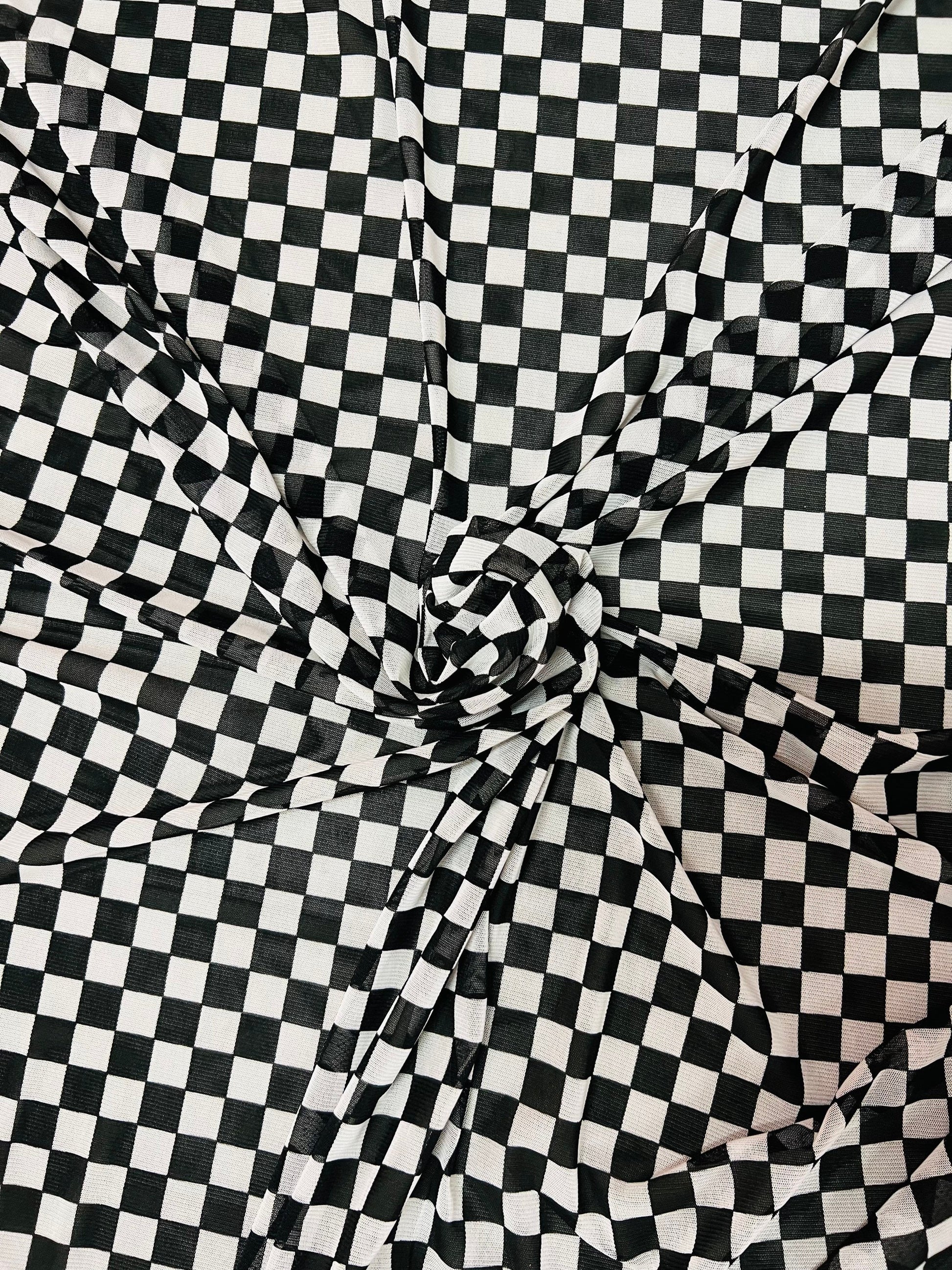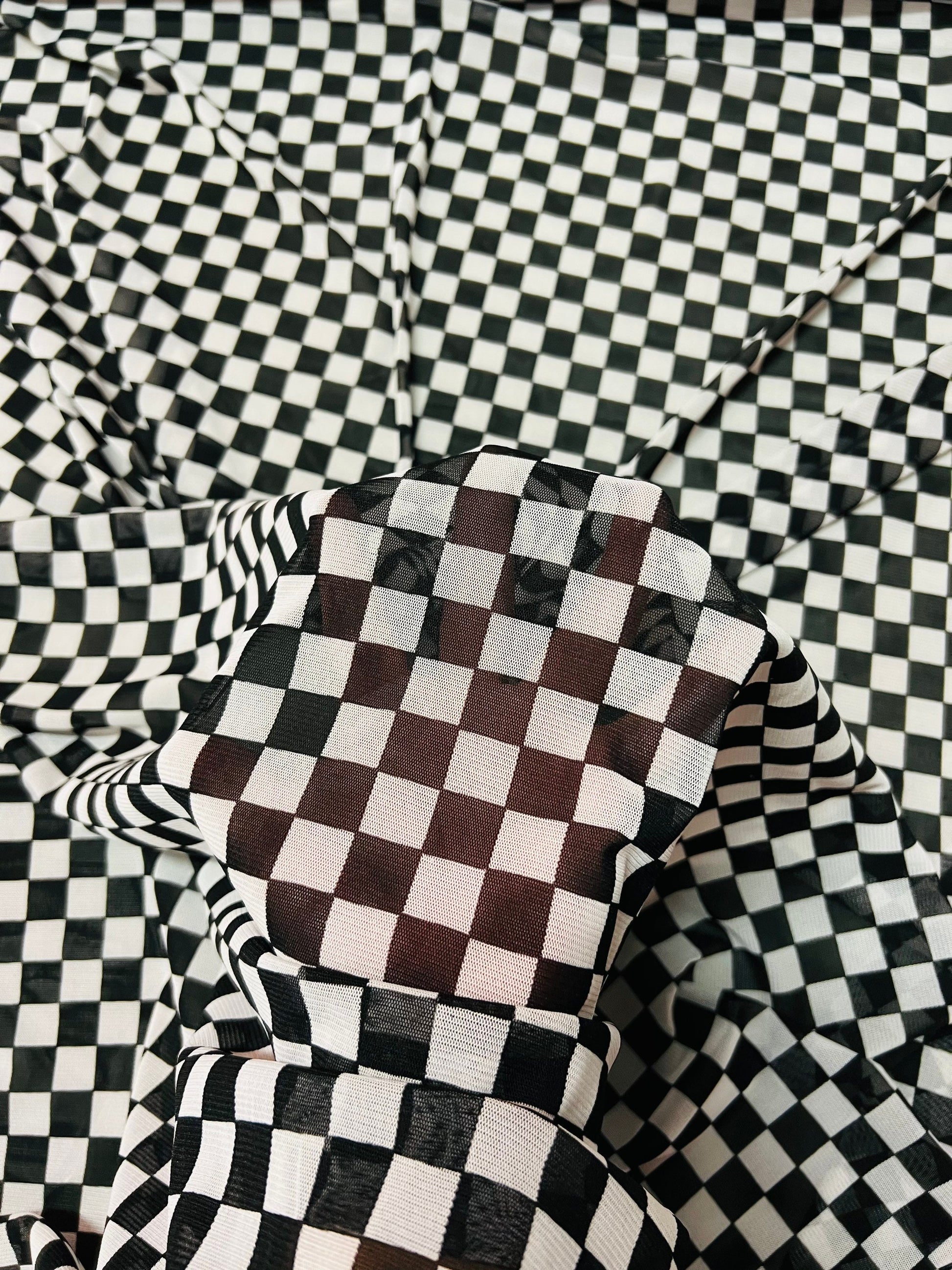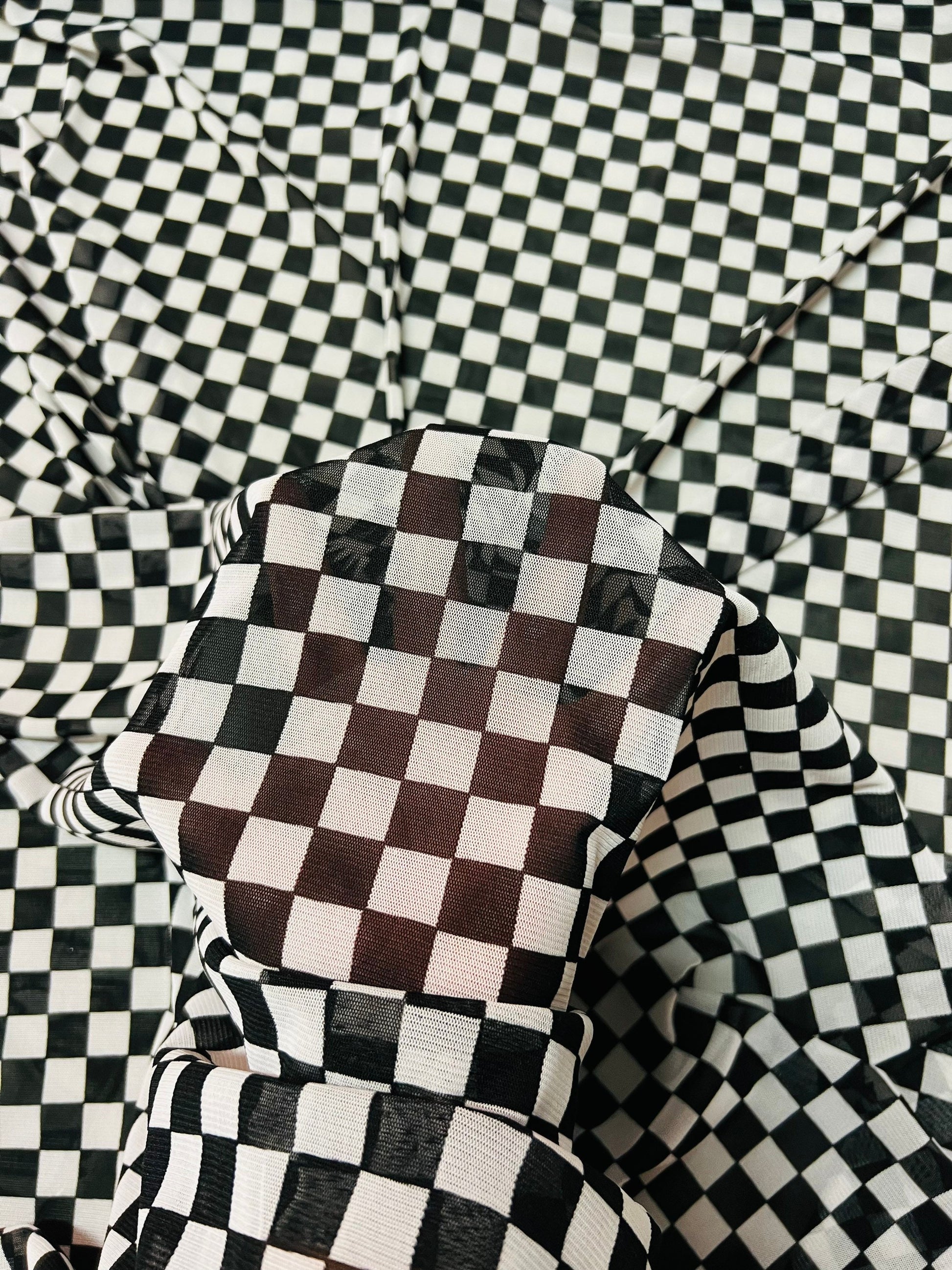 Checkers design White/Black print on great quality of power mesh 2-way stretch 58/60” Sold by the YD. Ships Worldwide from Los Angeles Cali
