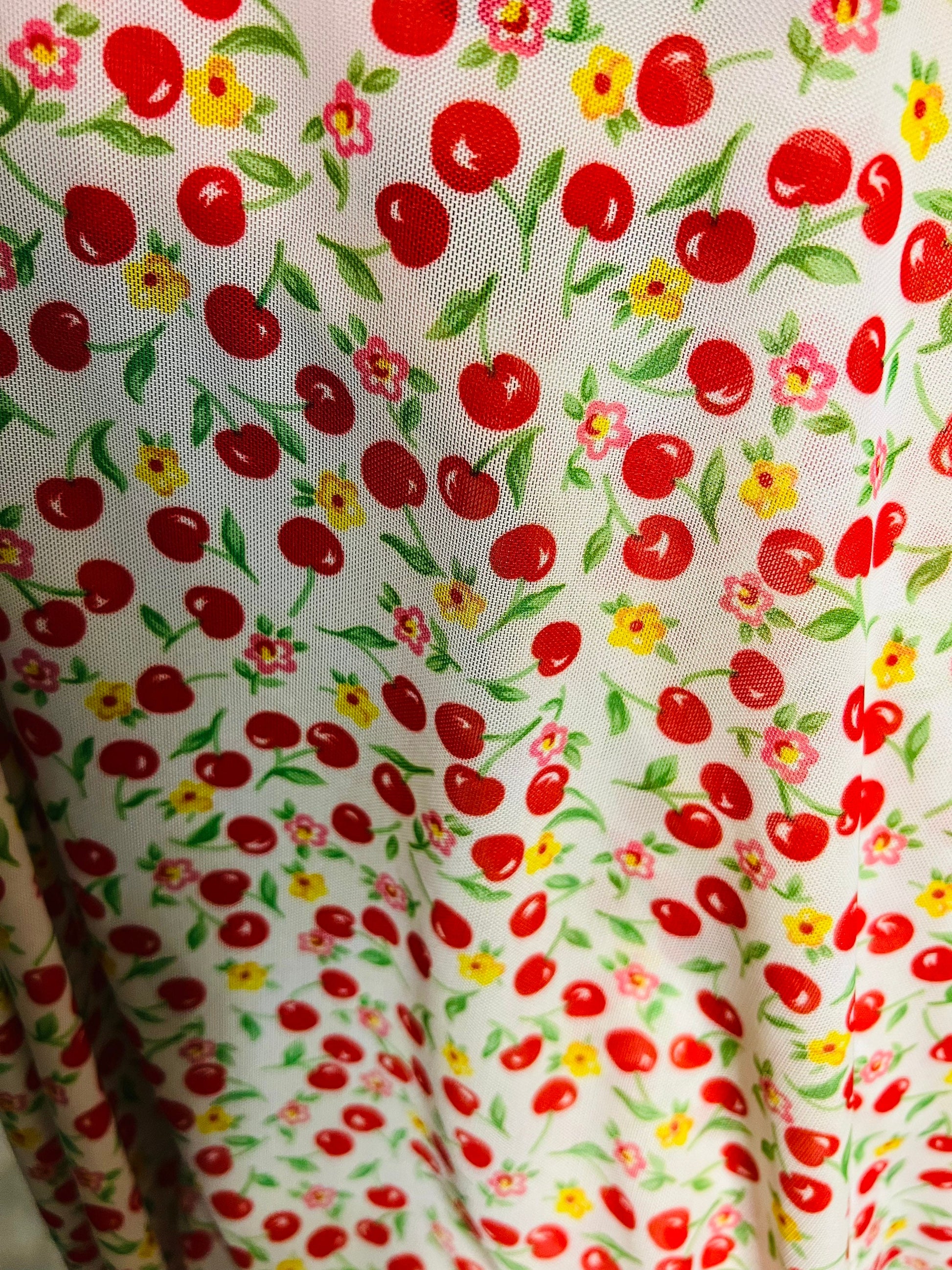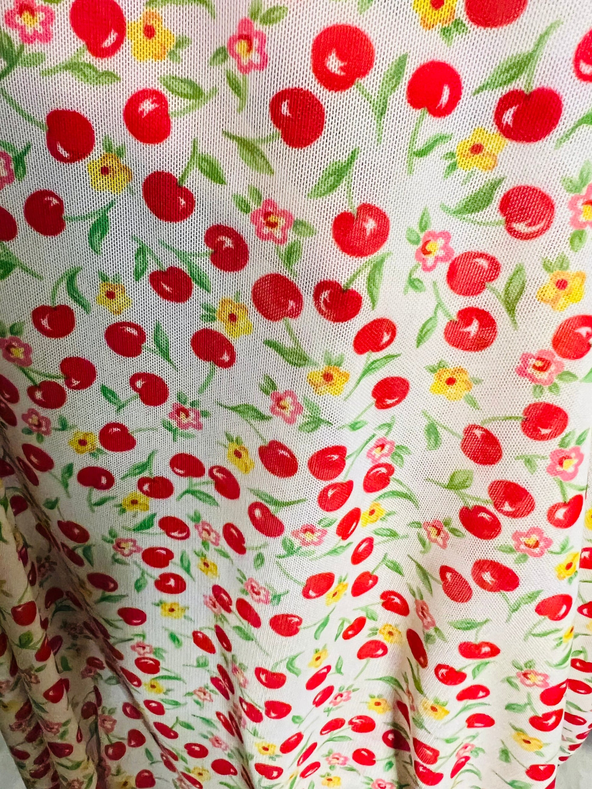 Cherry design print on best quality of power mesh nylon spandex 4-way stretch 58/60” Sold by the YD. Ships Worldwide from Los Angeles California USA.