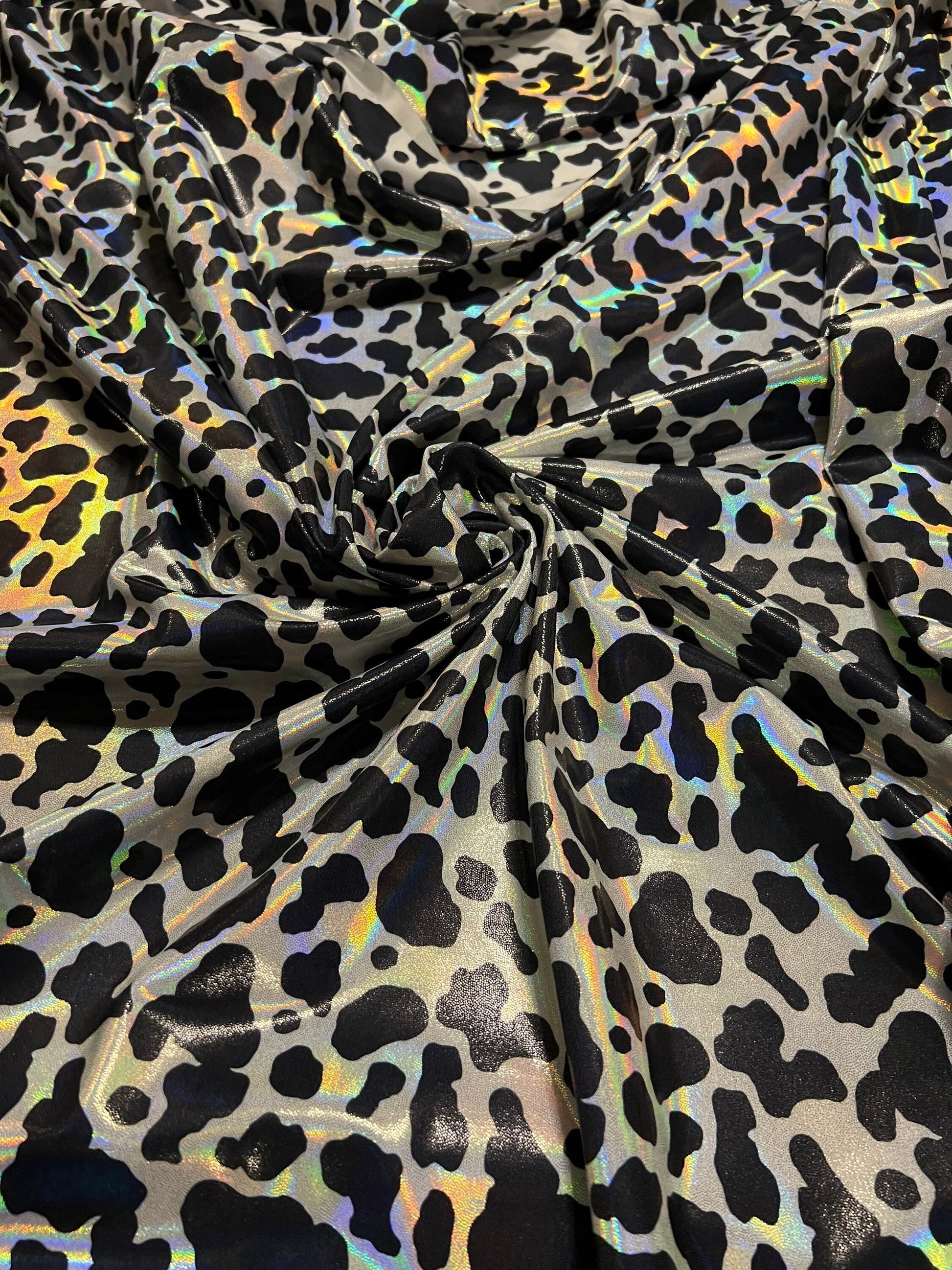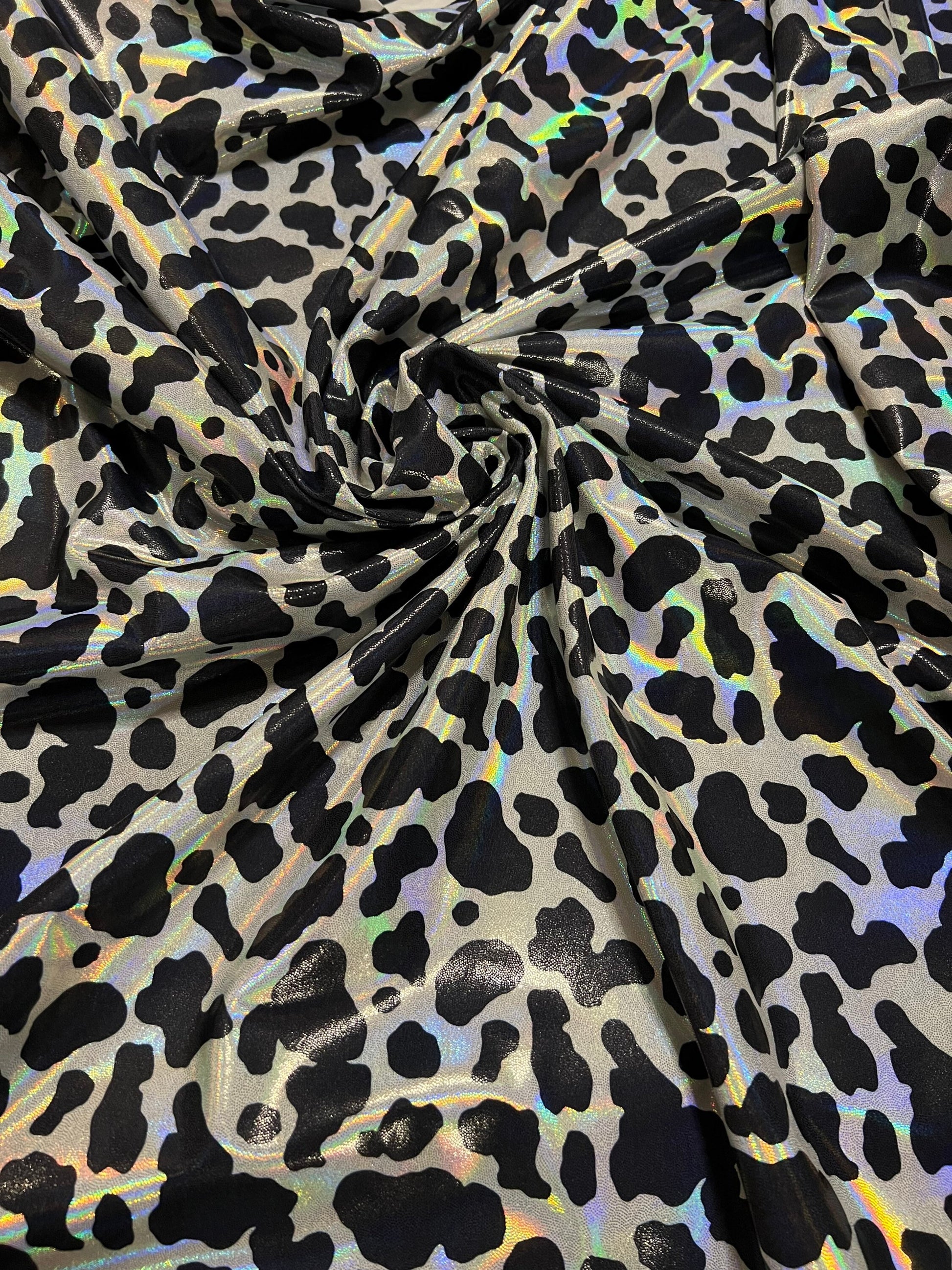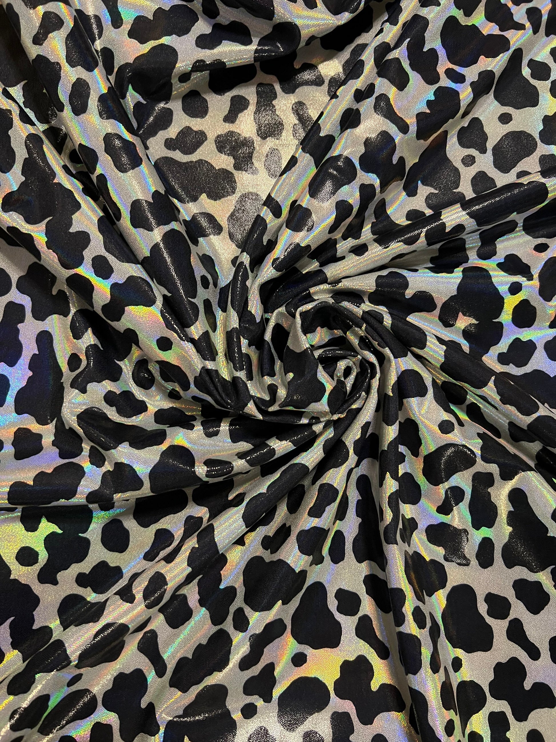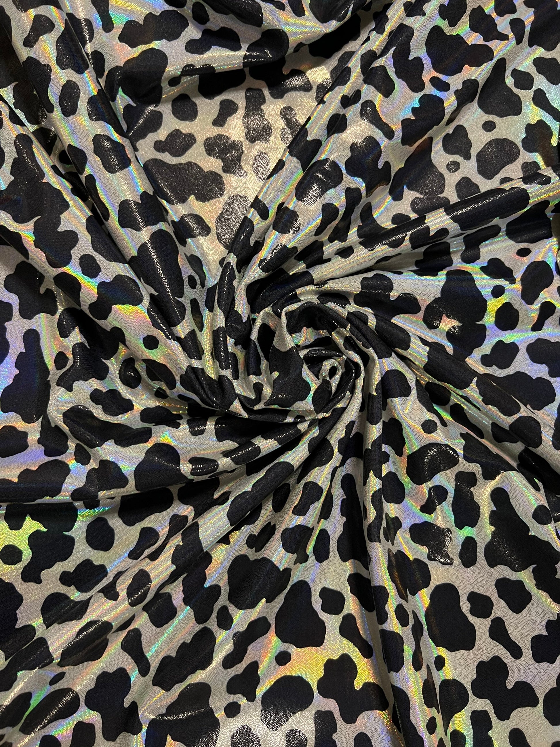 Cow design on Luxury metallic lacer nylon spandex 4-way stretch hologram white silver/black spandex 58/60” Sold by the YD. Ships worldwide from Los Angeles California USA