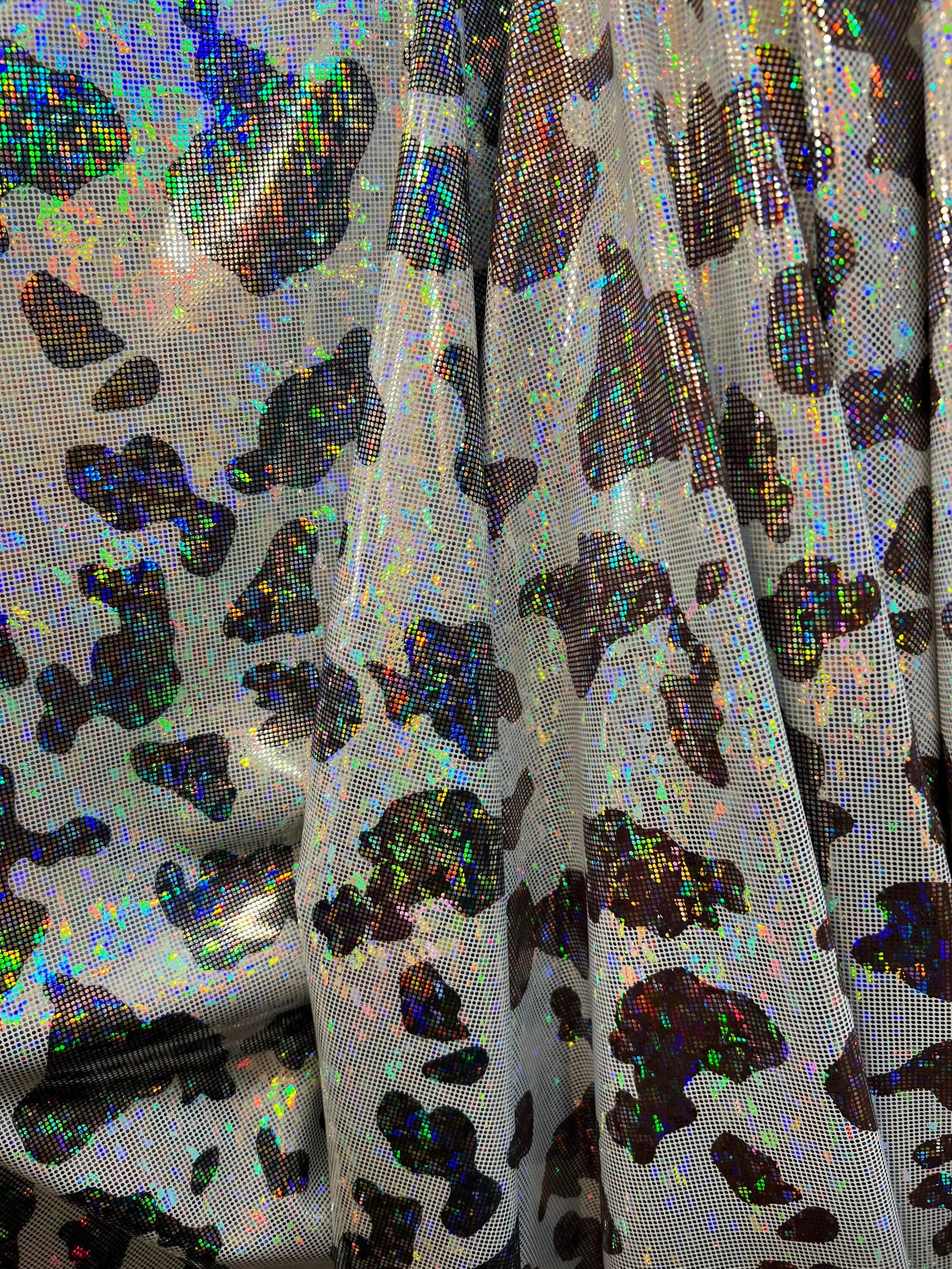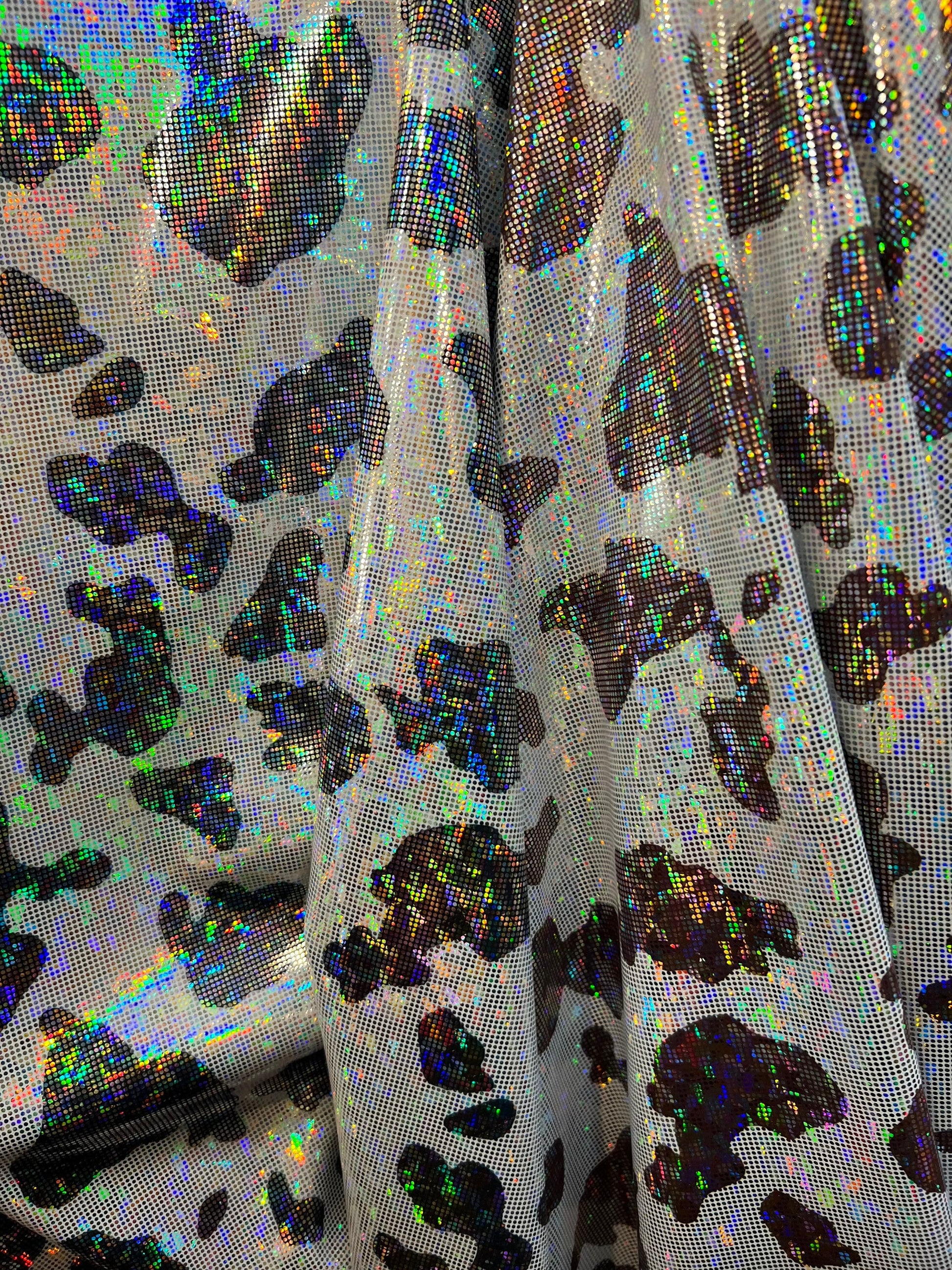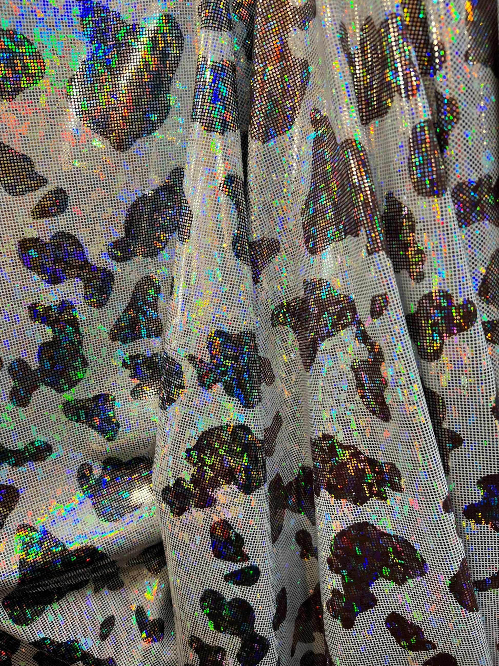 Cow design w/silver/black & w/silver/brown on shattered glass New metallic hologram nylon spandex 4-way stretch 58/60” Sold by the YD. Ships worldwide From Los Angeles California USA