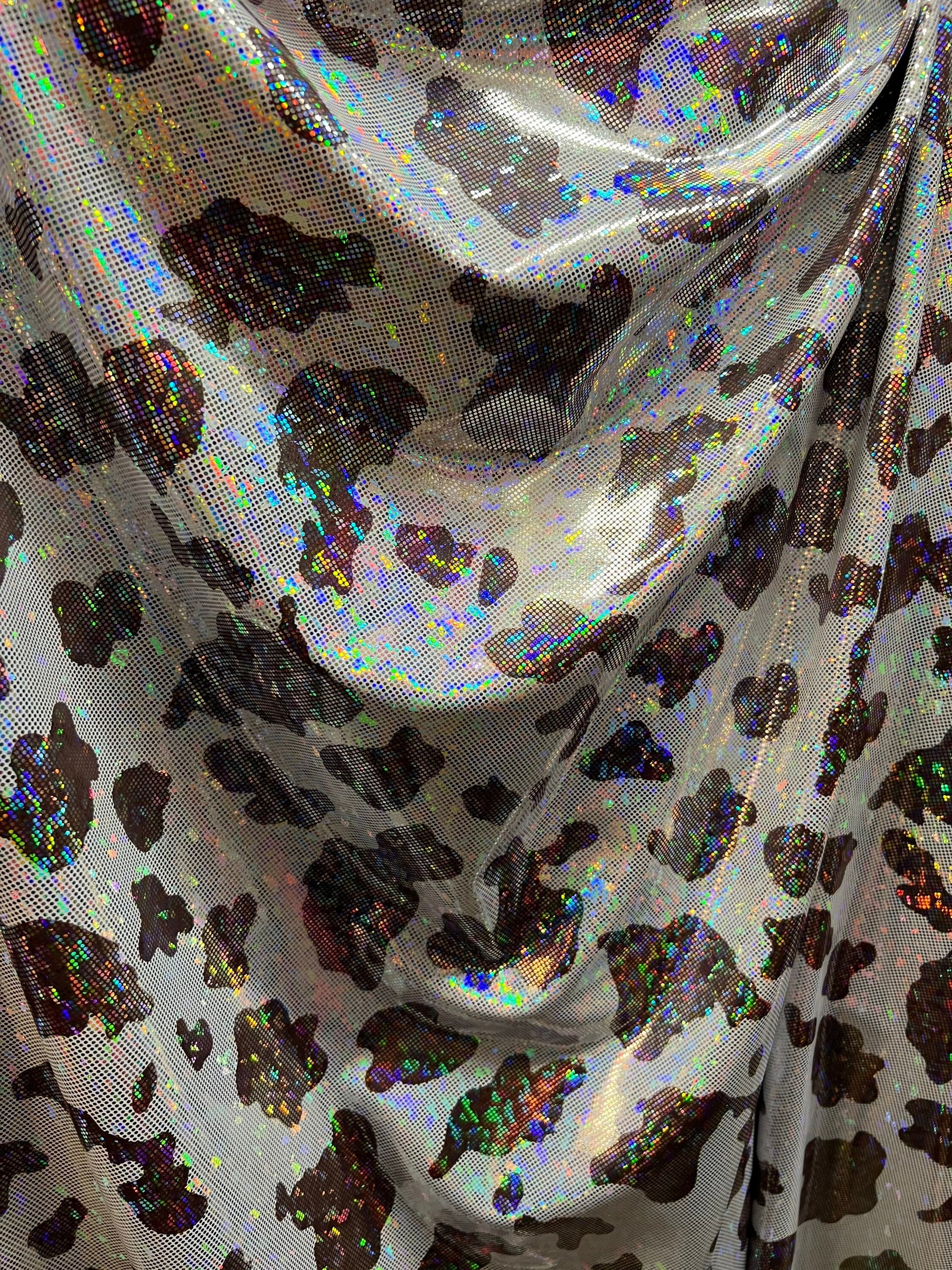 Cow design w/silver/Black & w/silver/brown on shattered glass New metallic hologram nylon spandex 4-way stretch 58/60” Sold by the YD.