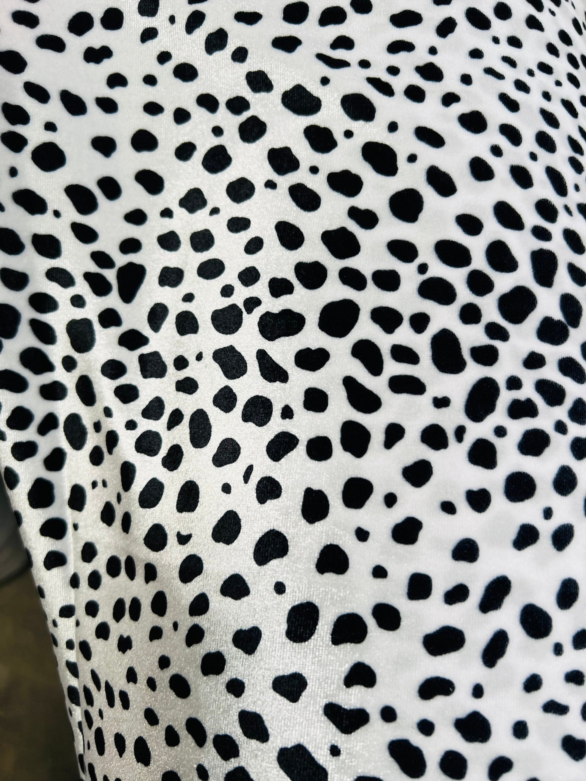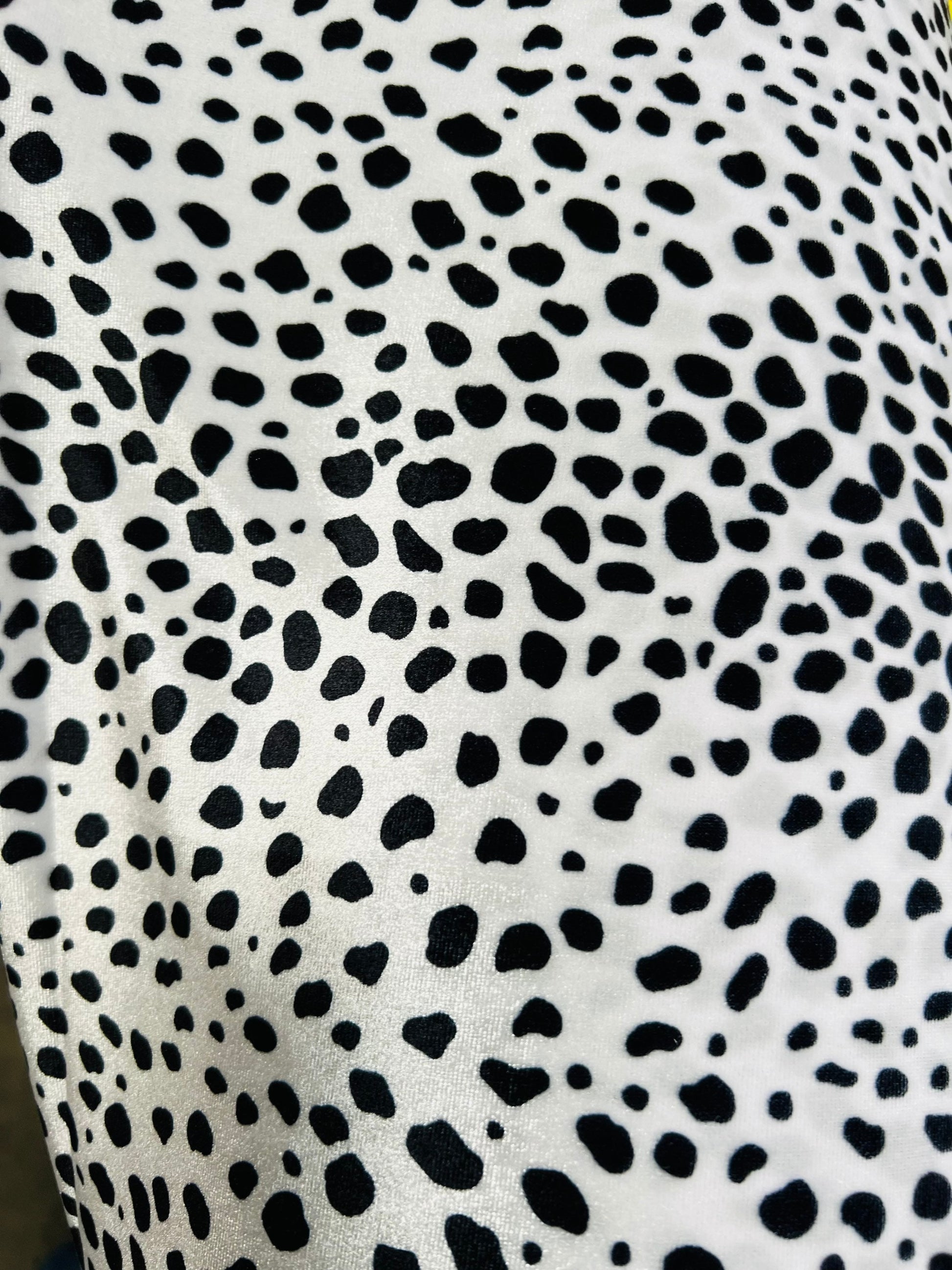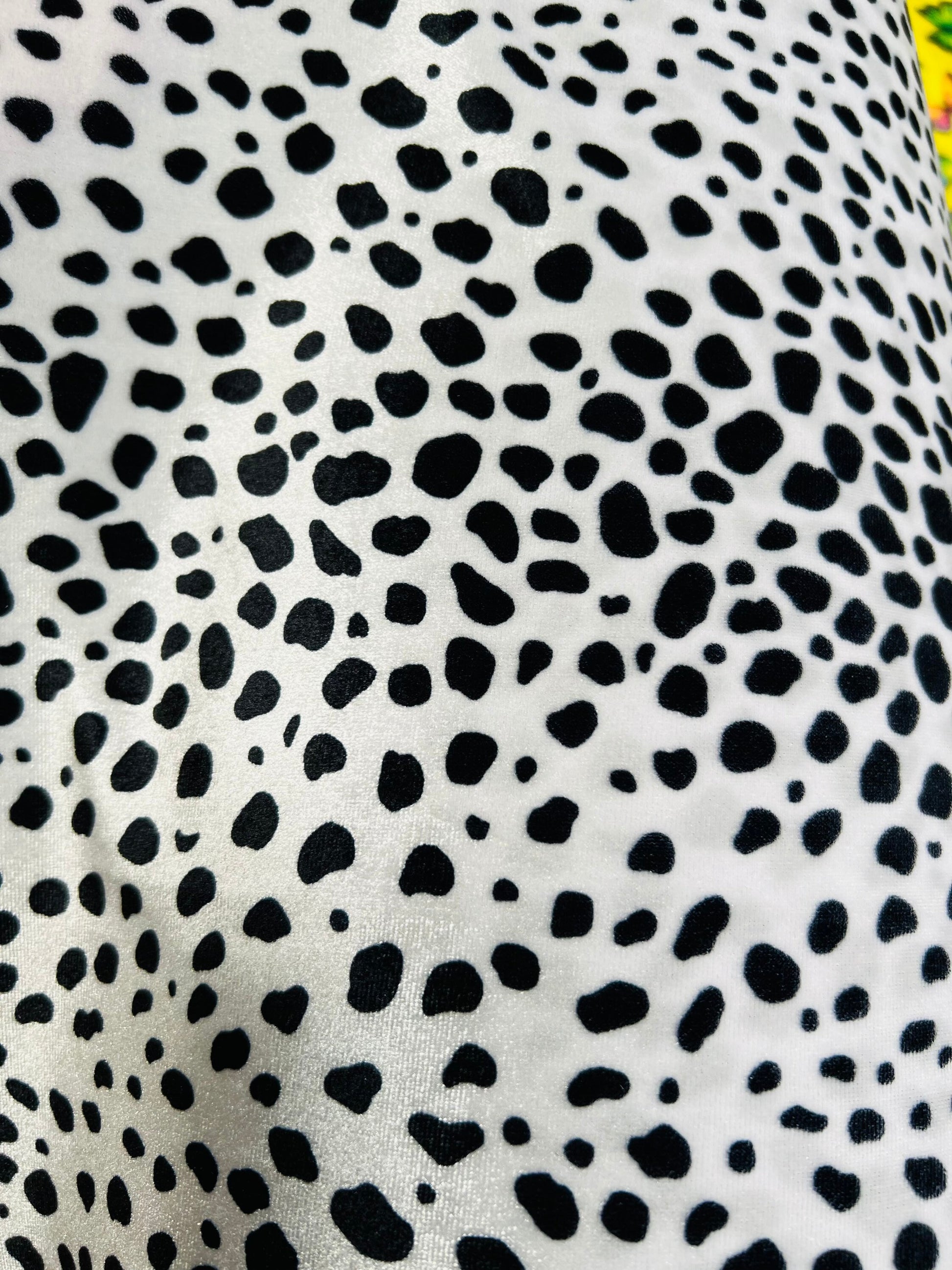 Dalmatian design print on best quality of stretch velvet 4-way stretch 58/60” Sold by the YD. Ships worldwide from Los Angeles California USA