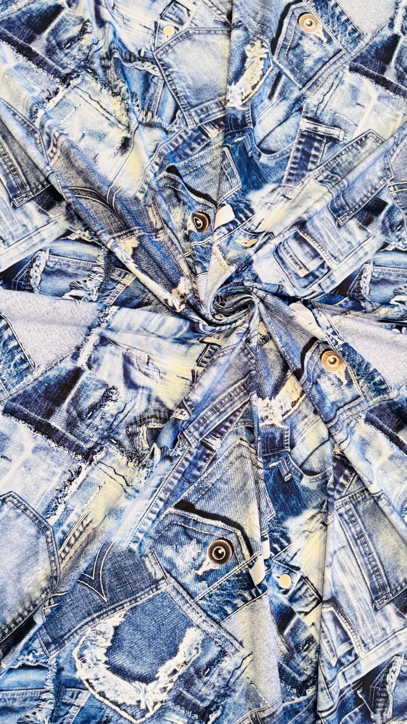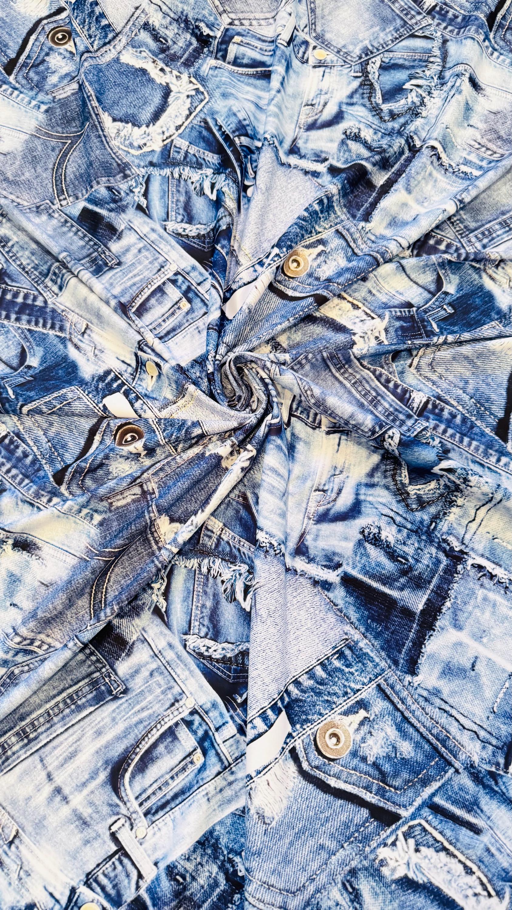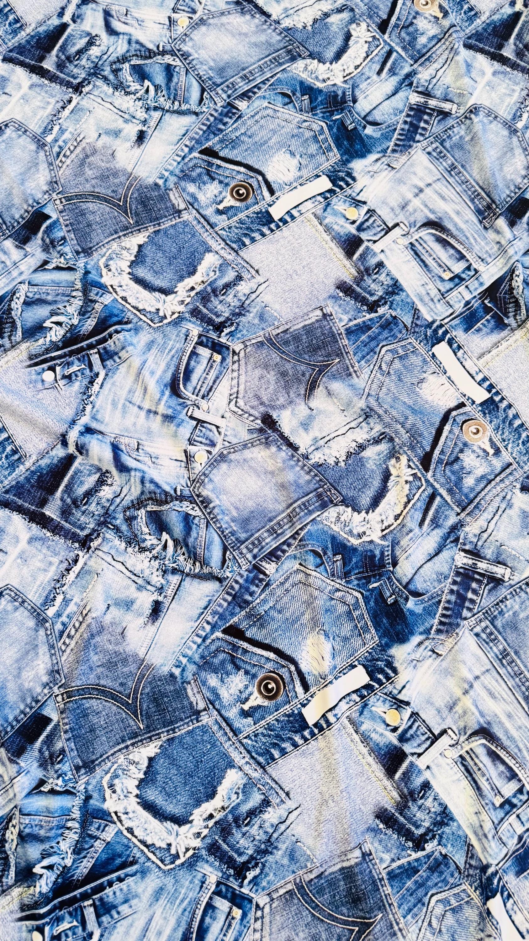 Denim Jeans design print on great quality of Nylon spandex 4-way stretch 58/60” Sold by the YD. Ships worldwide from Los Angeles California USA