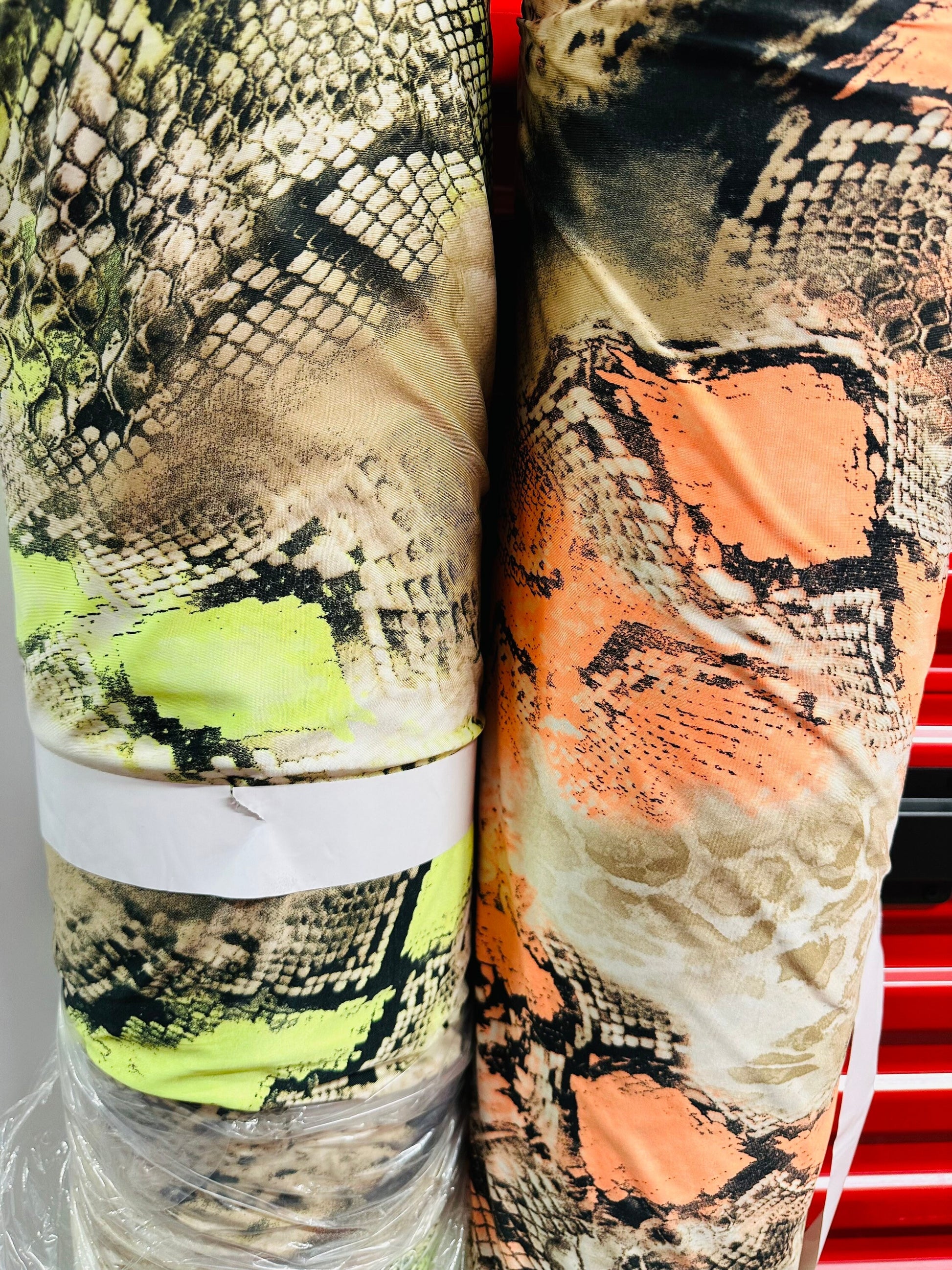 Exotic Cobra snake design Taupe/Neon Orange & Taupe/Neon green print on great quality of poly spandex light weight 4-way stretch 58/60” Sold by the YD. Ships worldwide from Los Angeles California USA