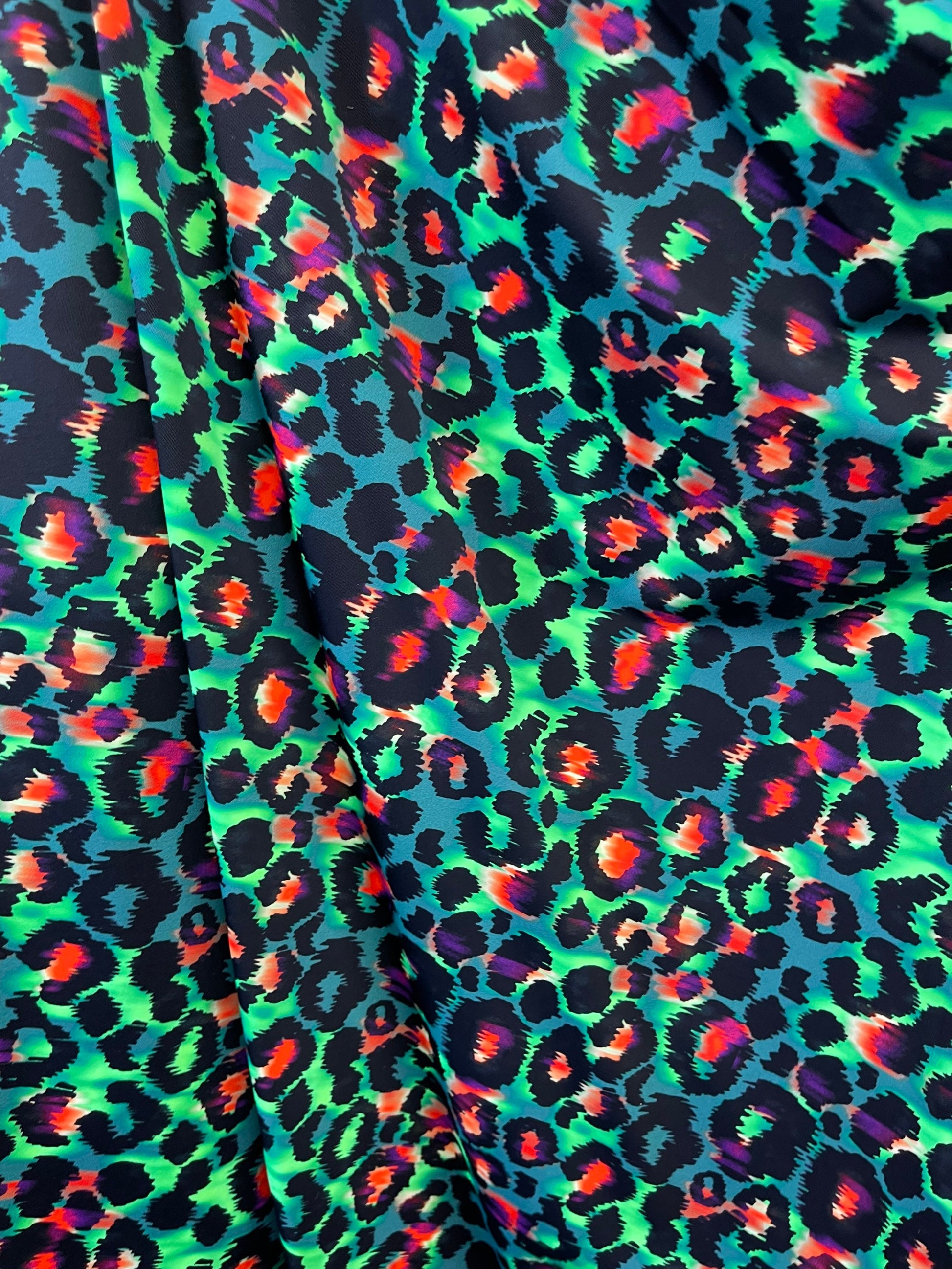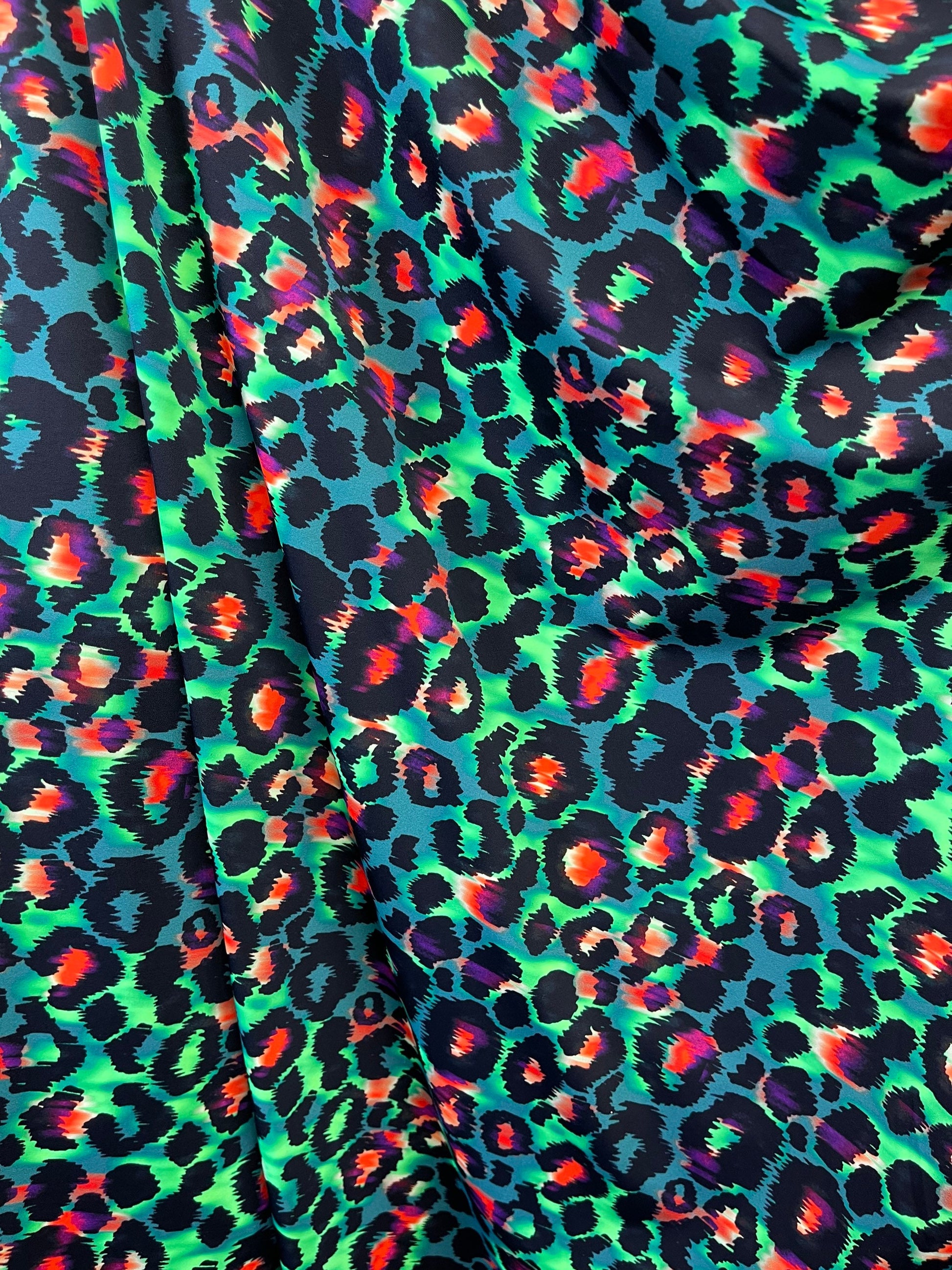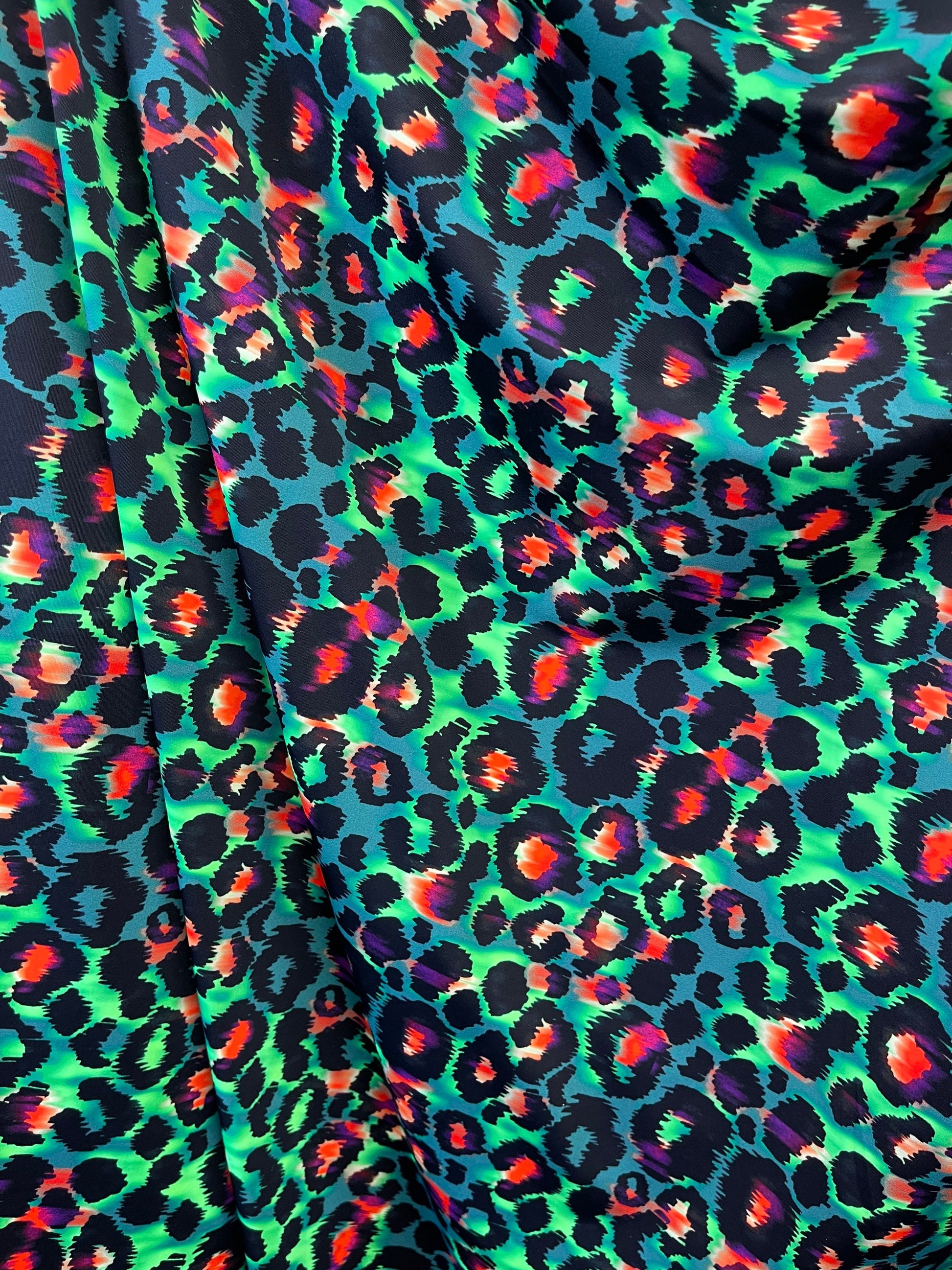 Exotic Leopard design green/multicolor print on best quality of nylon spandex 4-way stretch 58/60” Sold by the YD. Ships Worldwide from Los Angeles California USA.