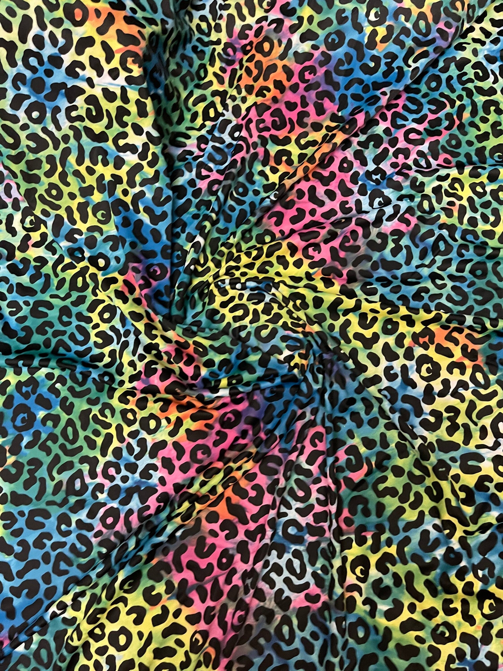 Exotic leopard design print on tie dye nylon spandex 4-way stretch 58/60” Sold by the YD. Ships Worldwide from Los Angeles California USA.