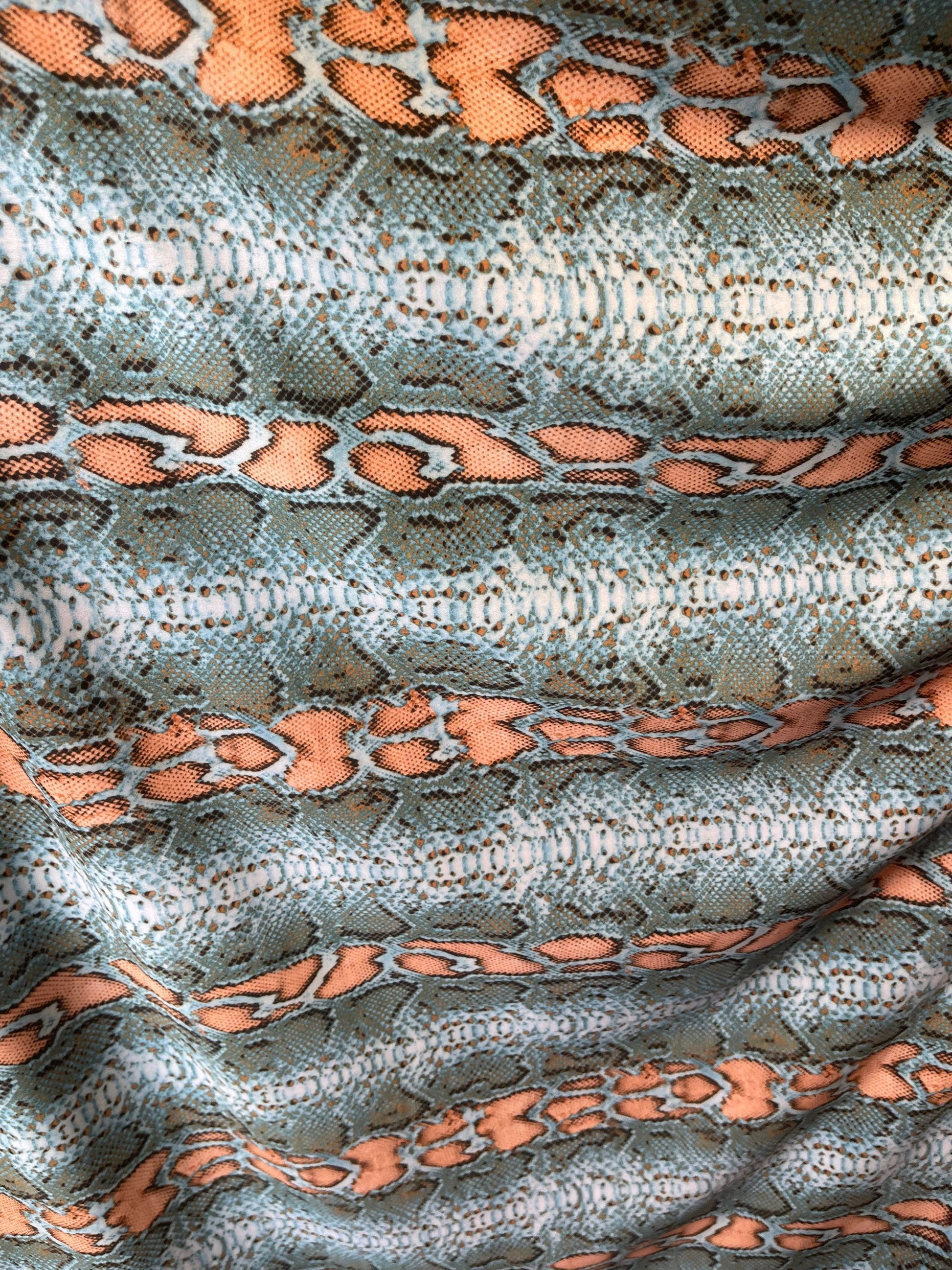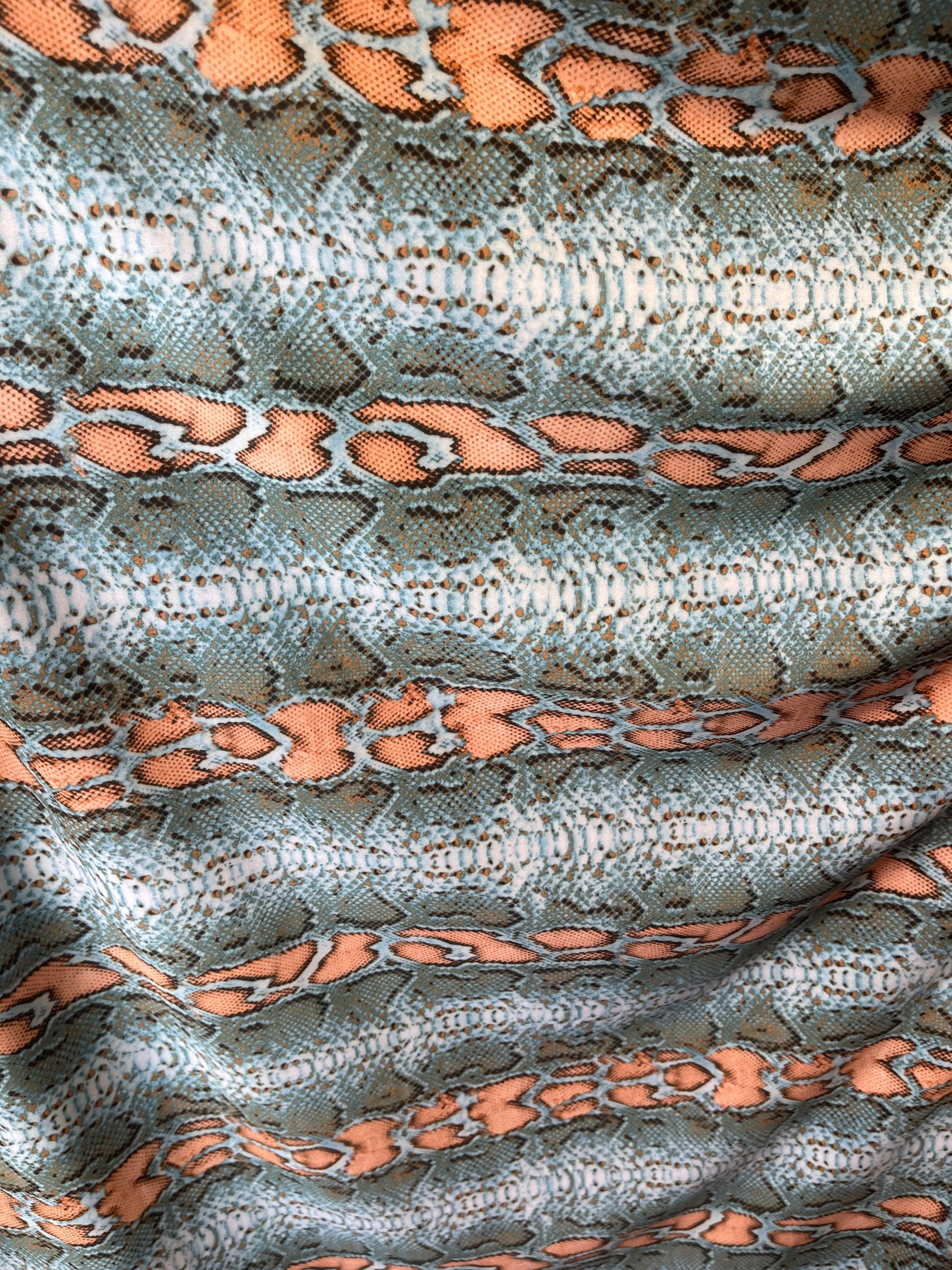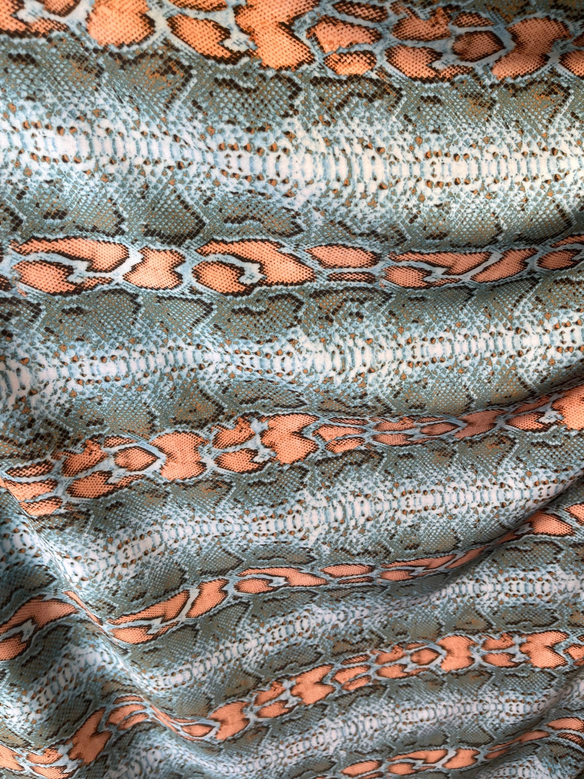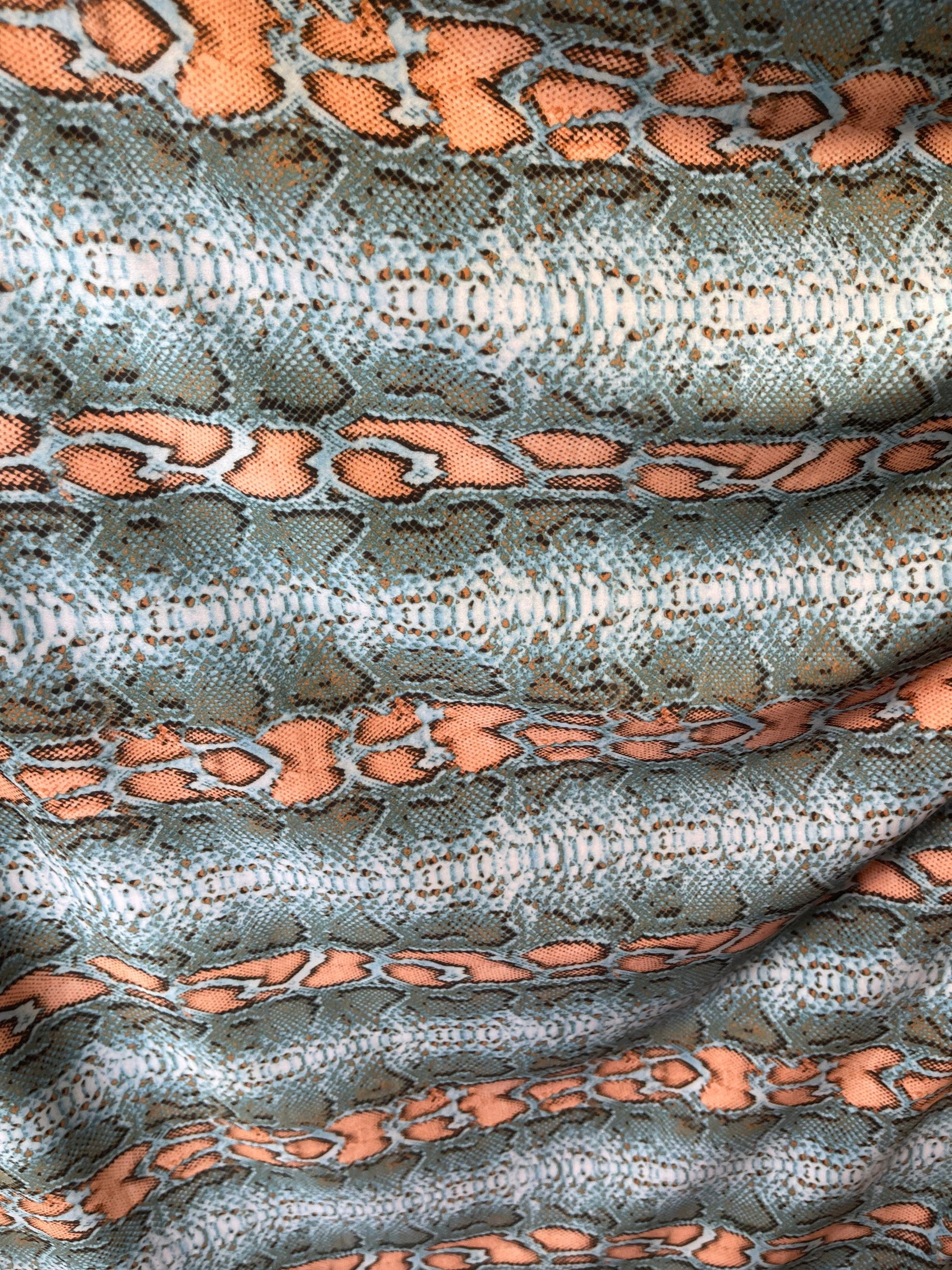 Exotic snake design Nude/Blue color print on best quality of nylon spandex 4-way stretch 58/60” Sold by the YD. Ships Worldwide from Los Angeles California USA.