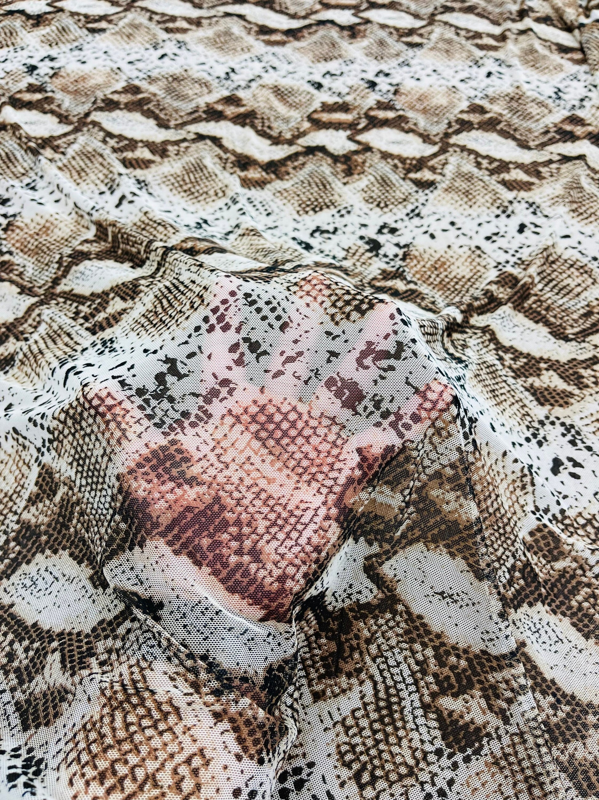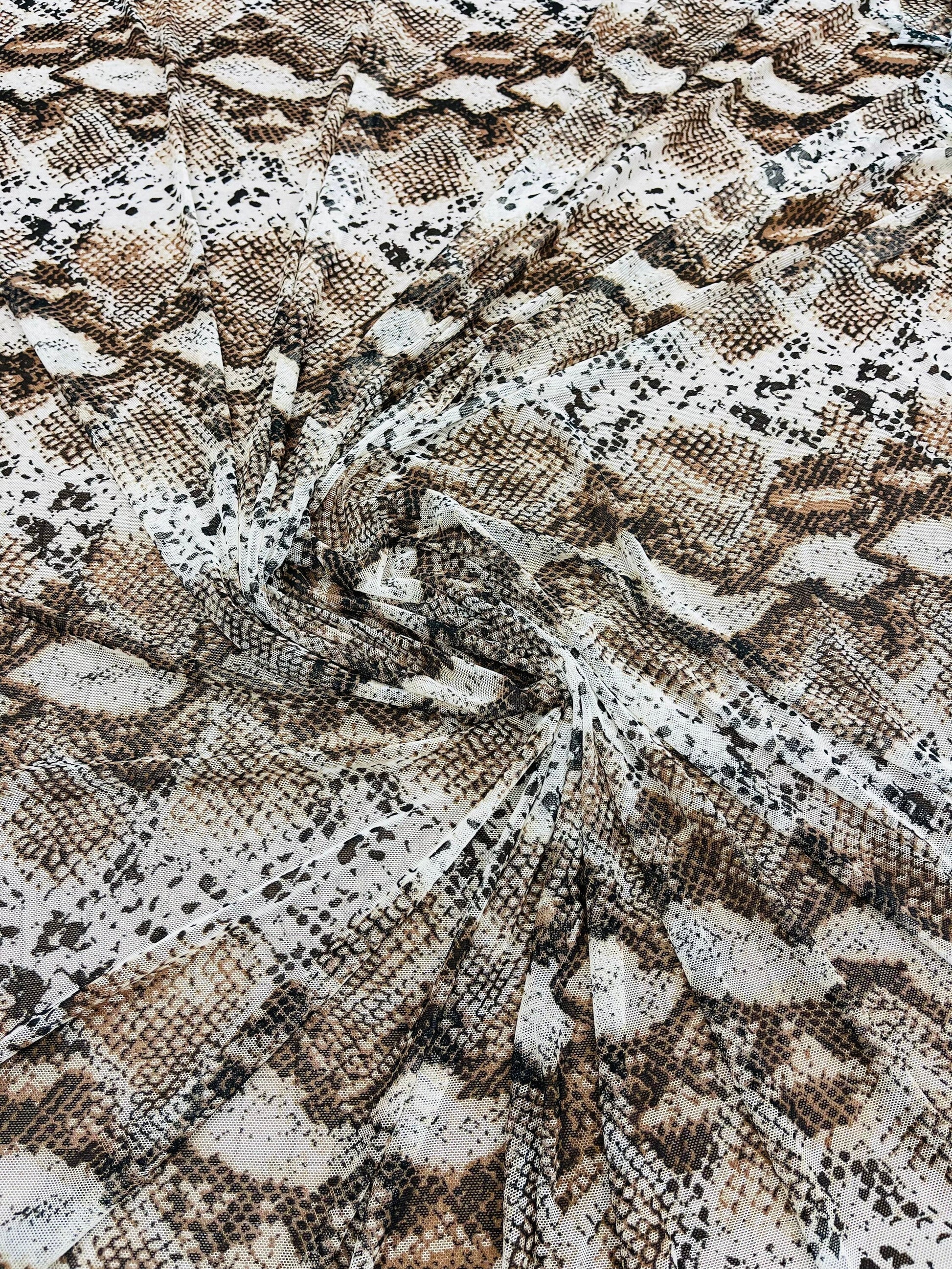 Exotic Snake design print of great quality of nylon power mesh 4-way stretch 58/60” Sold by the YD. Ships Worldwide from Los Angeles California USA.