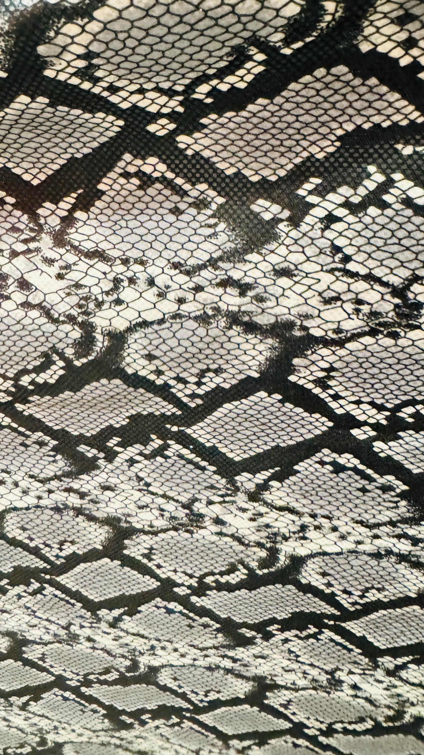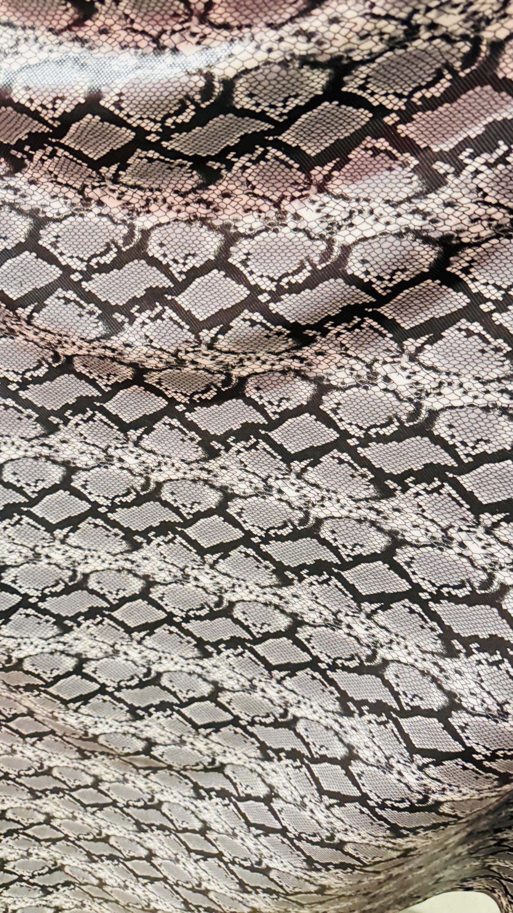 Exotic Snake design with clear foil on poly interlock 2way stretch 58/60” Sold by the YD. Ships worldwide from Los Angeles California USA. High quality fabrics by AlexLAFabrics