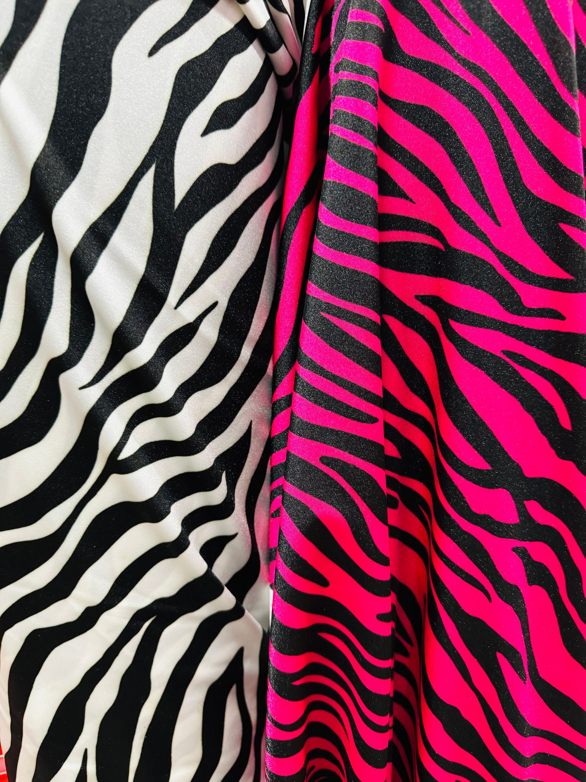Exotic zebra design Fuchsia/black print on best quality shiny nylon spandex 4-way stretch 58/60” Sold by the YD. Ships worldwide from Los Angeles California USA. High quality fabrics by AlexLAFabrics