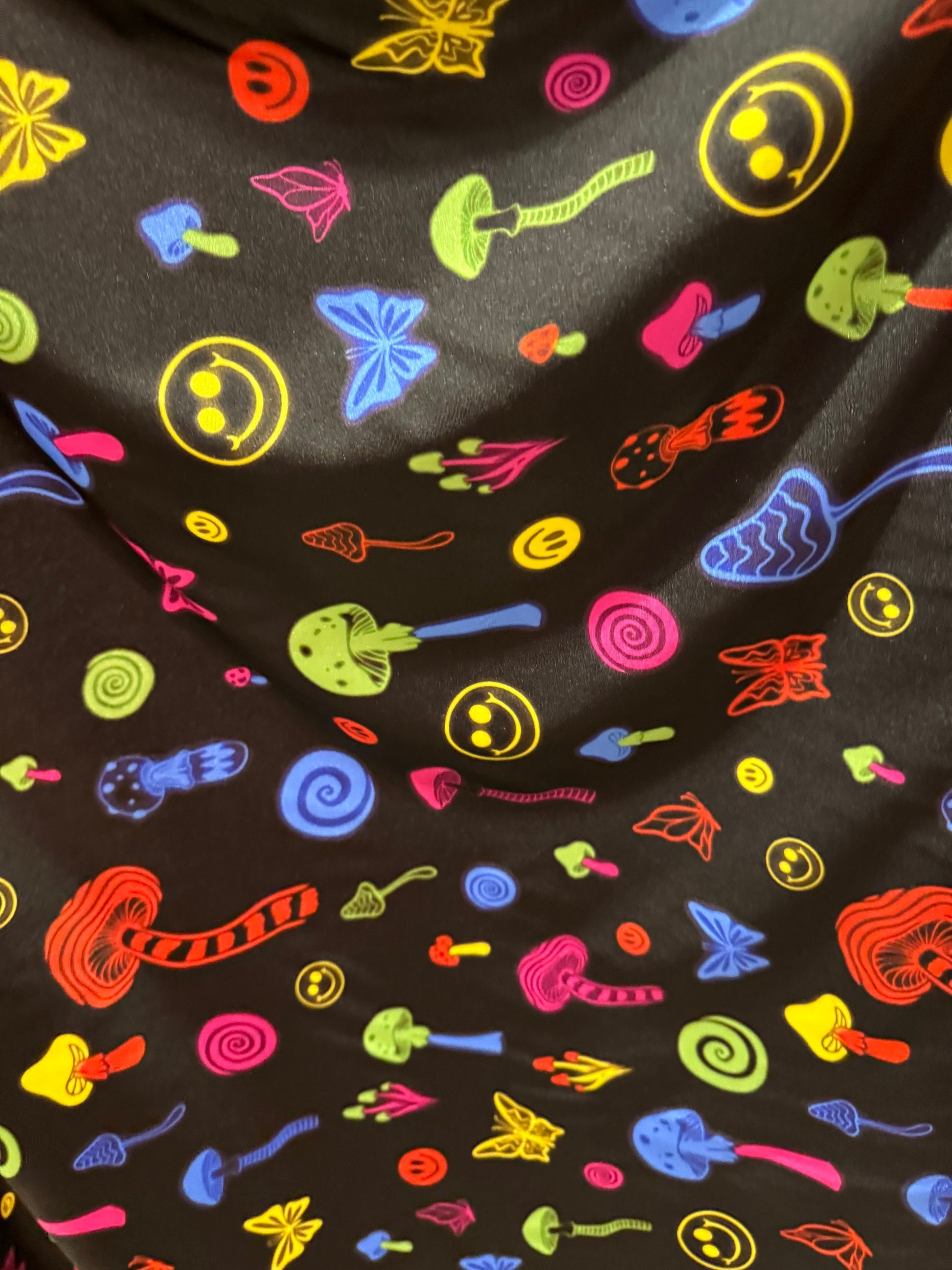 Fantastic mushrooms design black/multicolor print on great quality of nylon spandex 4-way stretch 58/60” Sold by the YD. Ships worldwide from Los Angeles California USA