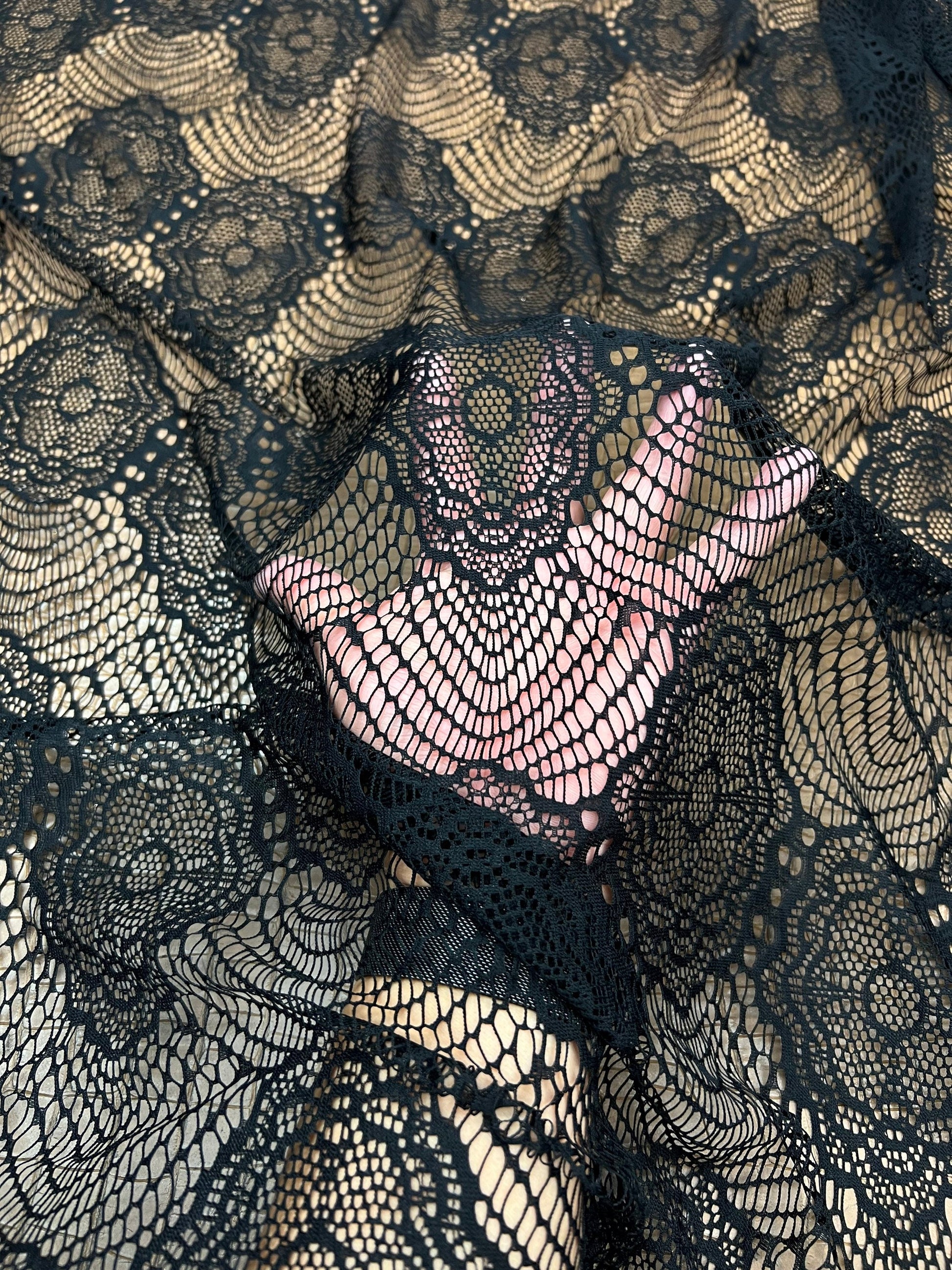 France black lace fine quality of stretch lace 2-way stretch 55/57” Sold by the YD. Ships Worldwide from Los Angeles California USA