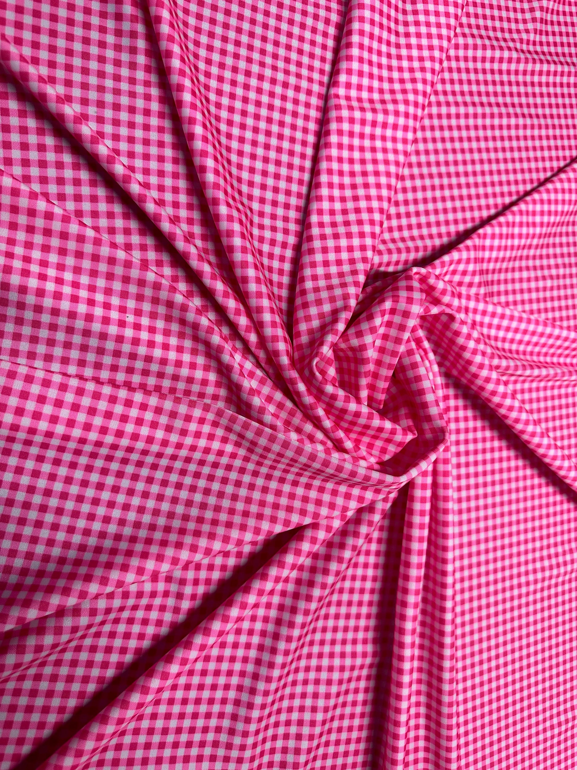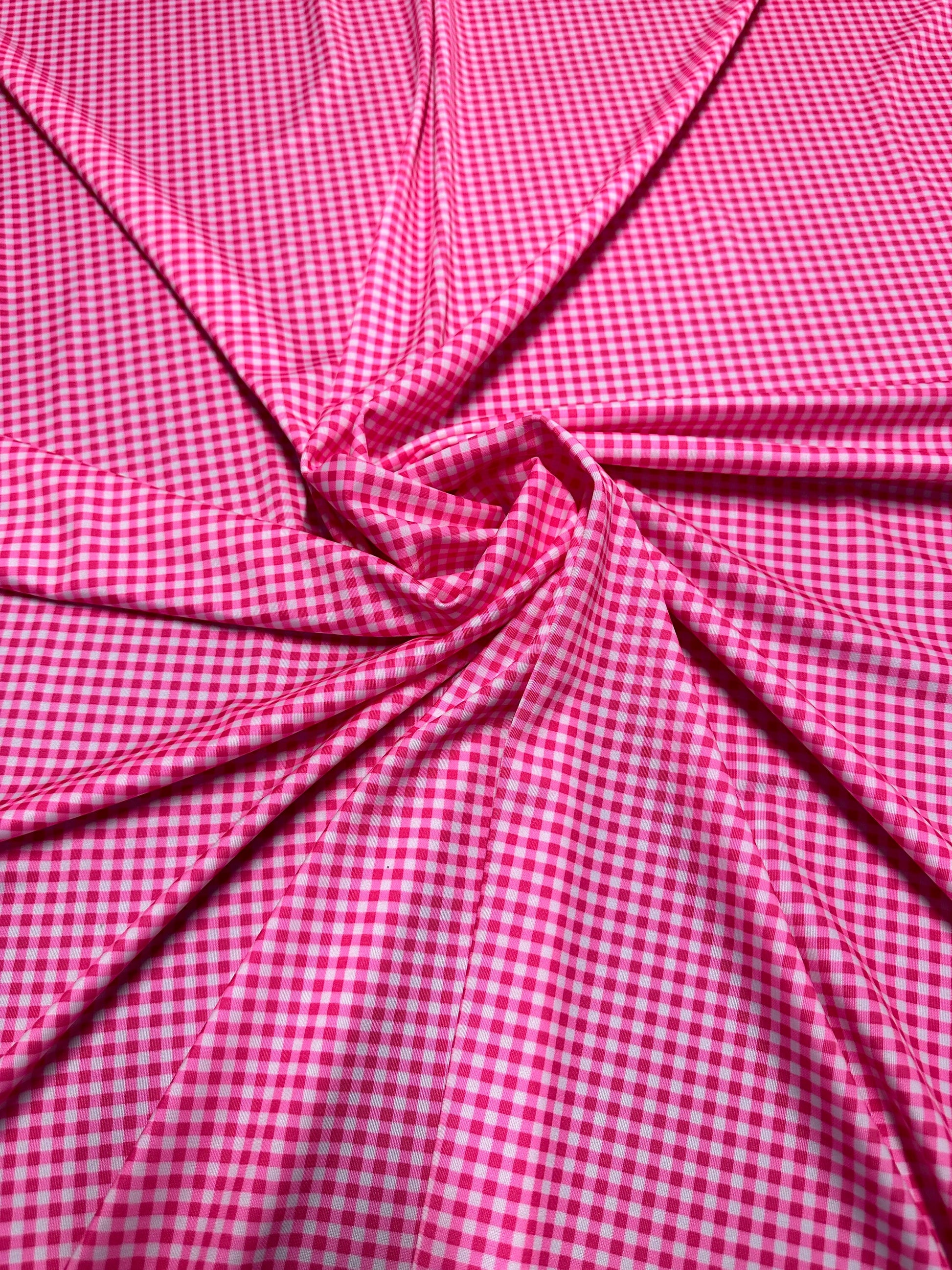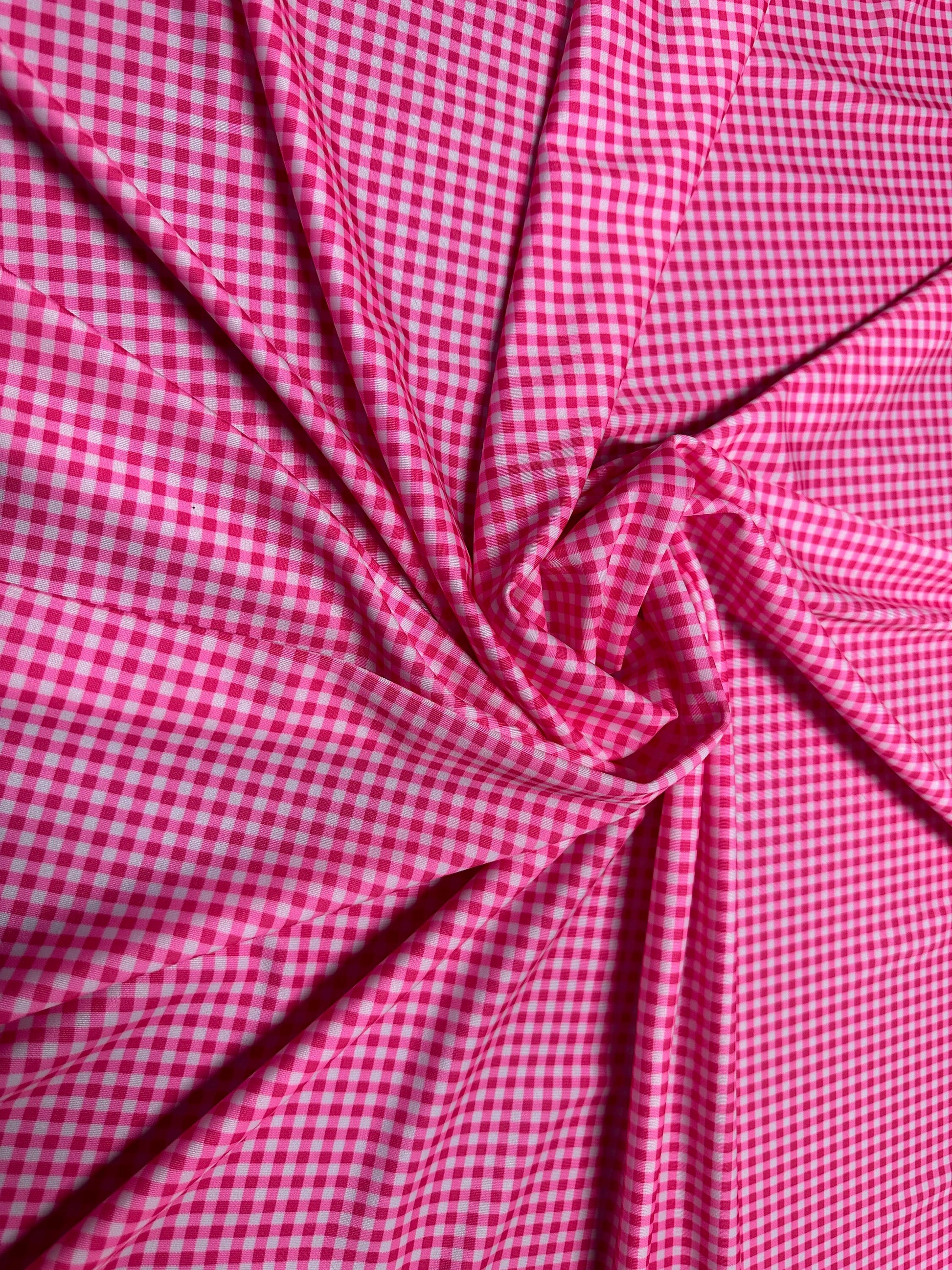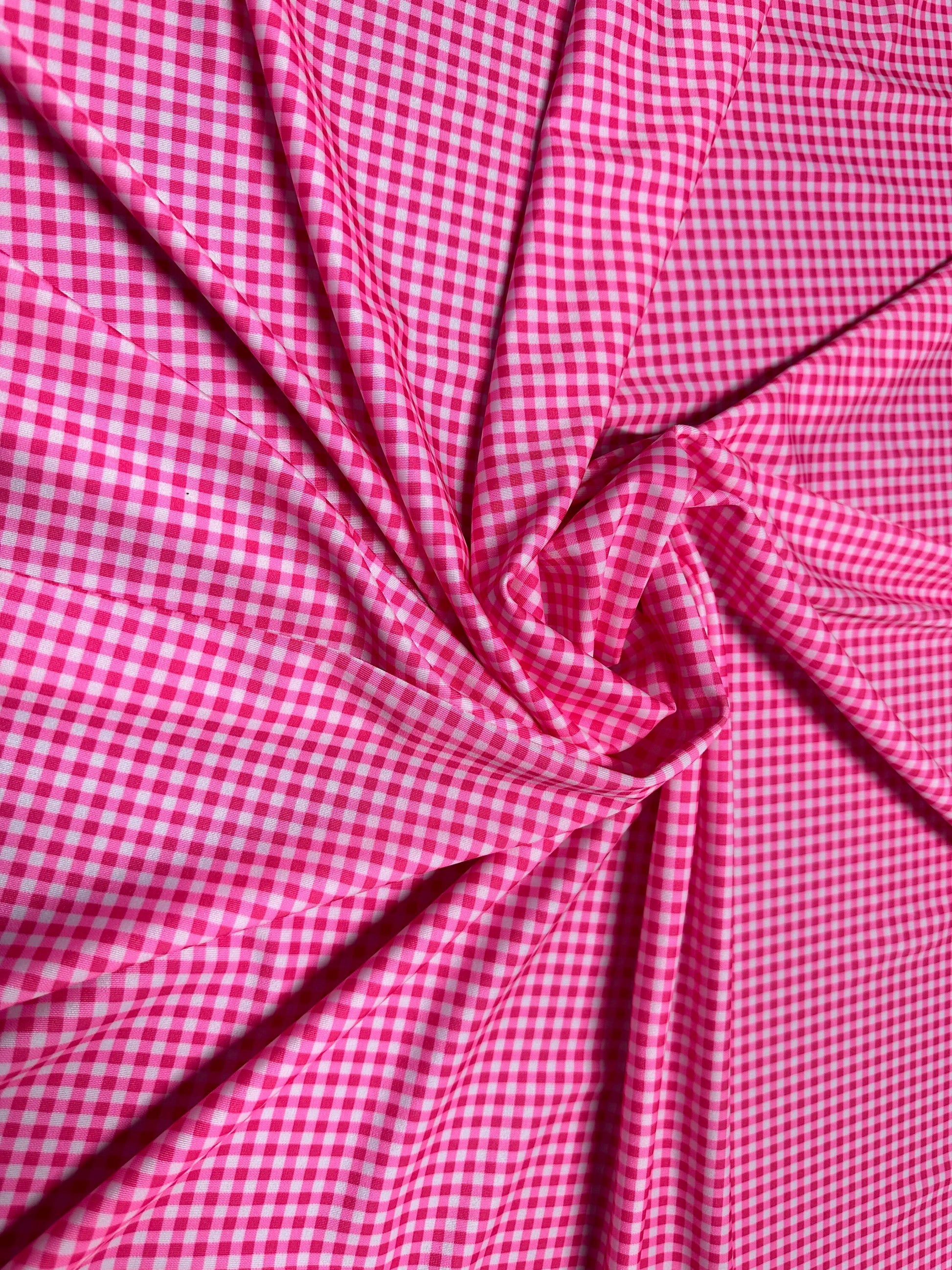 Gingham design 1/4” Hot pink color print on great quality of nylon spandex 4-way stretch 58/60”