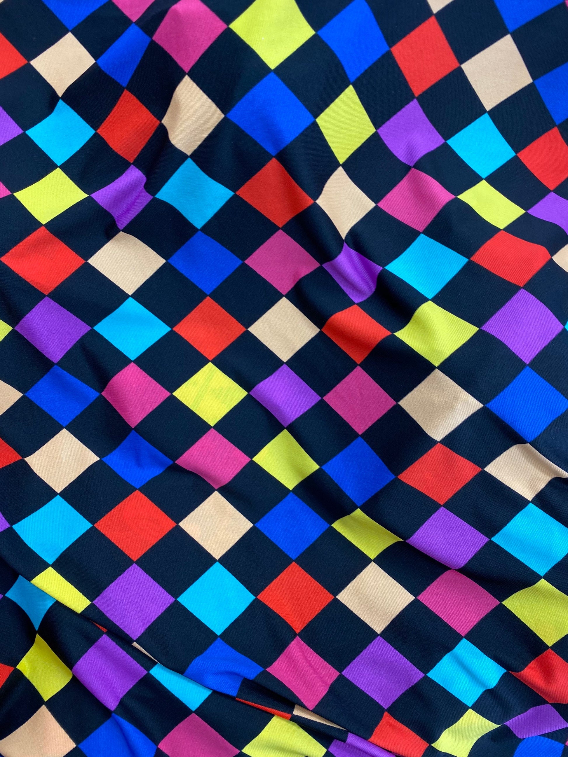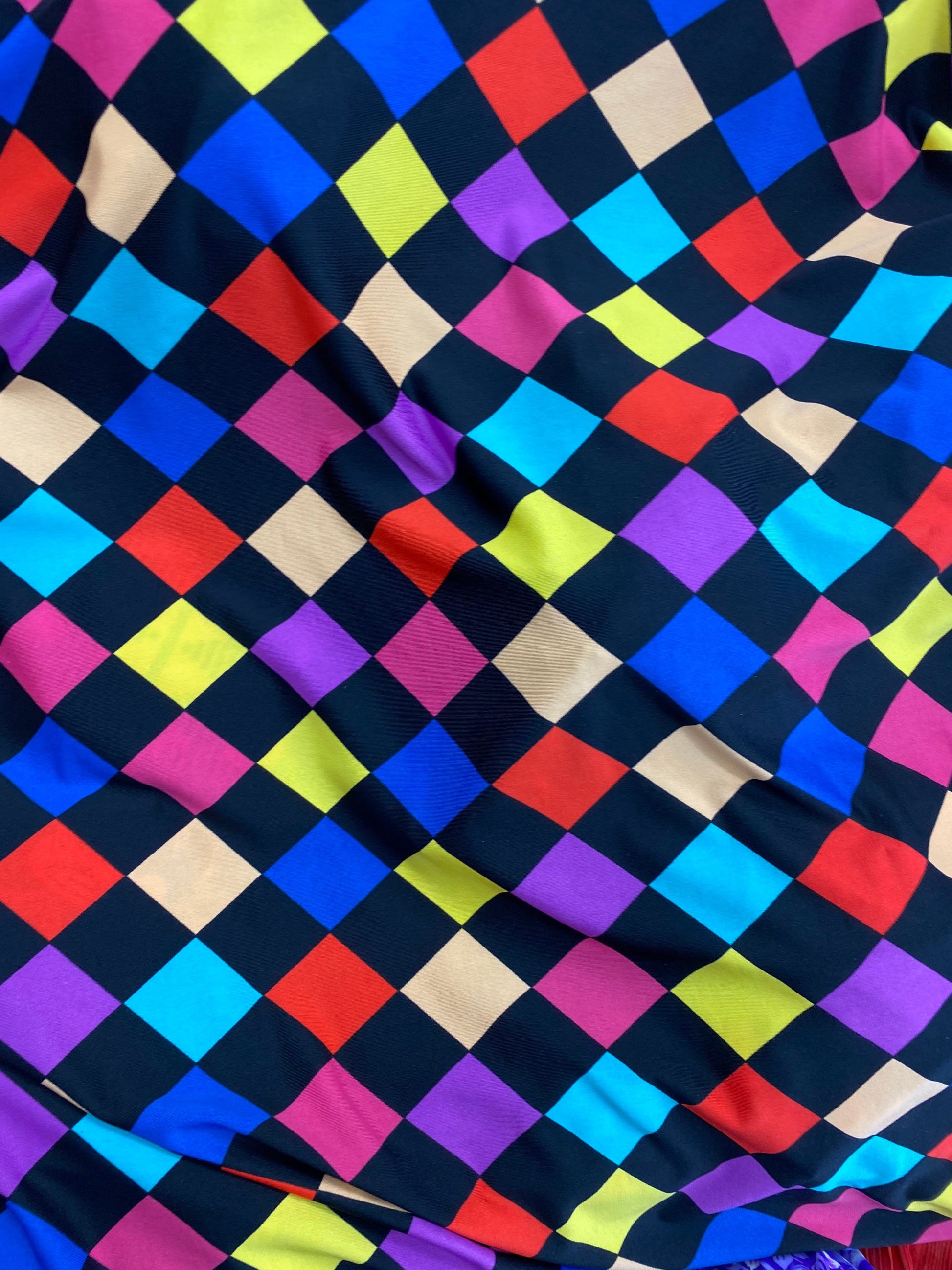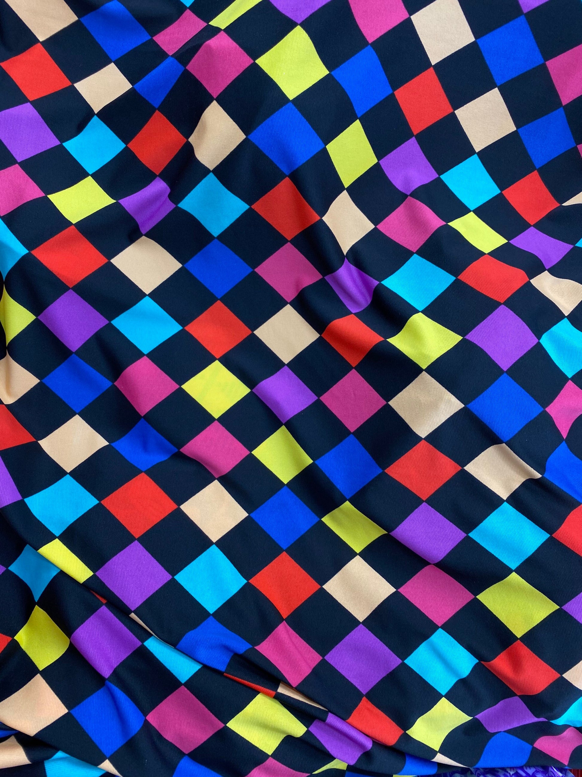 Harley Quinn design multicolor print on poly spandex medium weight 4-way stretch 58/60” Sold by the YD. Ships worldwide from Los Angeles CA