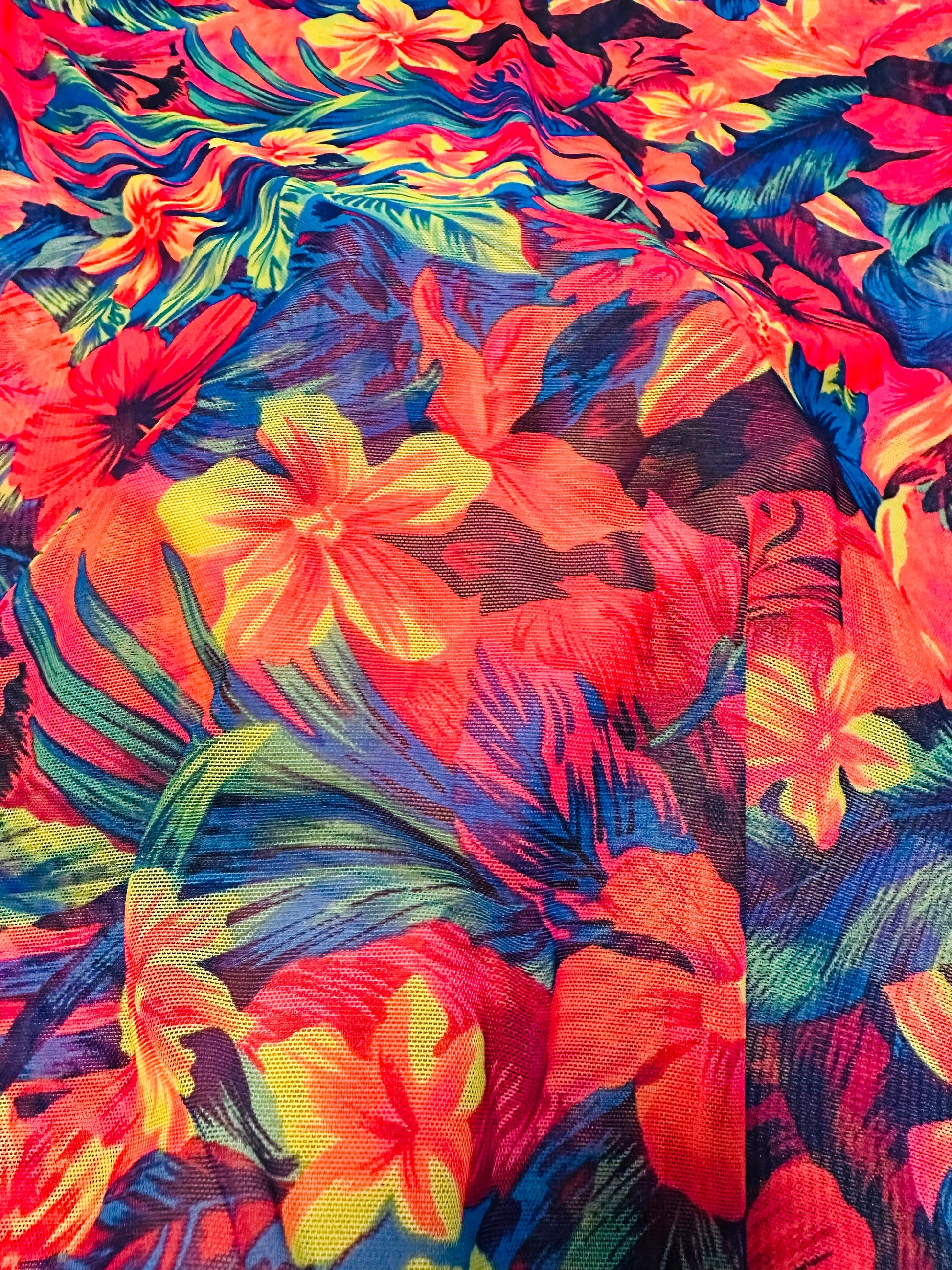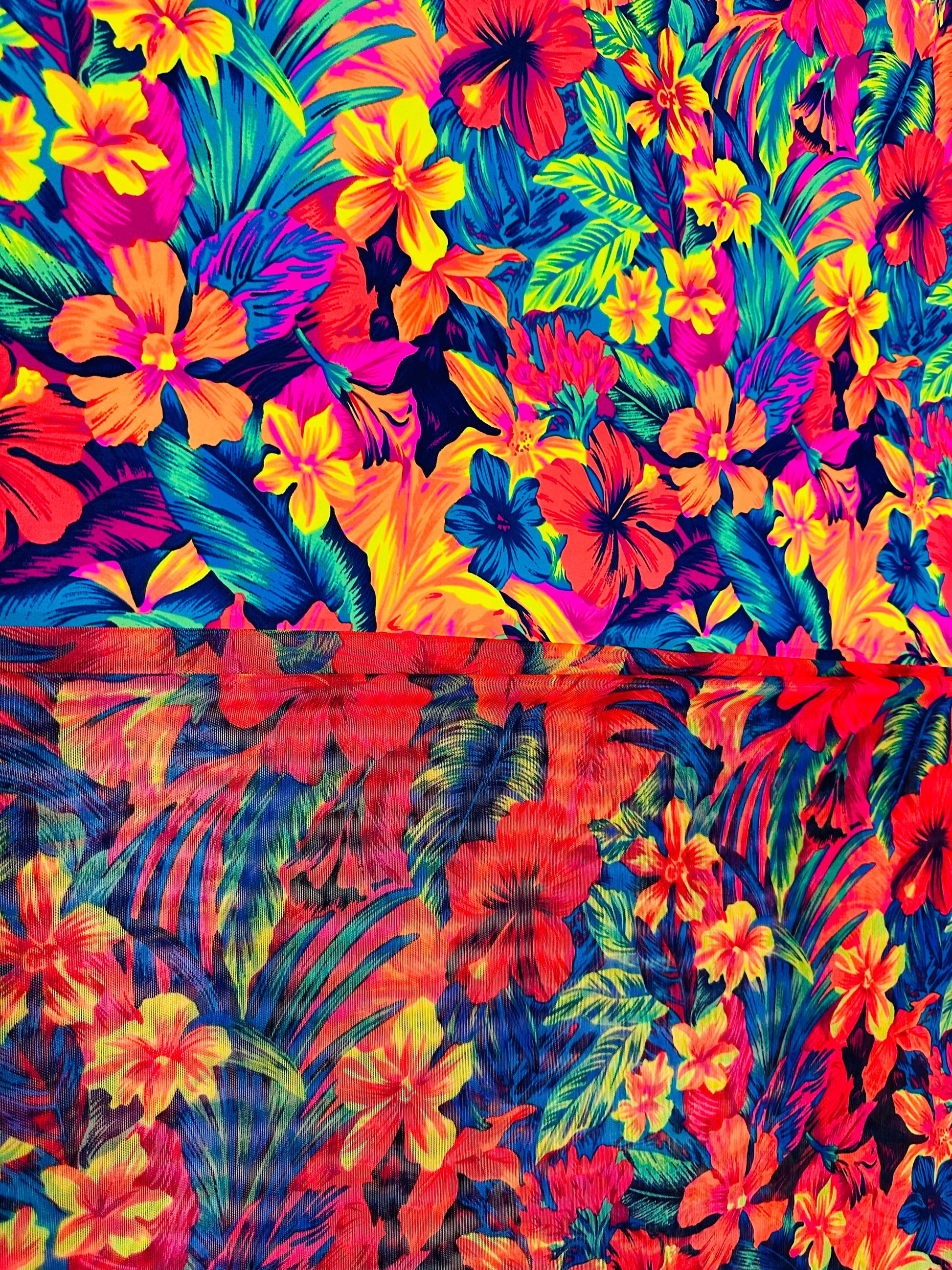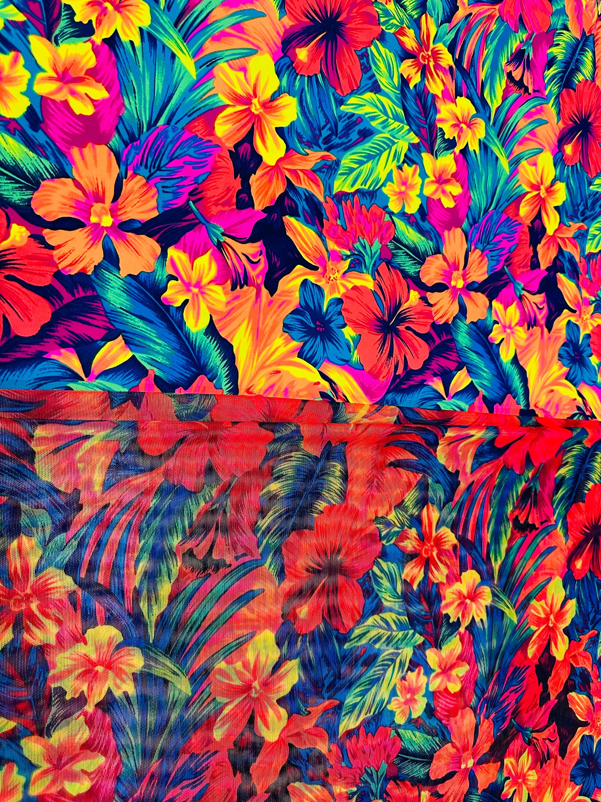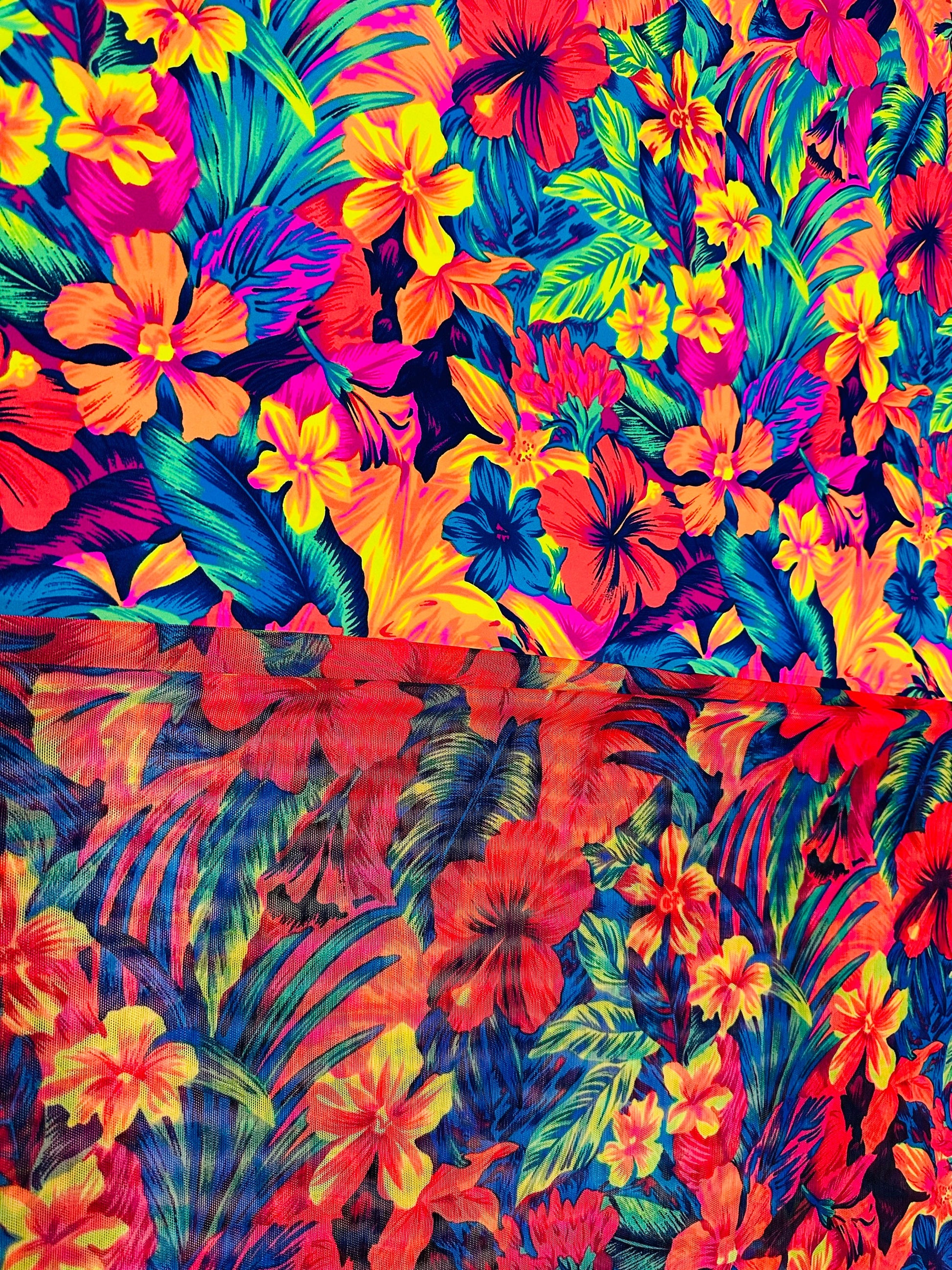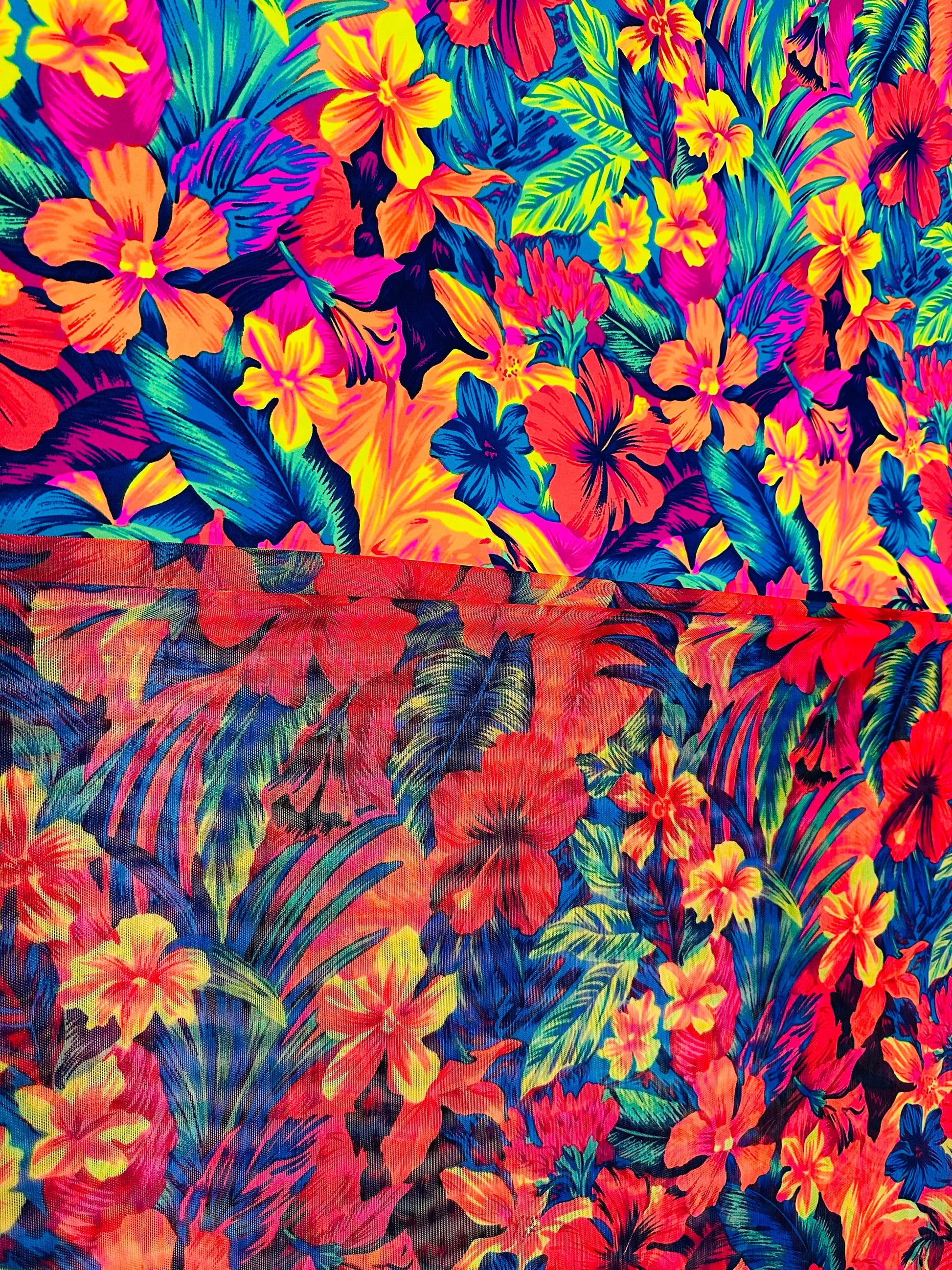 Hawaiian design colorful with bright colors print on nylon spandex and power mesh best quality 4-way stretch 58/60” Sold by the YD. Ships worldwide from Los Angeles California USA