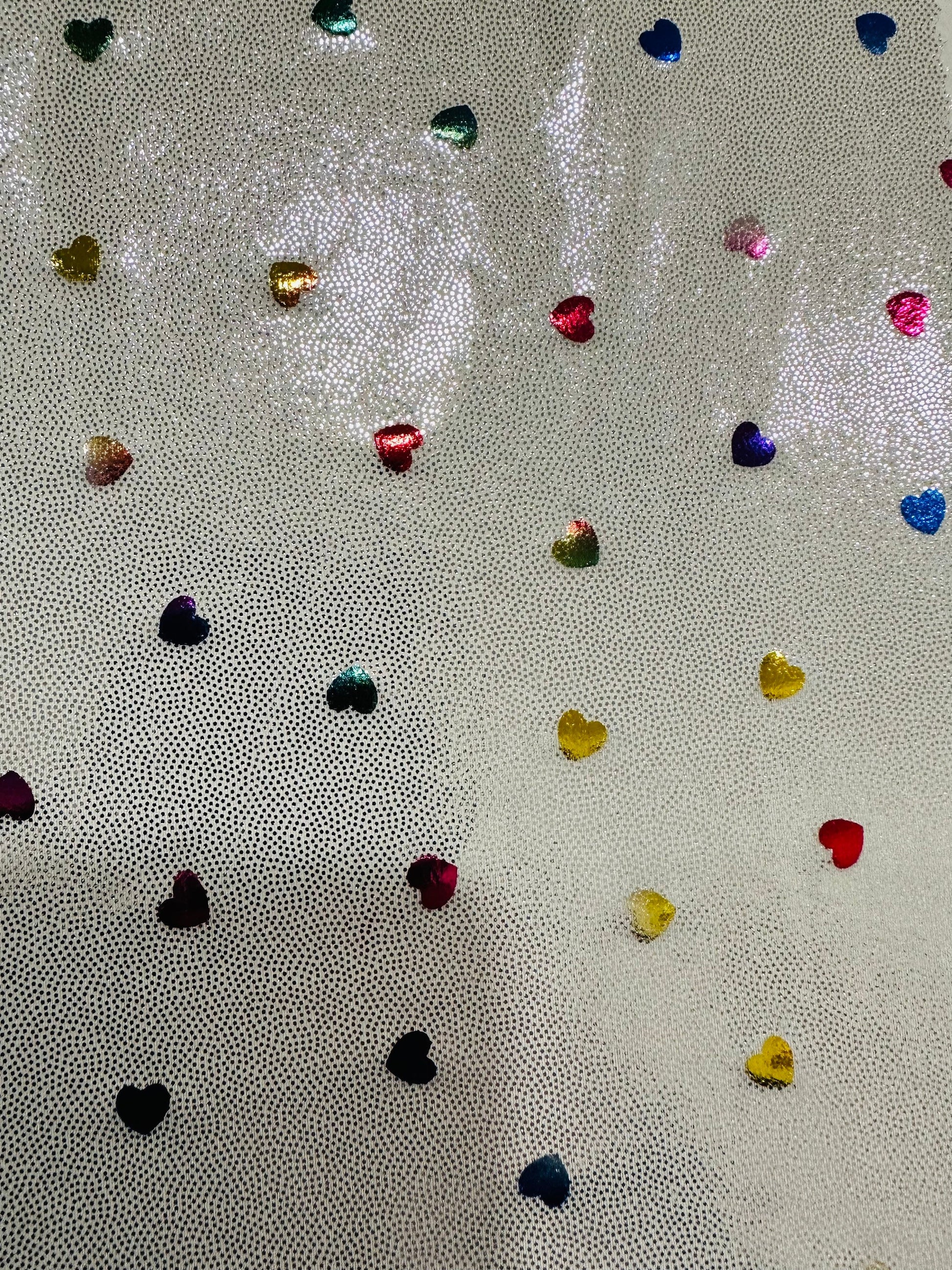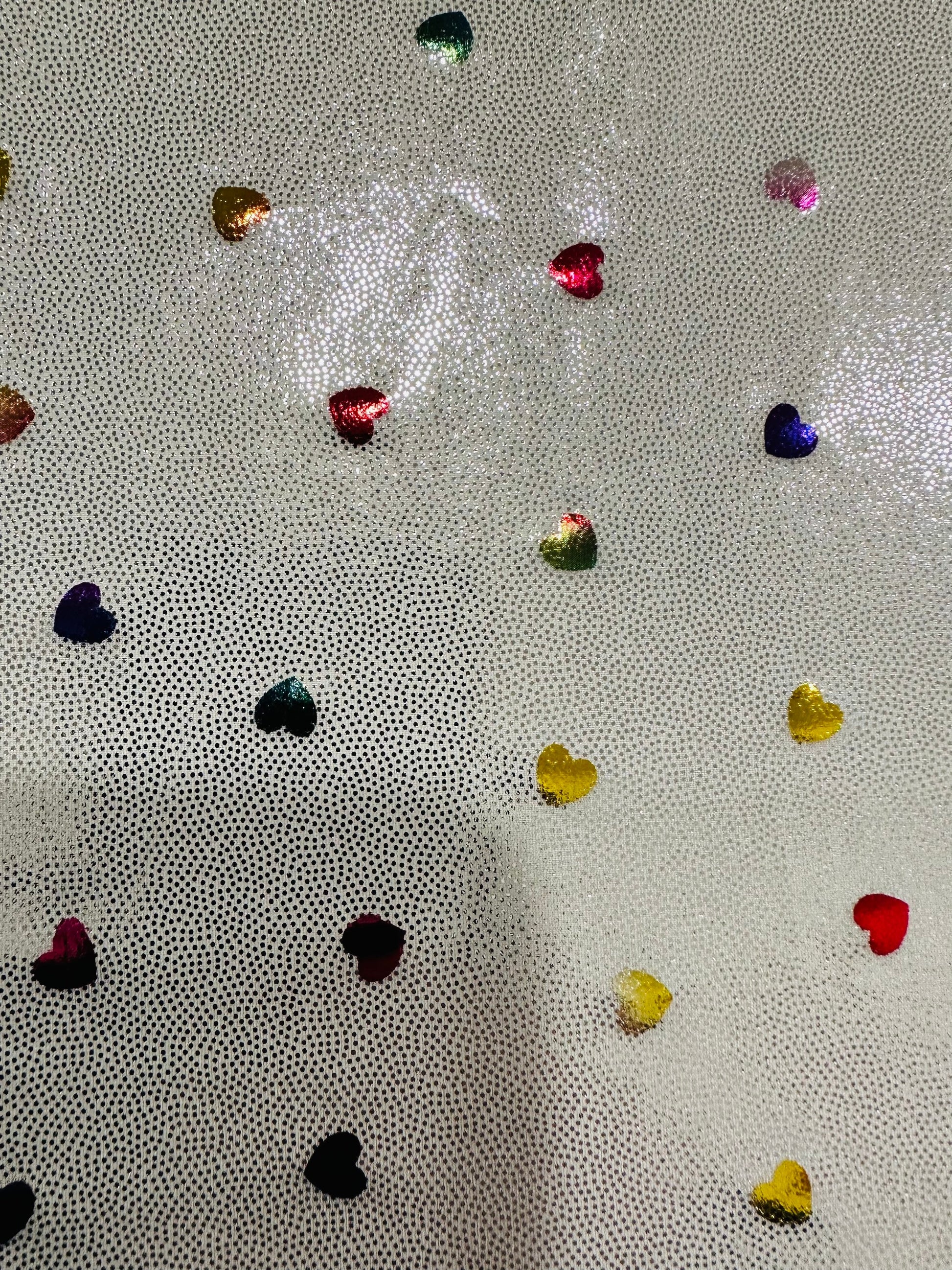 Hearts design metallic hologram nylon spandex W/Silver multicolor 4-way stretch spandex 58/60” Sold by the YD. Ships worldwide from Los Angeles California USA