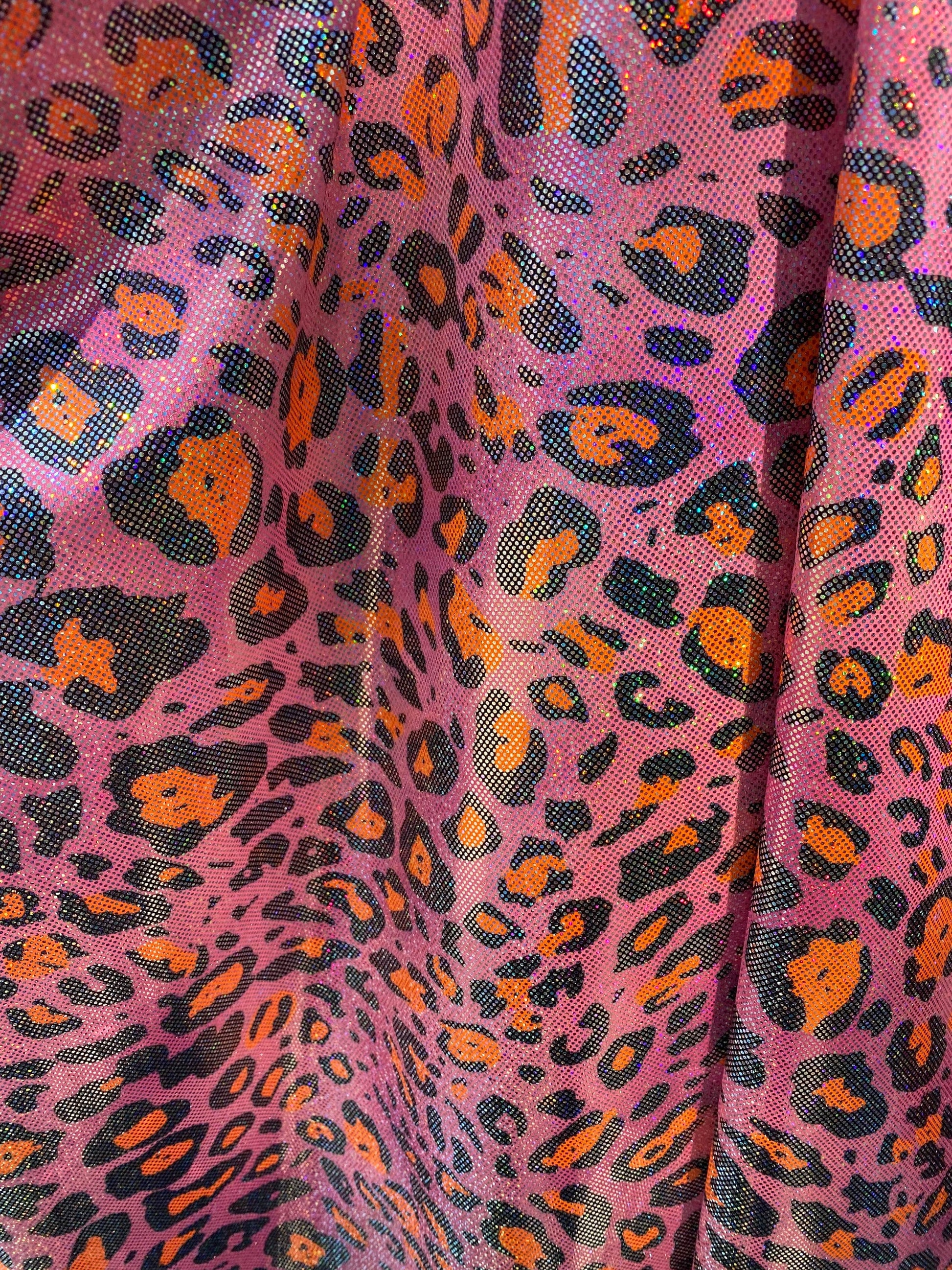 Hologram exotic leopard design metallic nylon spandex 4-way stretch 58/60” Sold by the YD. Ships worldwide from Los Angeles California USA.
